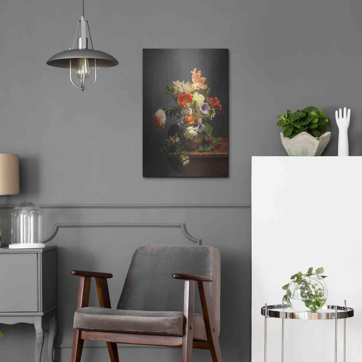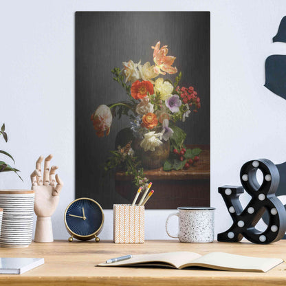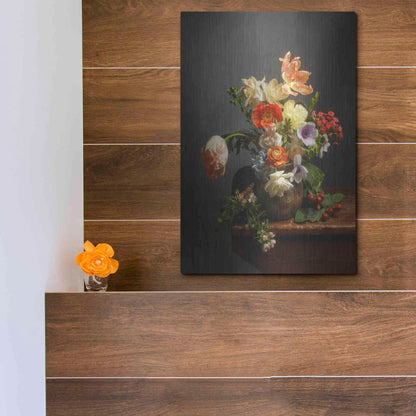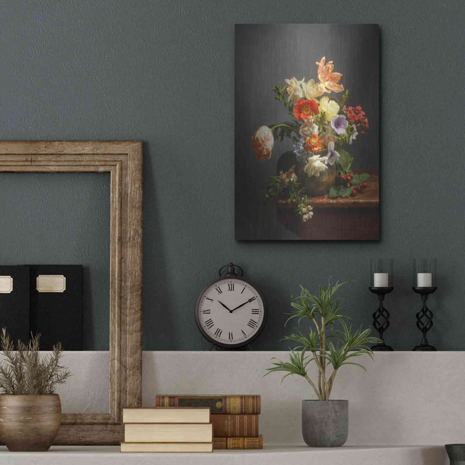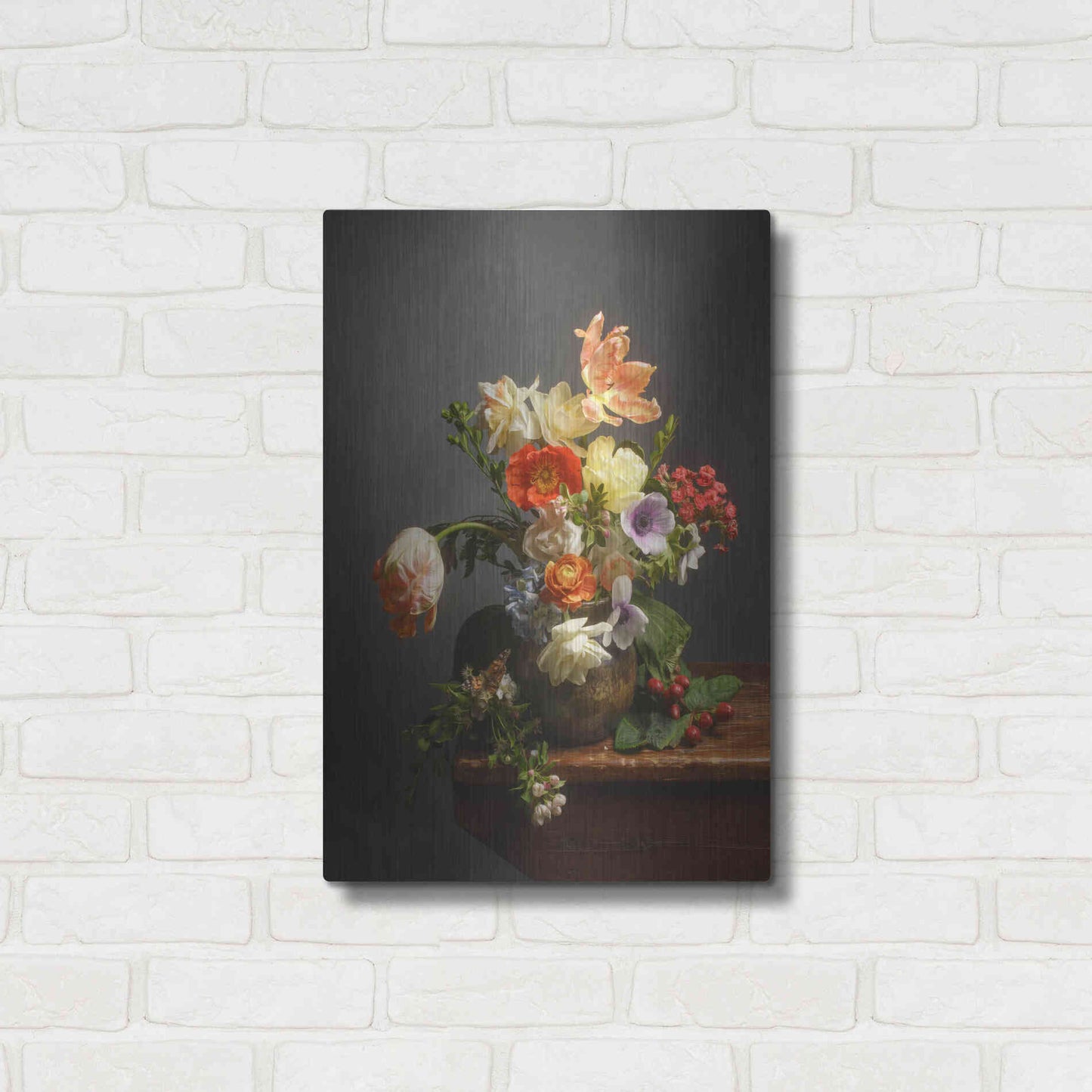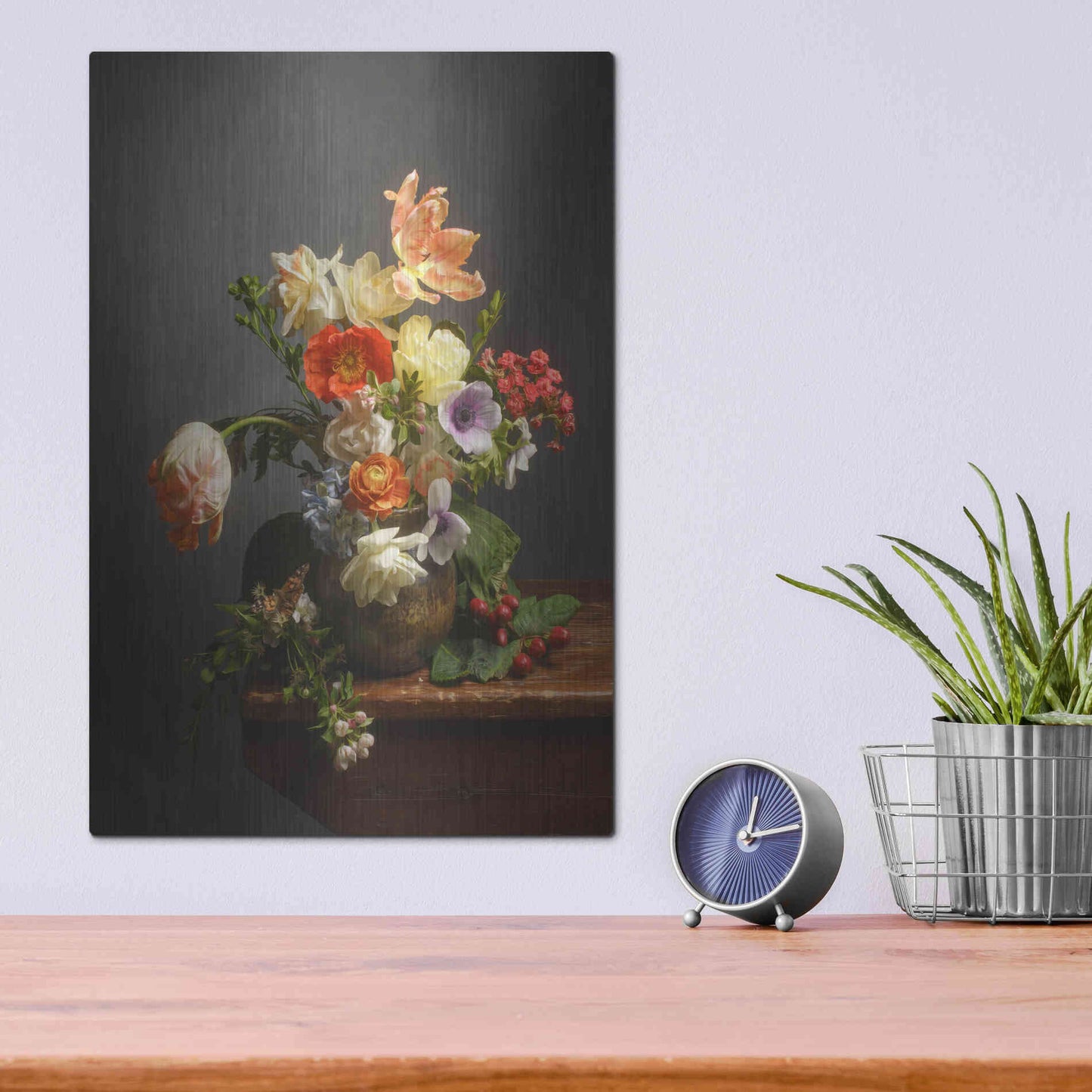 A Study On Tulips' by Leah McLean Metal Wall Art. A dutch golden age inspired still life image featuring poppies, tulips, and other flowers on a wooden table