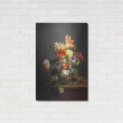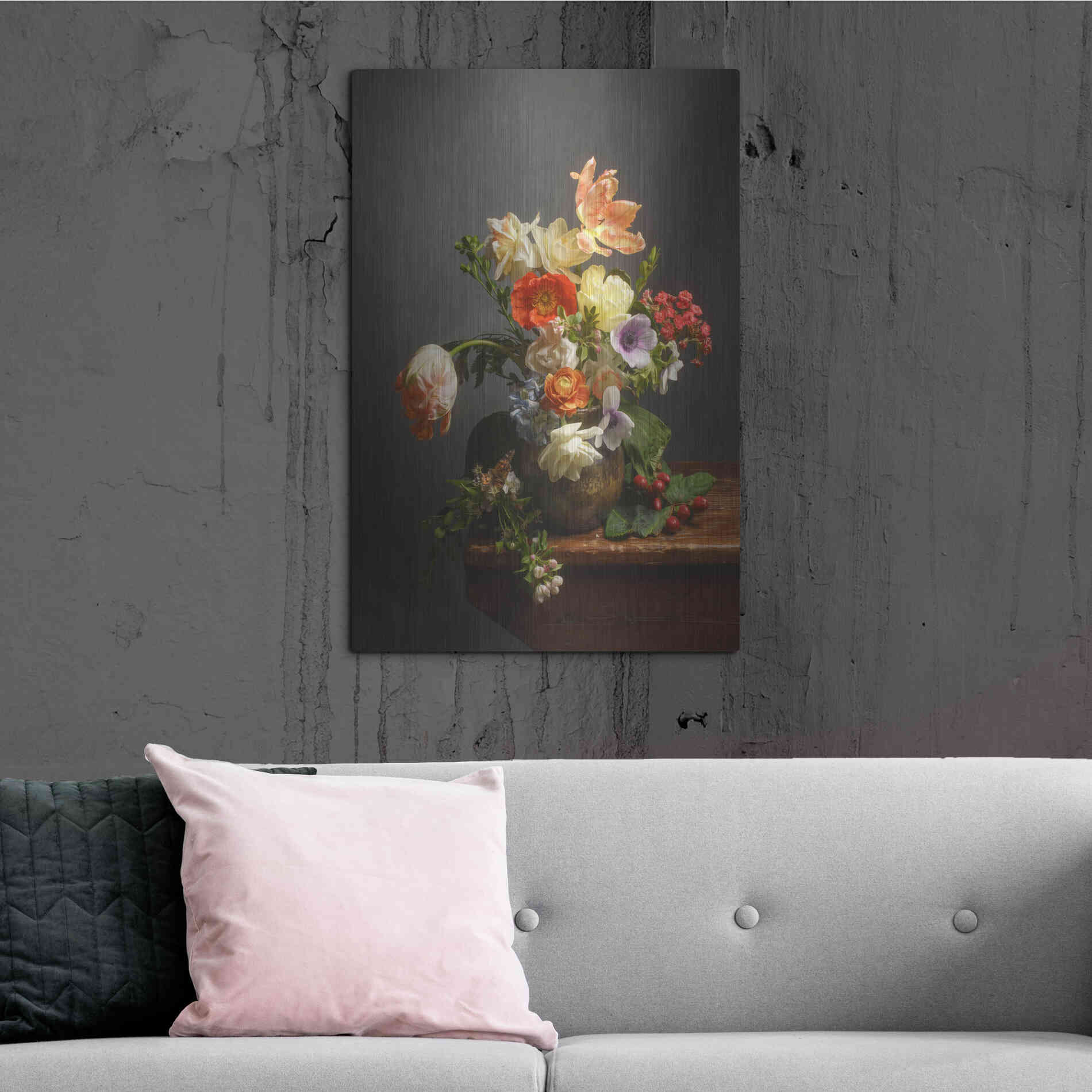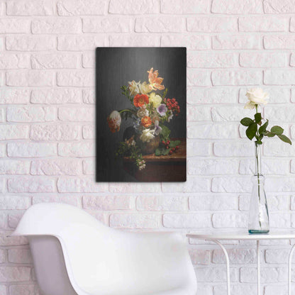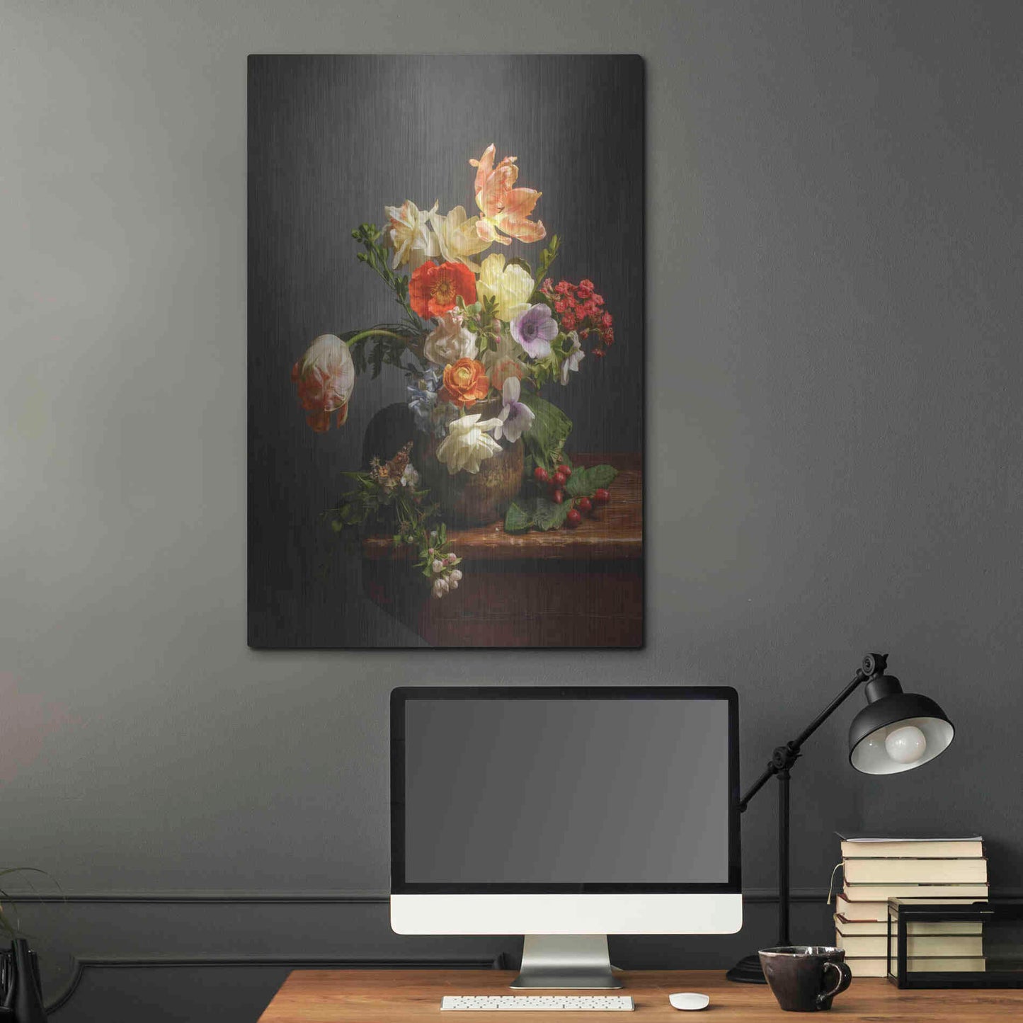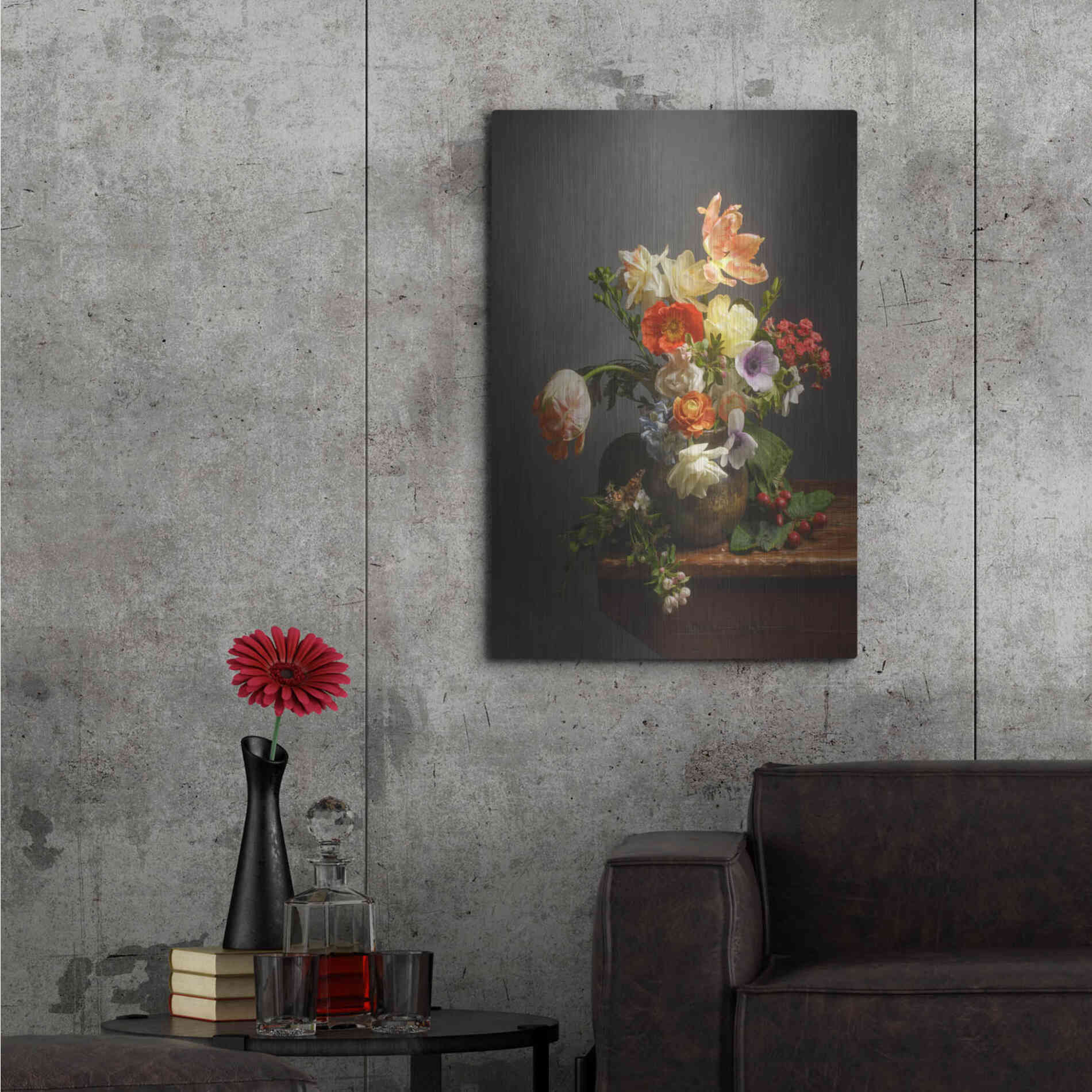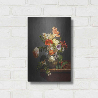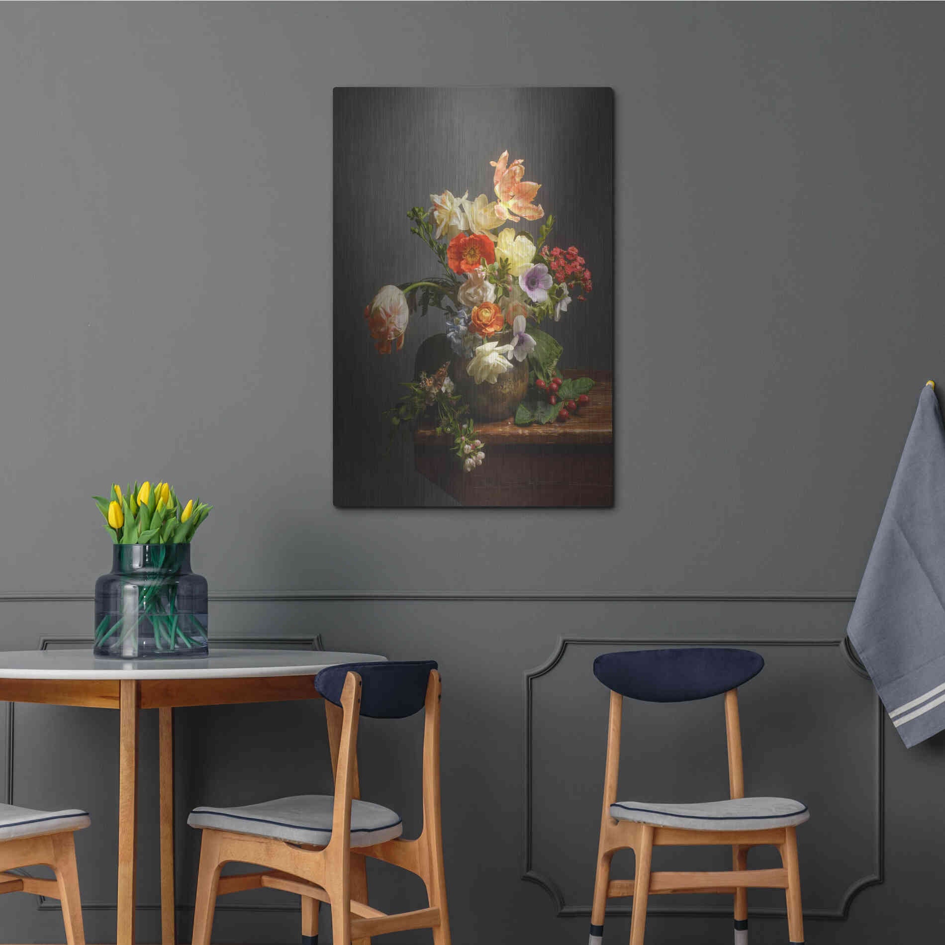 A Study On Tulips' by Leah McLean Metal Wall Art. A dutch golden age inspired still life image featuring poppies, tulips, and other flowers on a wooden table