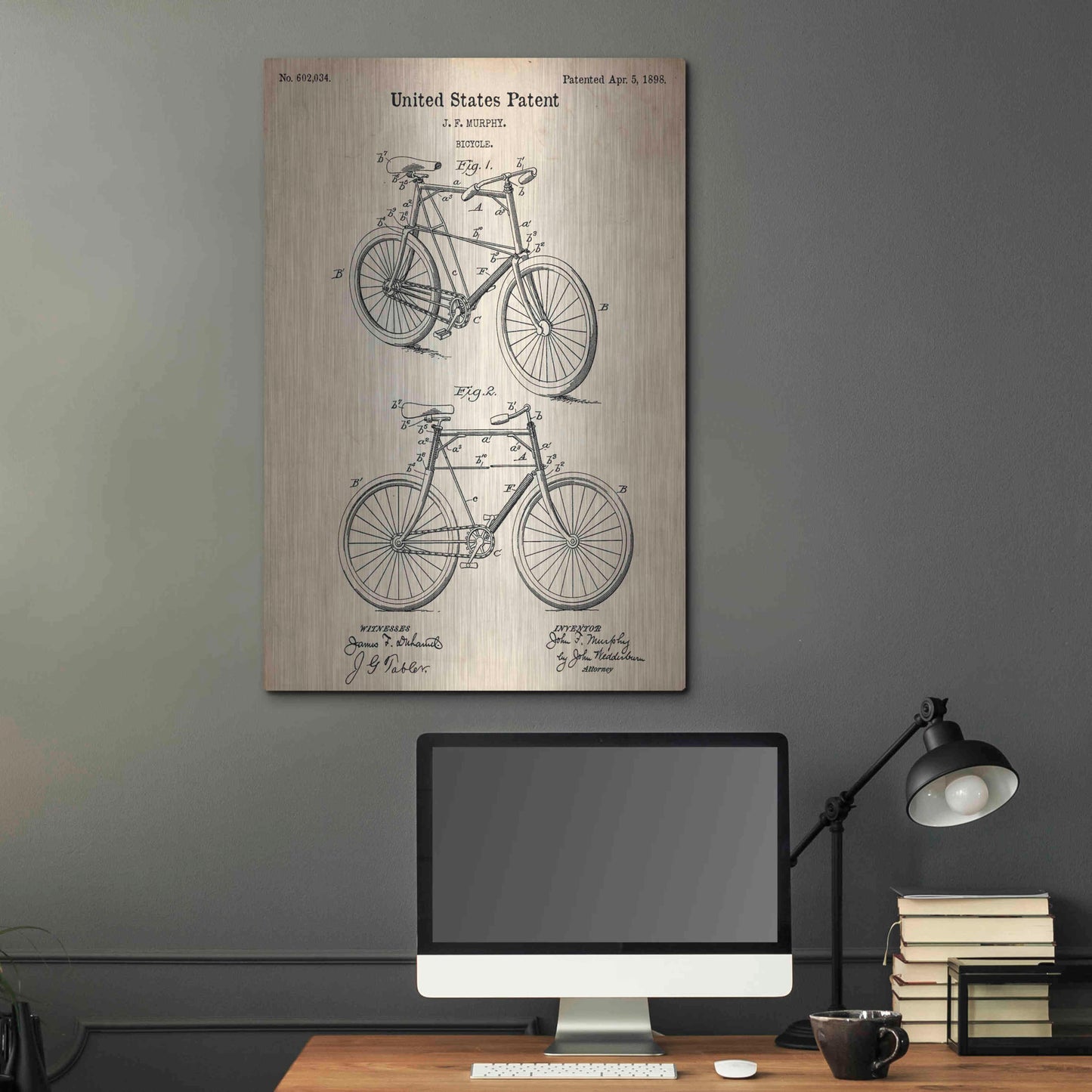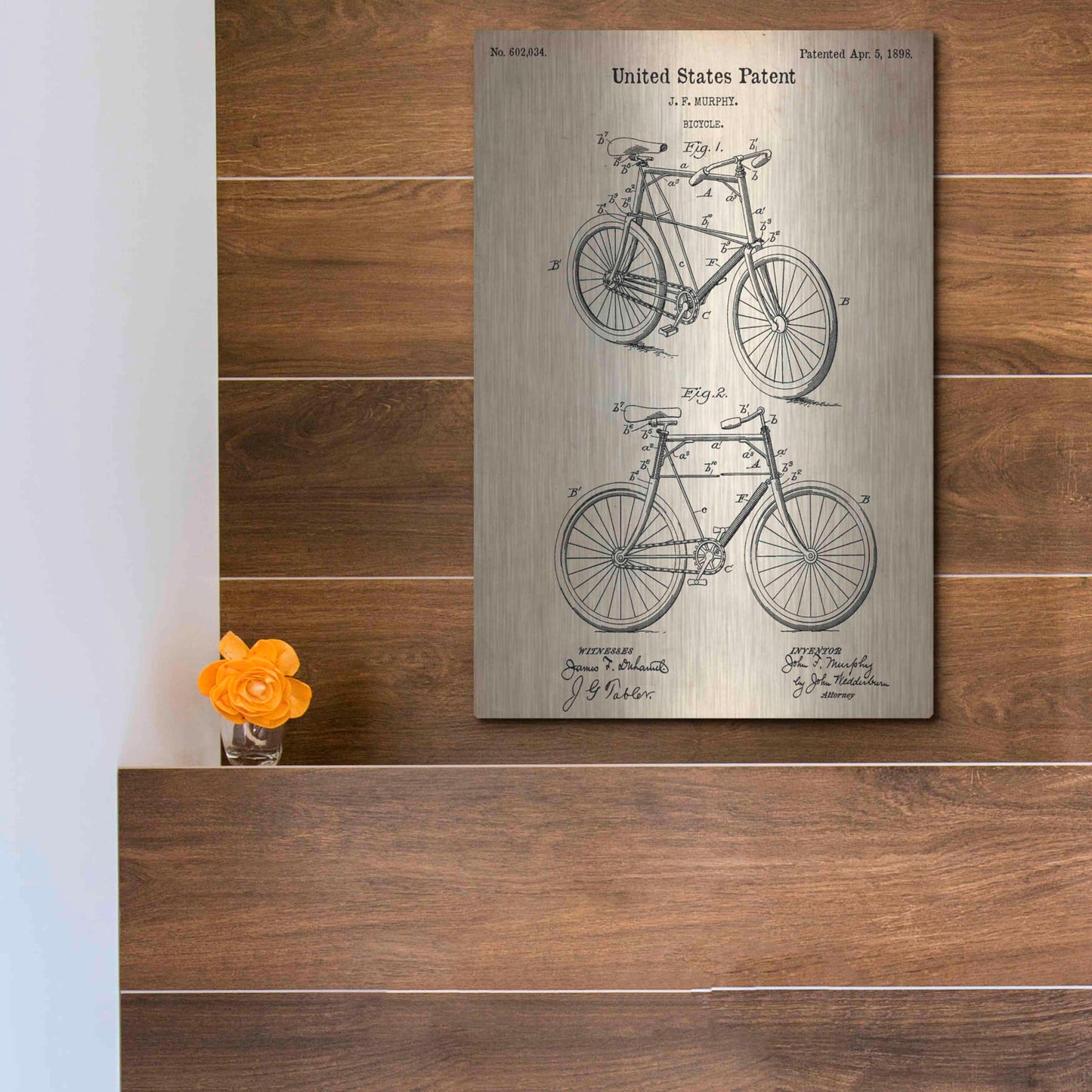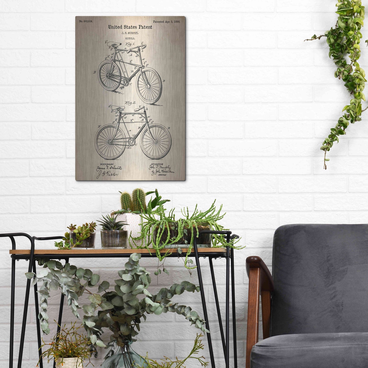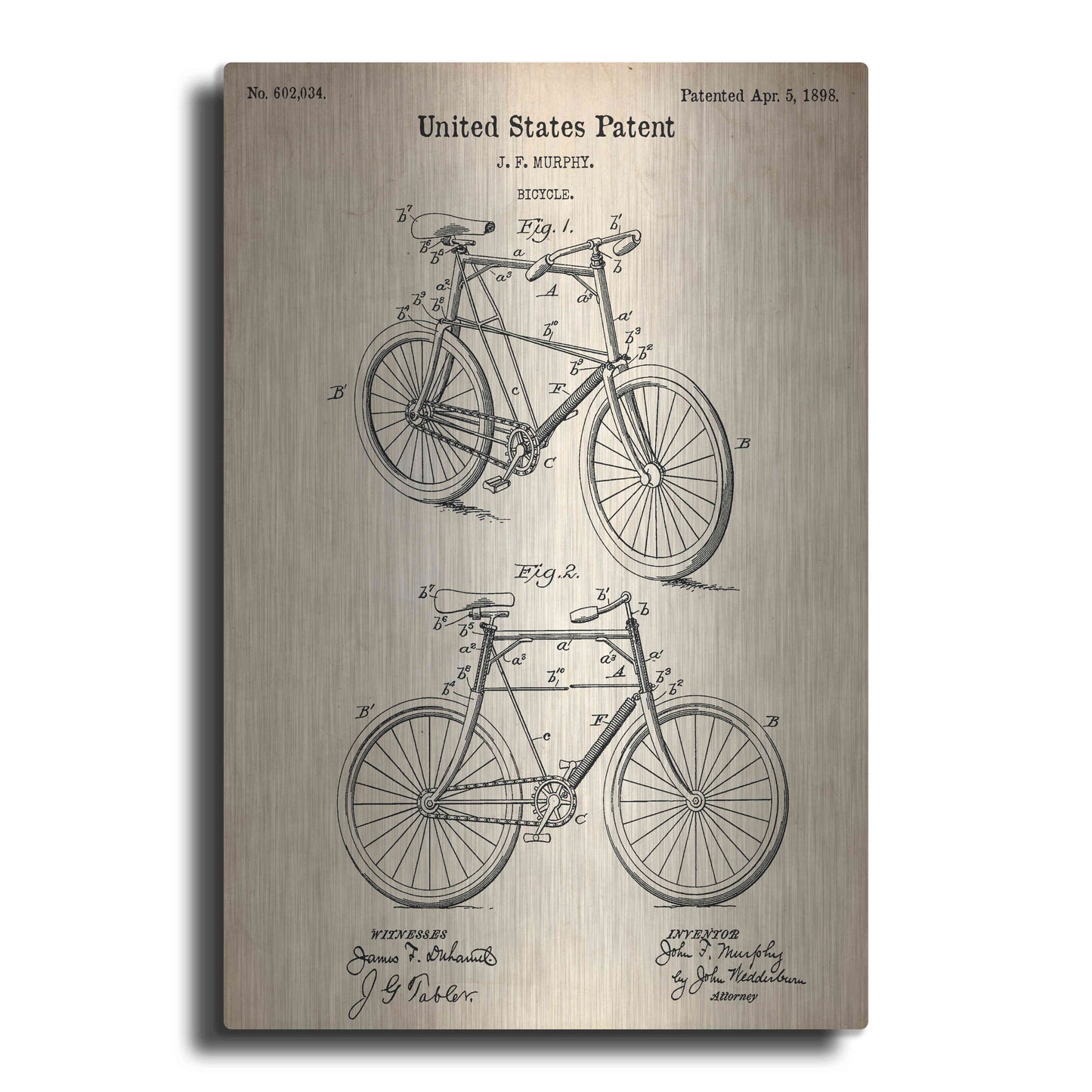 "Bicycle Vintage Patent". Featuring an authentic patent drawing from 1898 on vintage background. Bring a touch of something unique with Aluminum Wall Art from Luxe Metal Art for your home or business. UV Printed on 1/4 inch brushed aluminum panel and arrives ready to hang right out of the box. The shimmer of the natural aluminum gives the art a truly unique feel that can't be duplicated. Floating just over half an inch of the wall your frameless art piece will feel light and airy and truly pop.