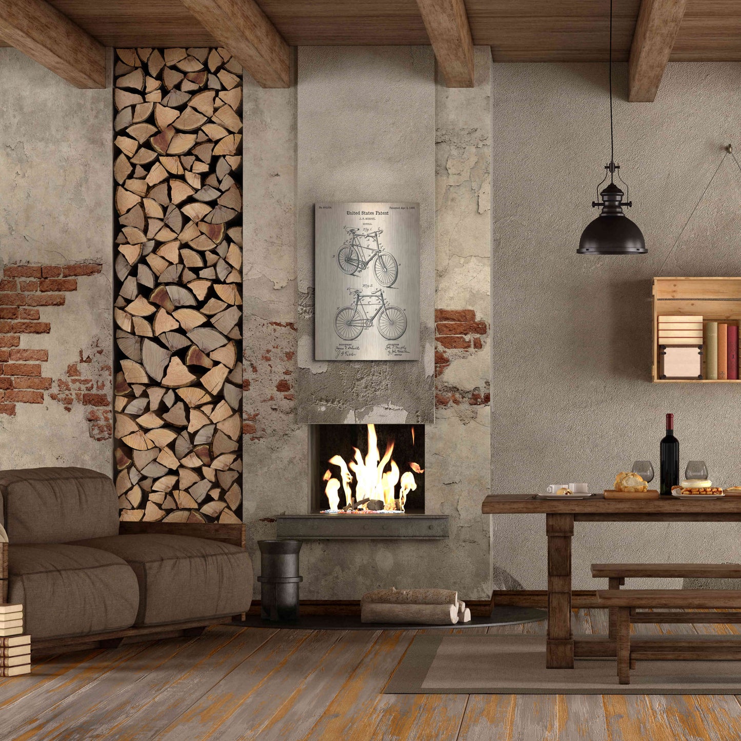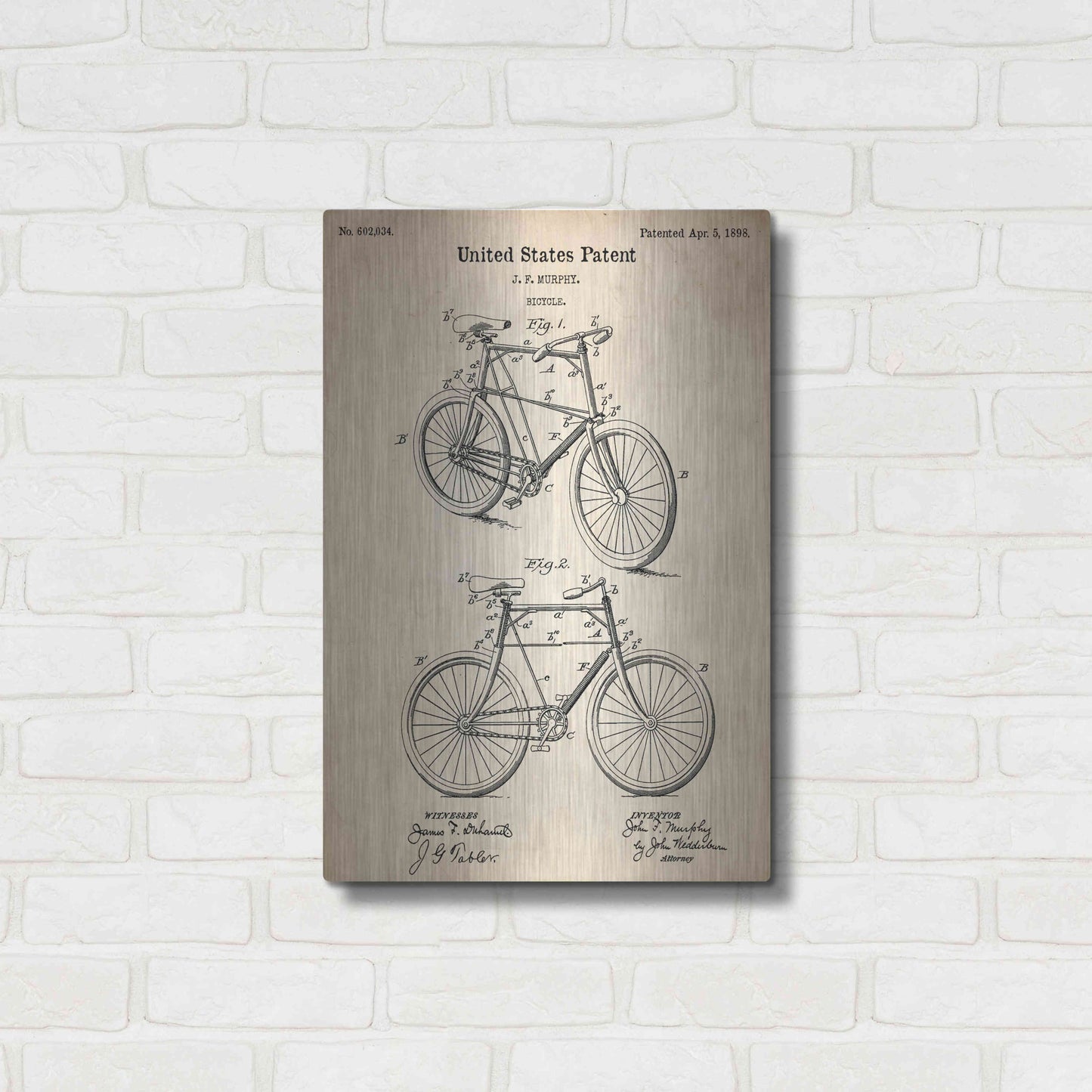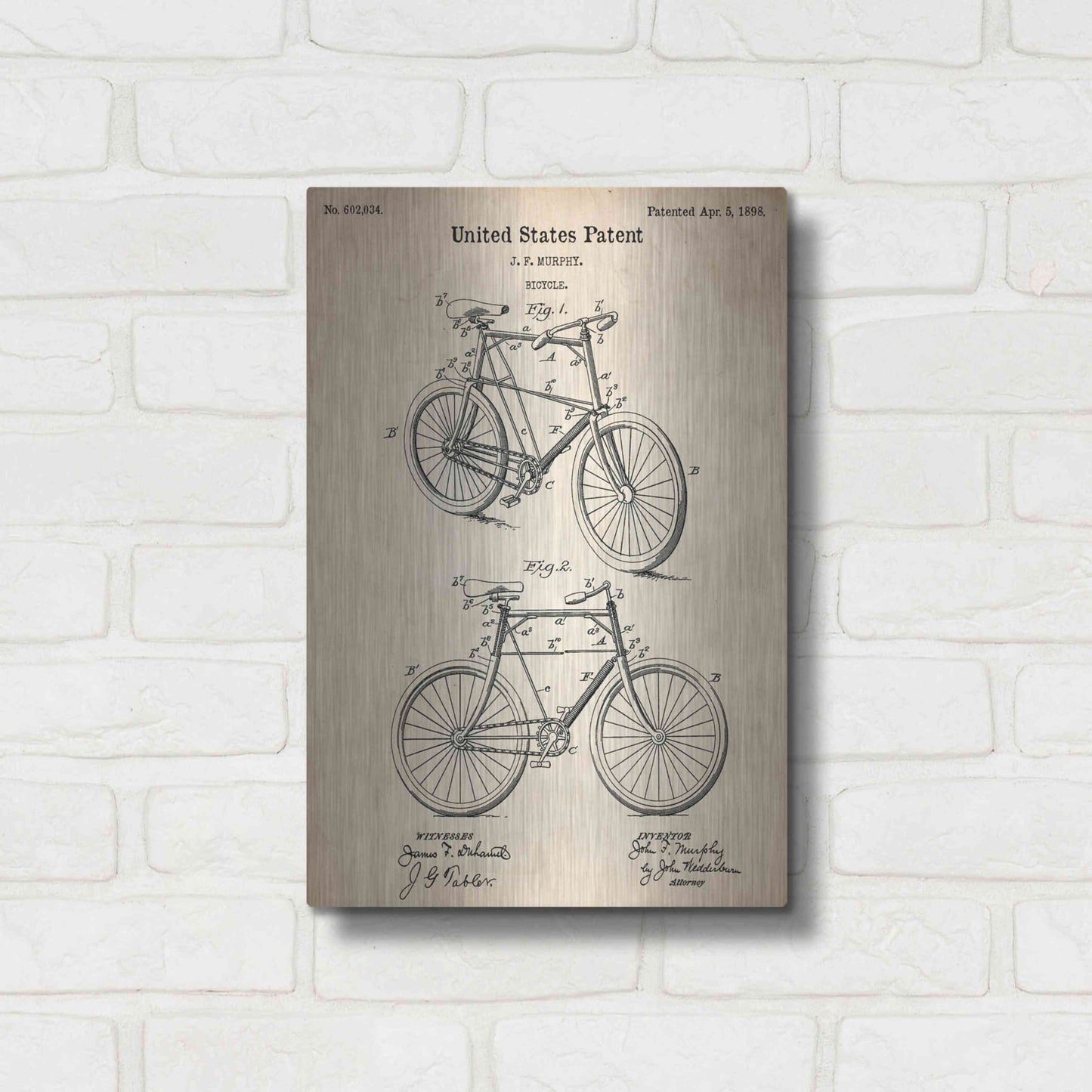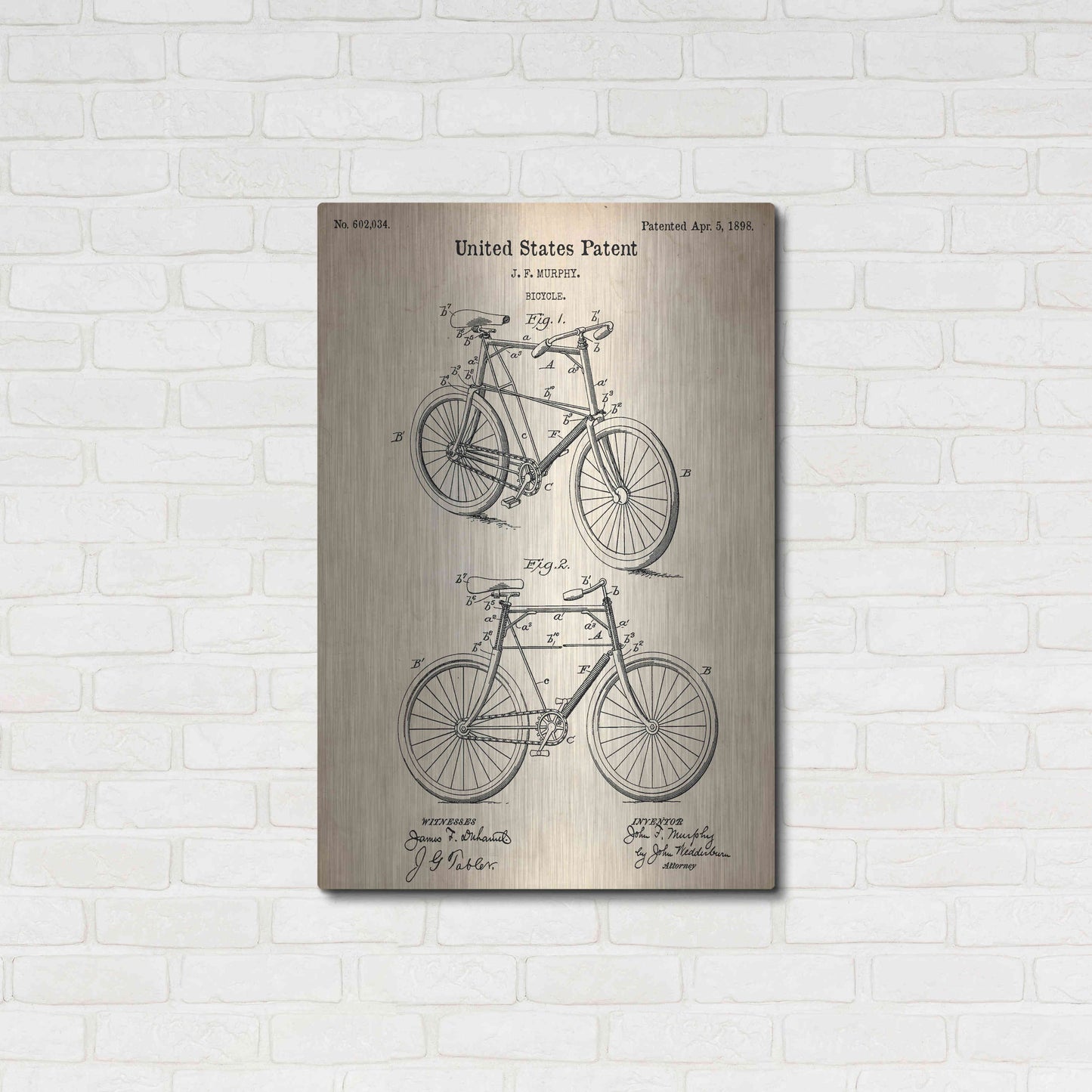 "Bicycle Vintage Patent". Featuring an authentic patent drawing from 1898 on vintage background. Bring a touch of something unique with Aluminum Wall Art from Luxe Metal Art for your home or business. UV Printed on 1/4 inch brushed aluminum panel and arrives ready to hang right out of the box. The shimmer of the natural aluminum gives the art a truly unique feel that can't be duplicated. Floating just over half an inch of the wall your frameless art piece will feel light and airy and truly pop.
