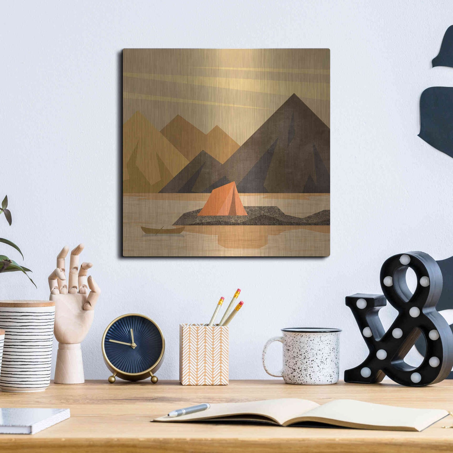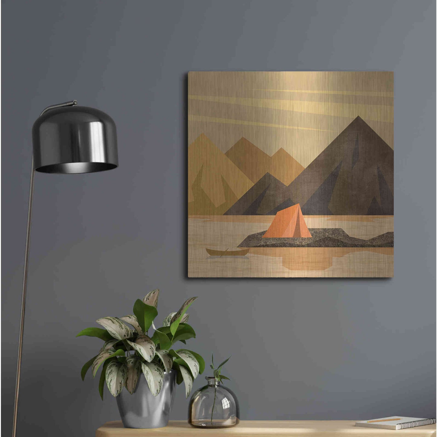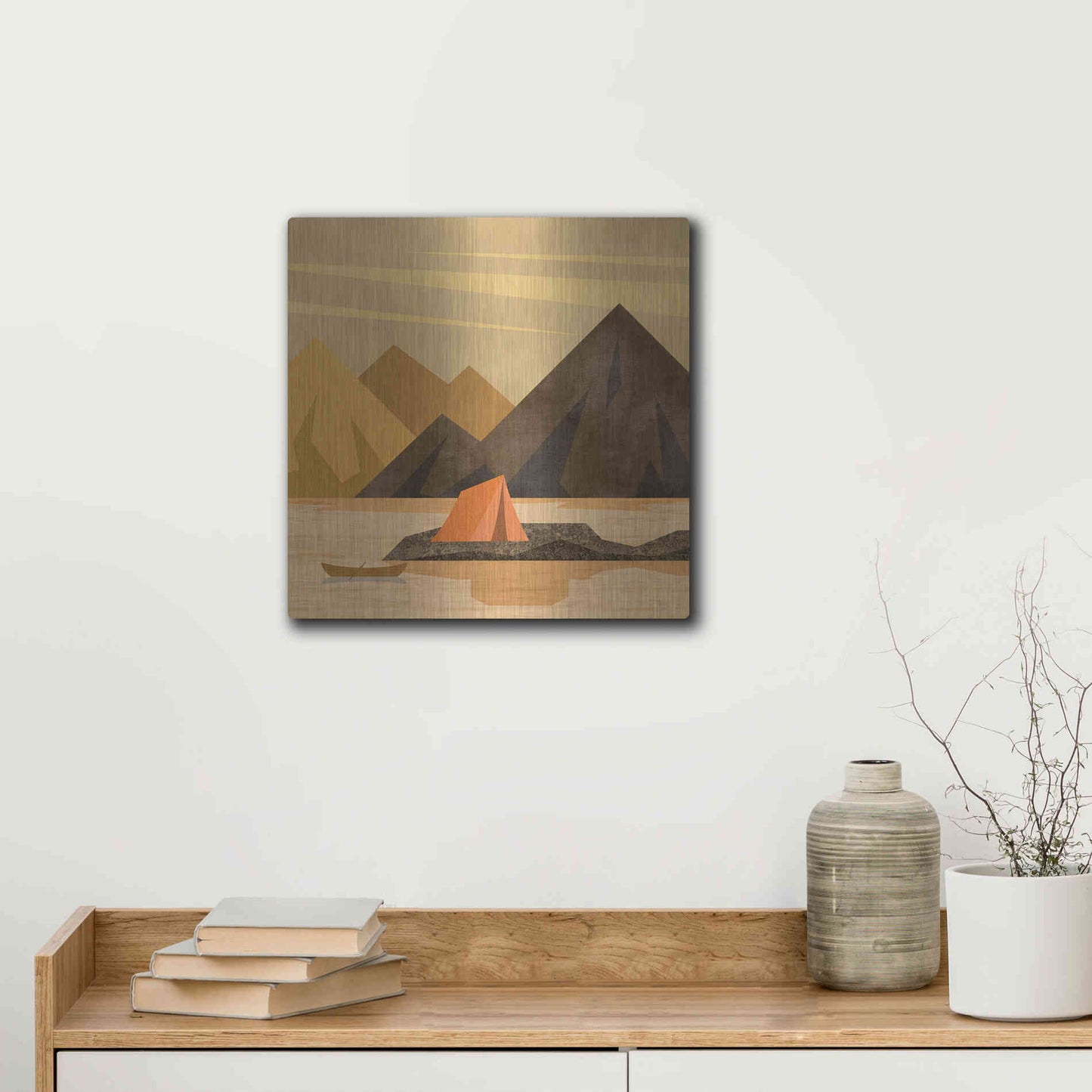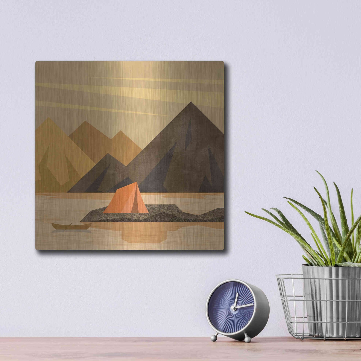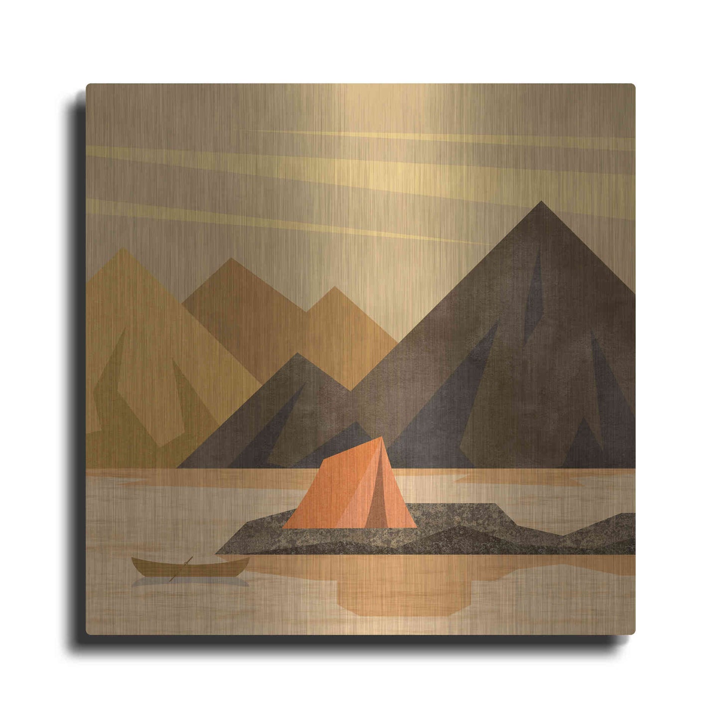 Luxe Metal Art 'Camping Adventure' by Andrea Haase, Metal Wall Art. Featuring peaceful, idyllic mountain landscape with water, rowing boat and a single tent in minimalist graphics with light texture .