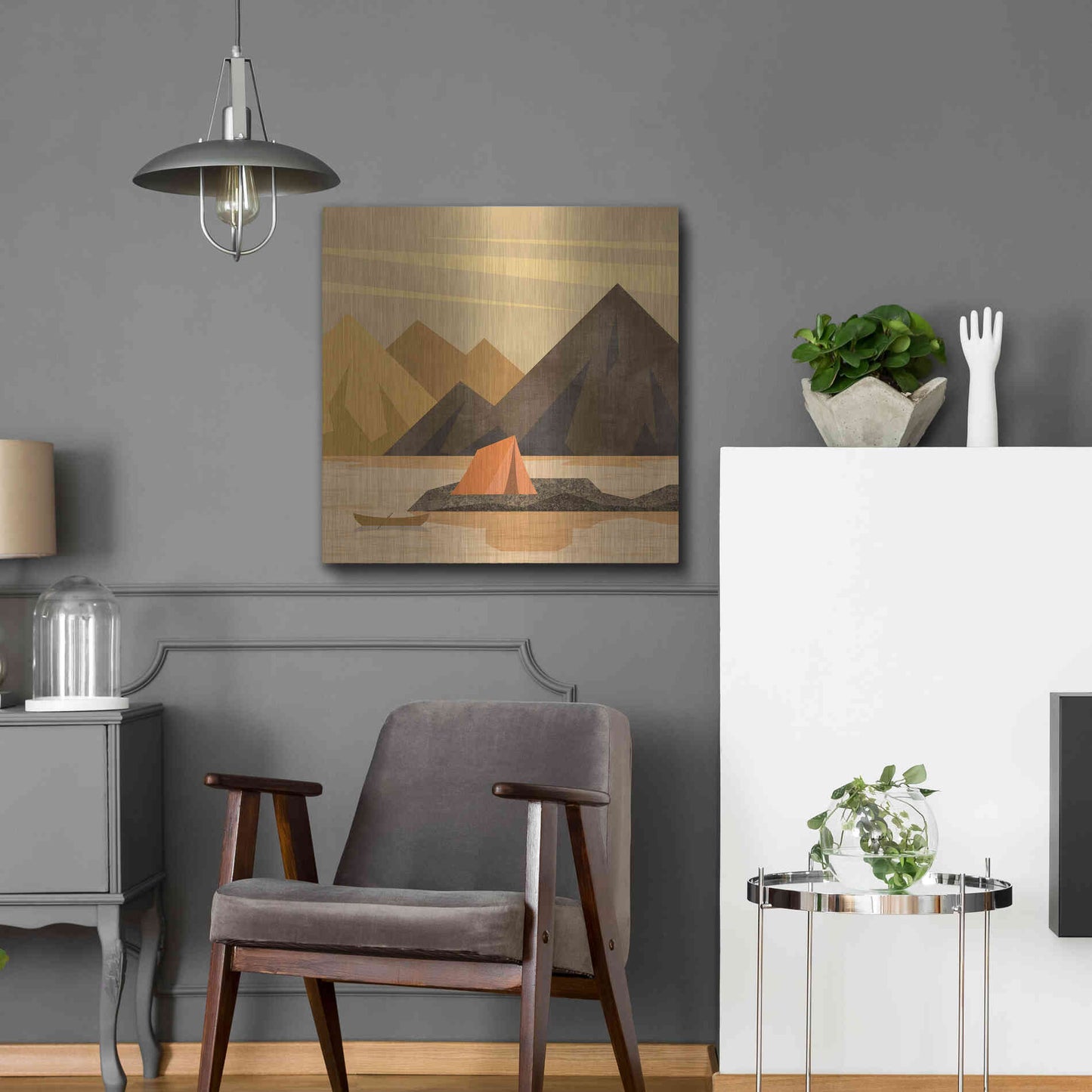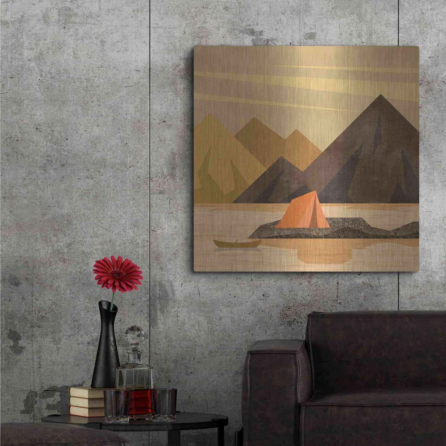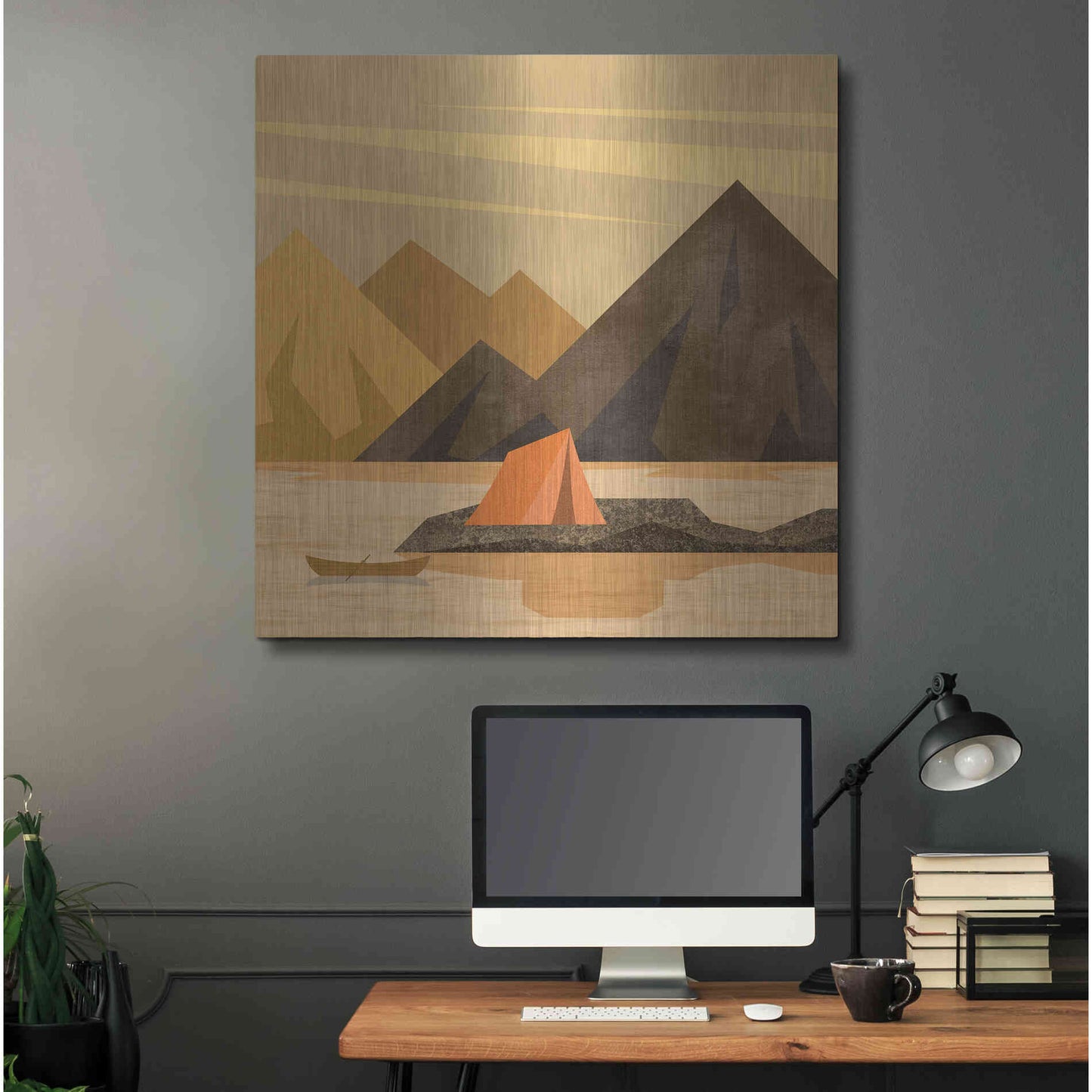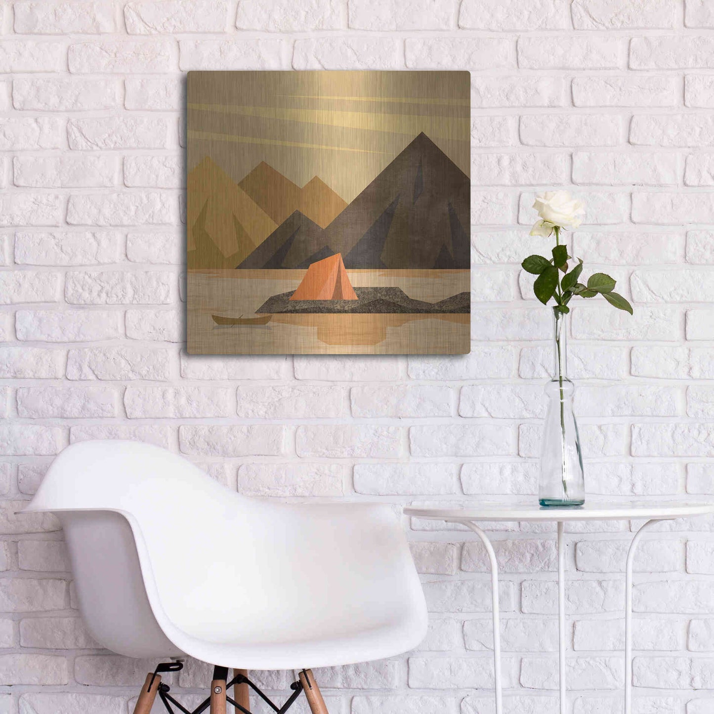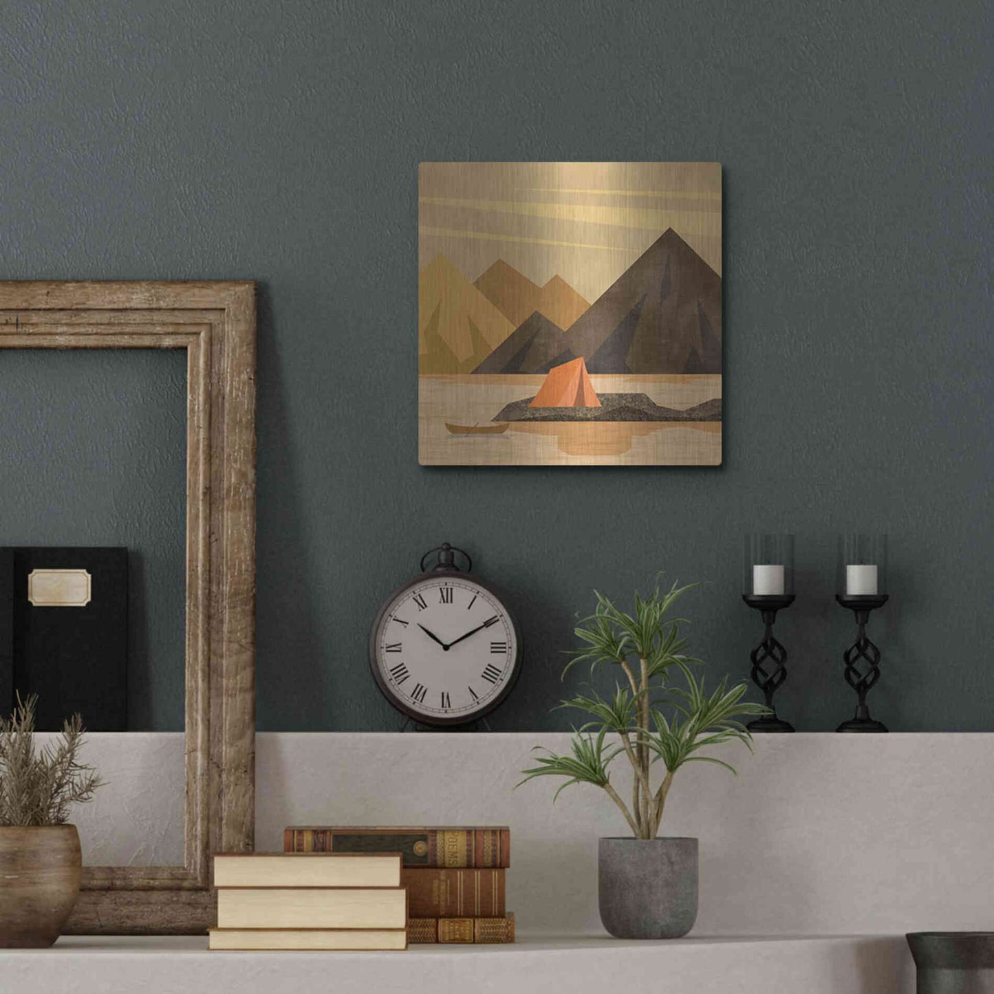 Luxe Metal Art 'Camping Adventure' by Andrea Haase, Metal Wall Art. Featuring peaceful, idyllic mountain landscape with water, rowing boat and a single tent in minimalist graphics with light texture .