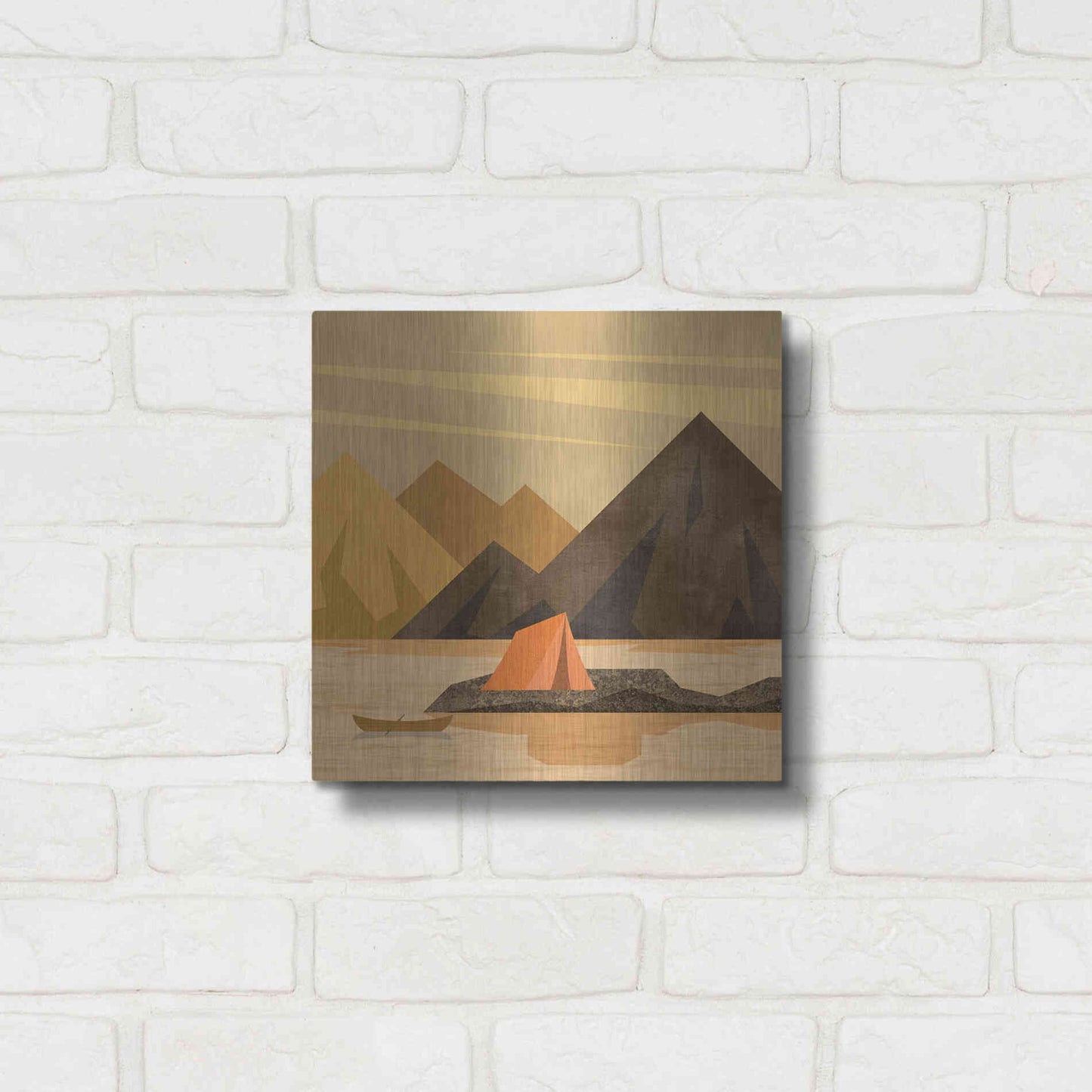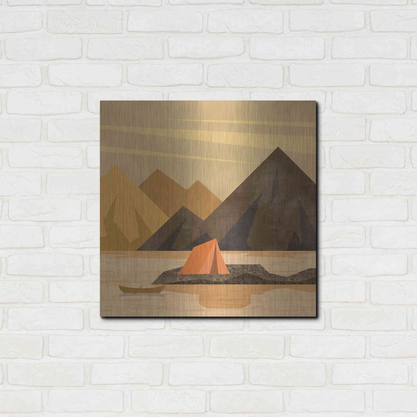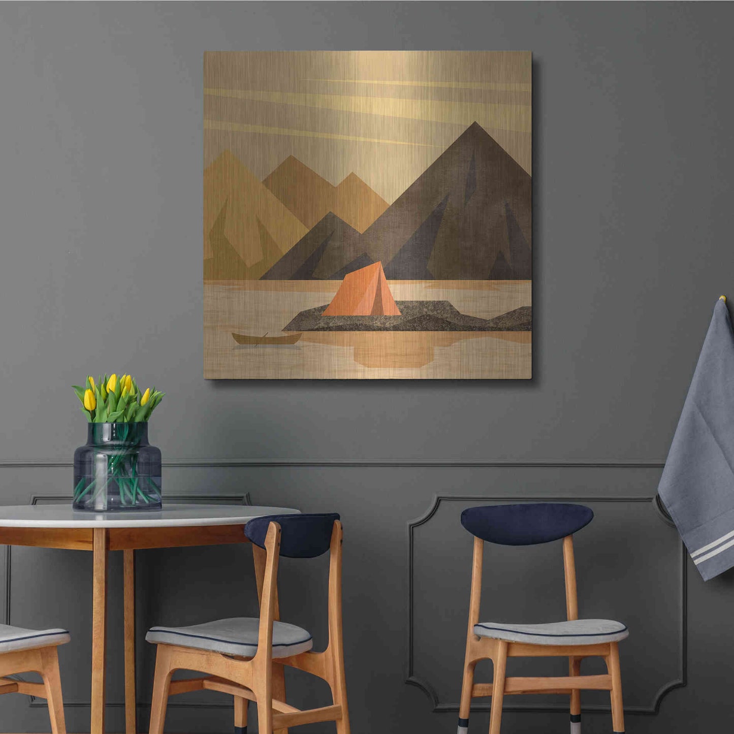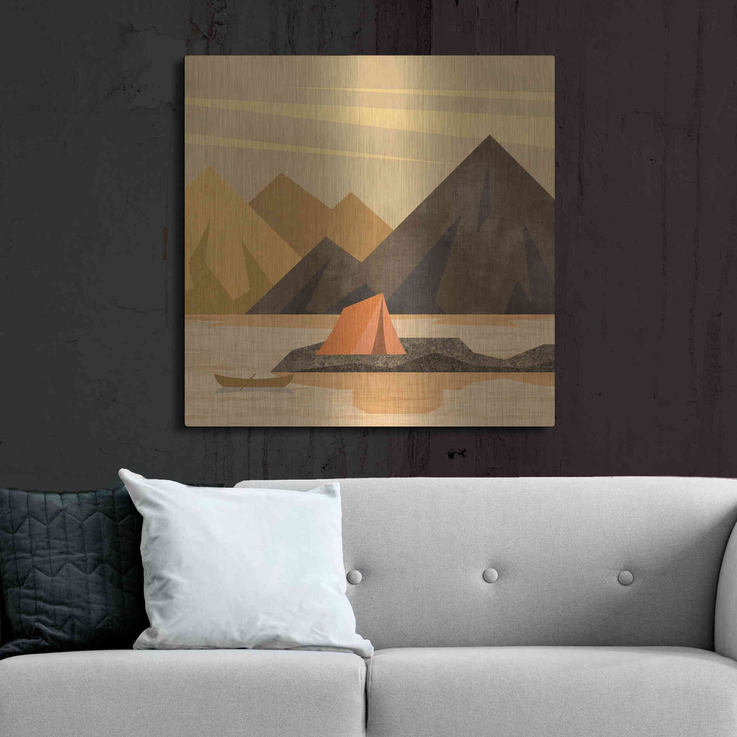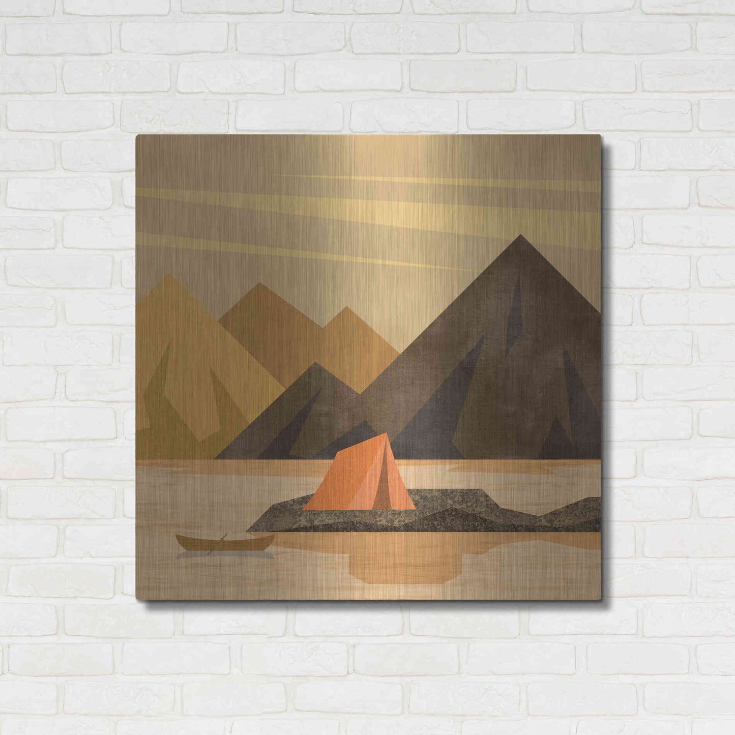 Luxe Metal Art 'Camping Adventure' by Andrea Haase, Metal Wall Art. Featuring peaceful, idyllic mountain landscape with water, rowing boat and a single tent in minimalist graphics with light texture .