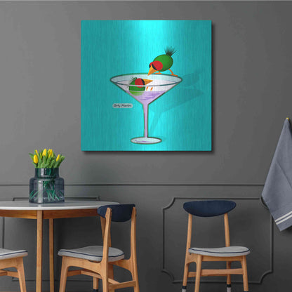 "Dirty Martini" by Chuck Wimmer. Featuring a couple of boozing birds relaxing in a martini glass. This art piece is great for a wet bar, kitchen, or as a housewarming gift. Chuck Wimmer creates comical animal prints incorporating puns and whimsical humor. All images are hand-drawn by computer using a tablet. Bring a touch of something unique with Aluminum Wall Art from Luxe Metal Art for your home or business. UV Printed on 1/4 inch brushed aluminum panel and arrives ready to hang right out of the box. The shimmer of the natural aluminum gives the art a truly unique feel that can't be duplicated. Floating just over half an inch of the wall your frameless art piece will feel light and airy and truly pop.