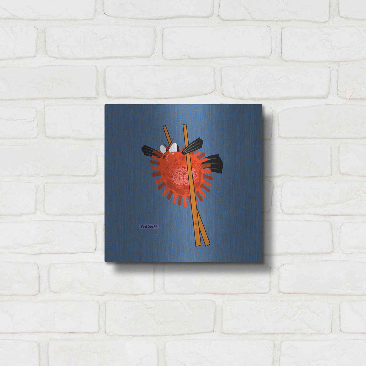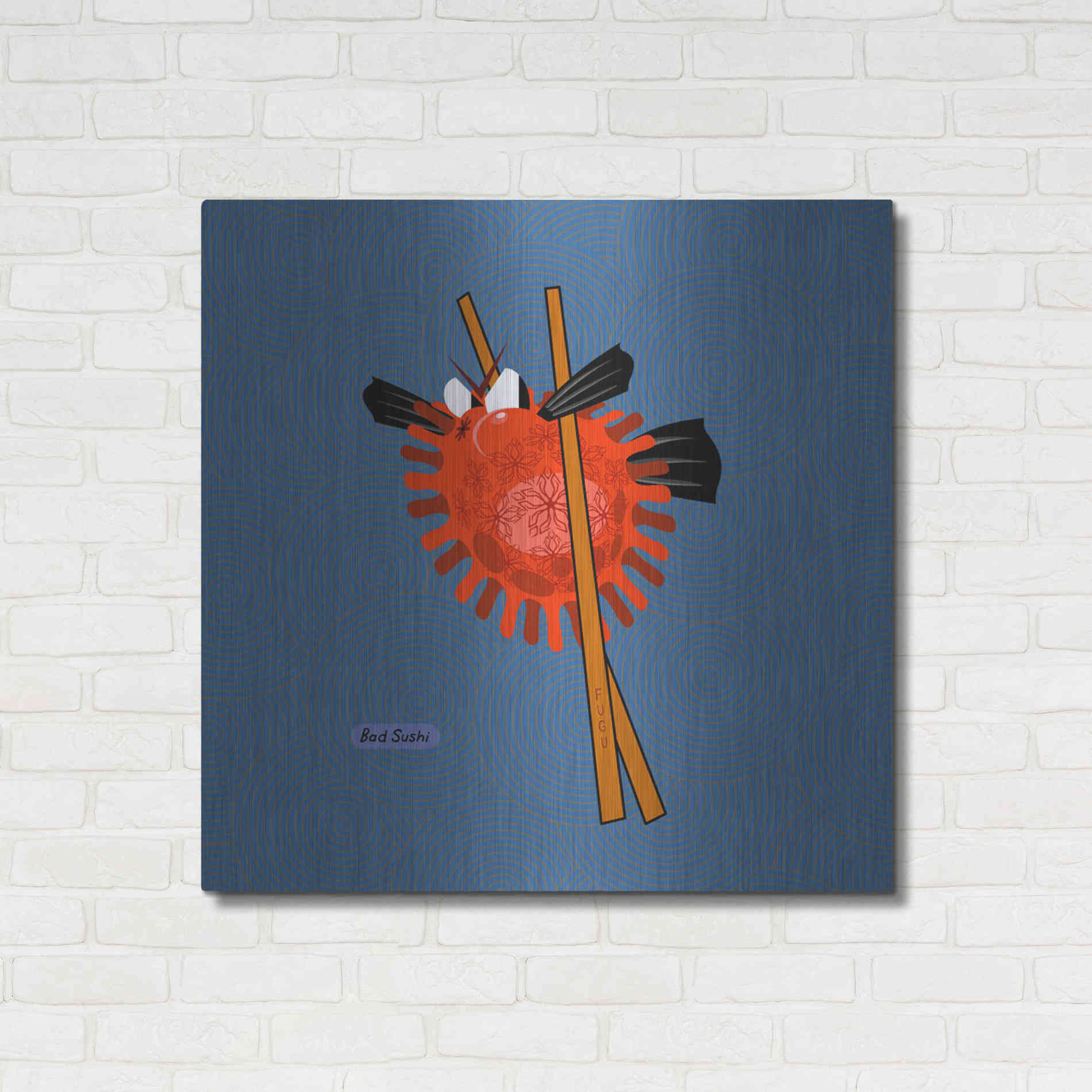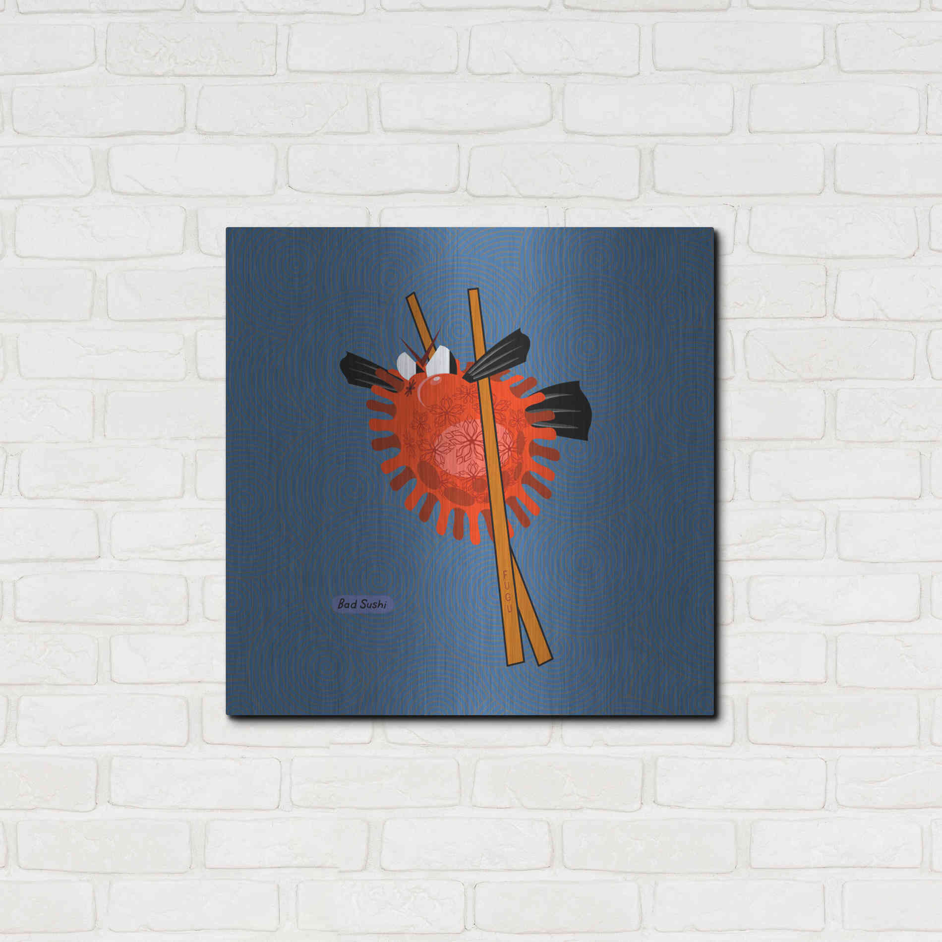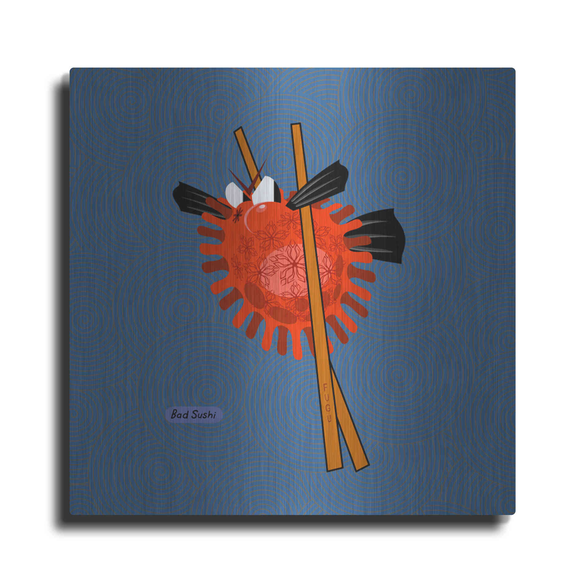 "Fugu" by Chuck Wimmer. Featuring a grumpy piece of sushi caught between two chopsticks. Perfect piece for your home kitchen or commercial space. Chuck Wimmer creates comical animal prints incorporating puns and whimsical humor. All images are hand-drawn by computer using a tablet. Bring a touch of something unique with Aluminum Wall Art from Luxe Metal Art for your home or business. UV Printed on 1/4 inch brushed aluminum panel and arrives ready to hang right out of the box. The shimmer of the natural aluminum gives the art a truly unique feel that can't be duplicated. Floating just over half an inch of the wall your frameless art piece will feel light and airy and truly pop.