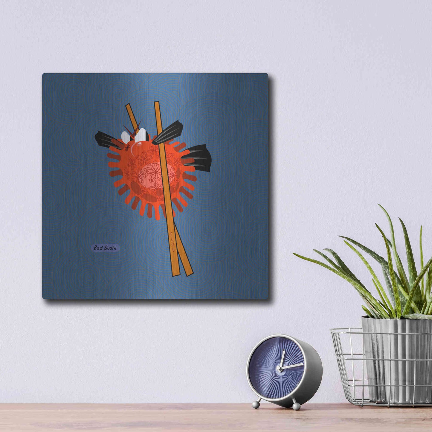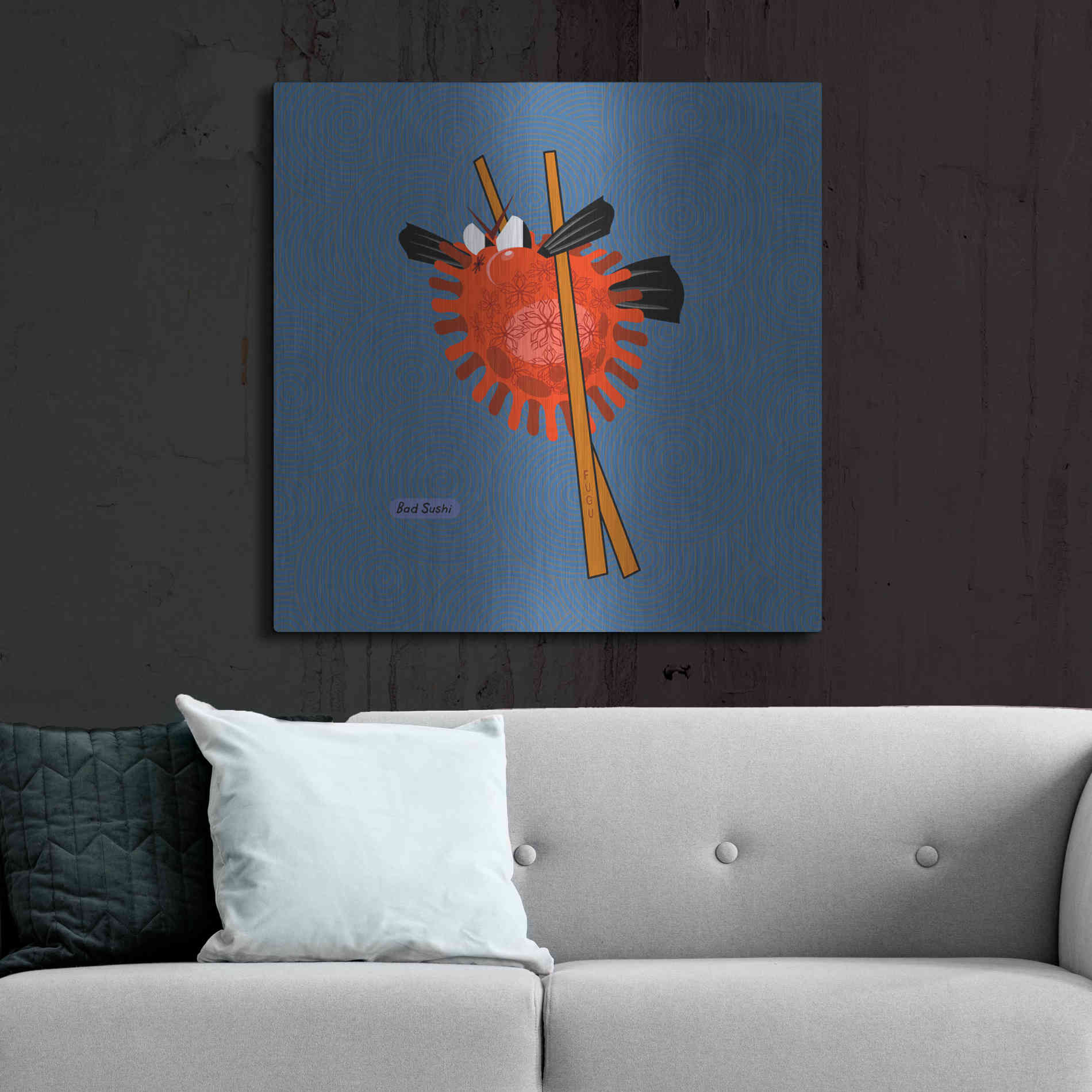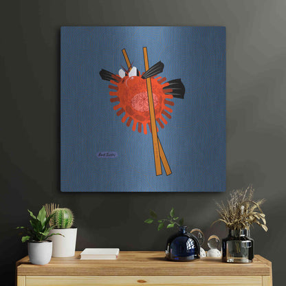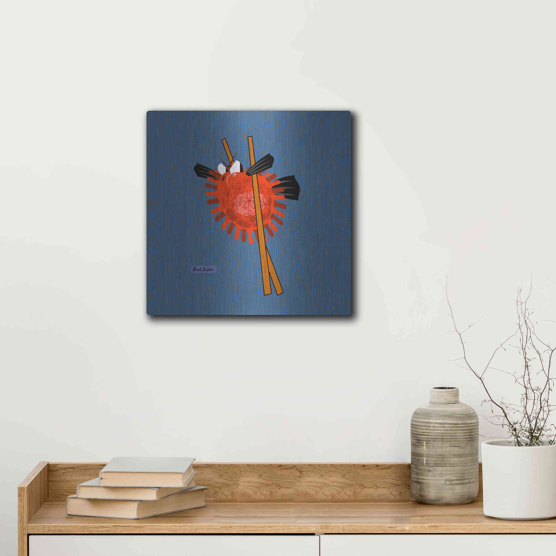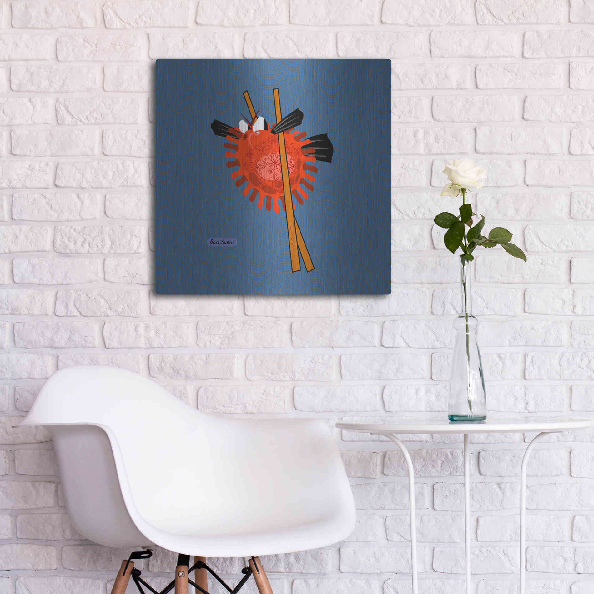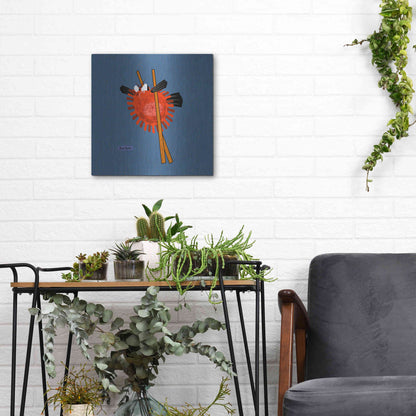 "Fugu" by Chuck Wimmer. Featuring a grumpy piece of sushi caught between two chopsticks. Perfect piece for your home kitchen or commercial space. Chuck Wimmer creates comical animal prints incorporating puns and whimsical humor. All images are hand-drawn by computer using a tablet. Bring a touch of something unique with Aluminum Wall Art from Luxe Metal Art for your home or business. UV Printed on 1/4 inch brushed aluminum panel and arrives ready to hang right out of the box. The shimmer of the natural aluminum gives the art a truly unique feel that can't be duplicated. Floating just over half an inch of the wall your frameless art piece will feel light and airy and truly pop.