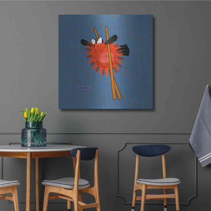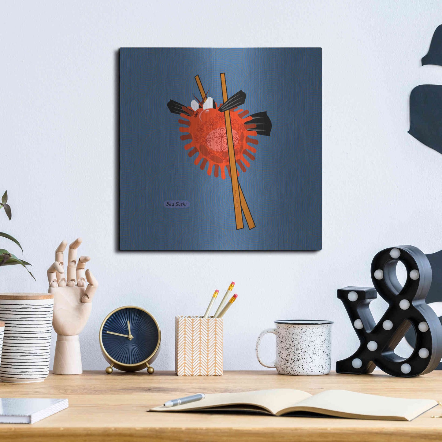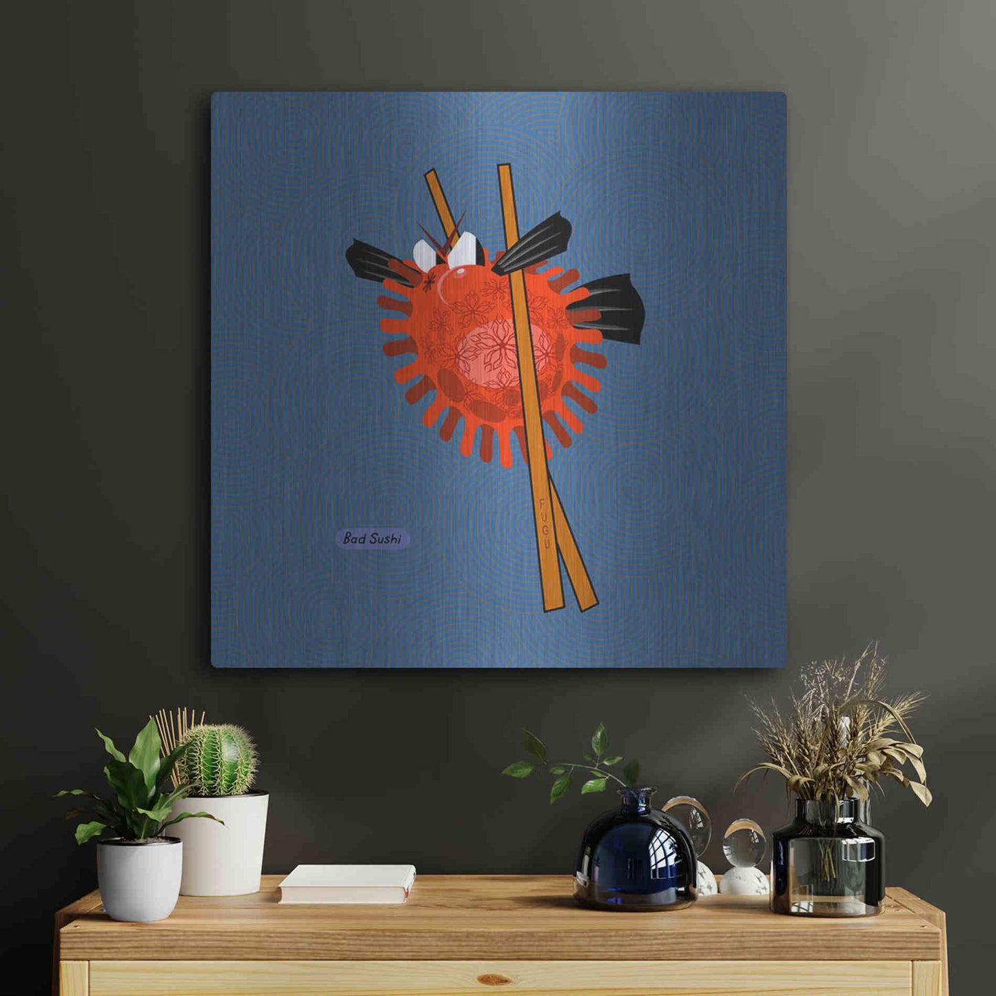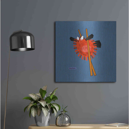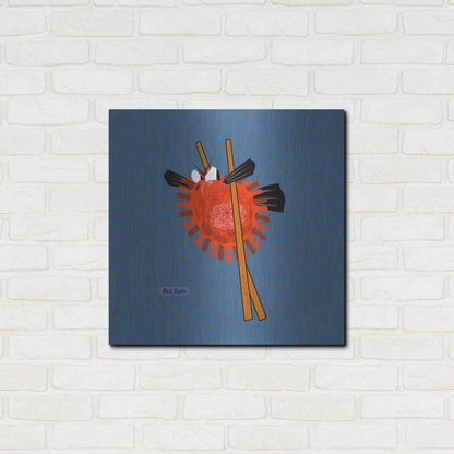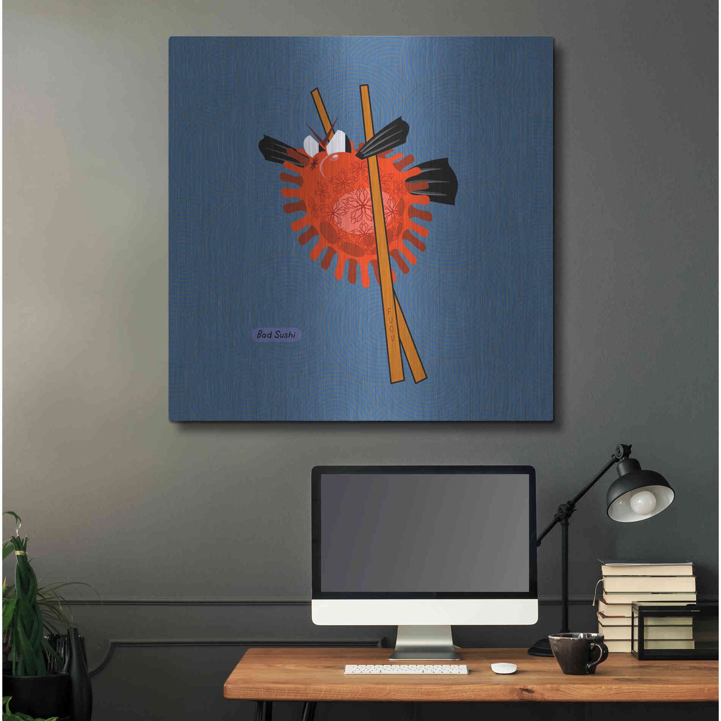 "Fugu" by Chuck Wimmer. Featuring a grumpy piece of sushi caught between two chopsticks. Perfect piece for your home kitchen or commercial space. Chuck Wimmer creates comical animal prints incorporating puns and whimsical humor. All images are hand-drawn by computer using a tablet. Bring a touch of something unique with Aluminum Wall Art from Luxe Metal Art for your home or business. UV Printed on 1/4 inch brushed aluminum panel and arrives ready to hang right out of the box. The shimmer of the natural aluminum gives the art a truly unique feel that can't be duplicated. Floating just over half an inch of the wall your frameless art piece will feel light and airy and truly pop.