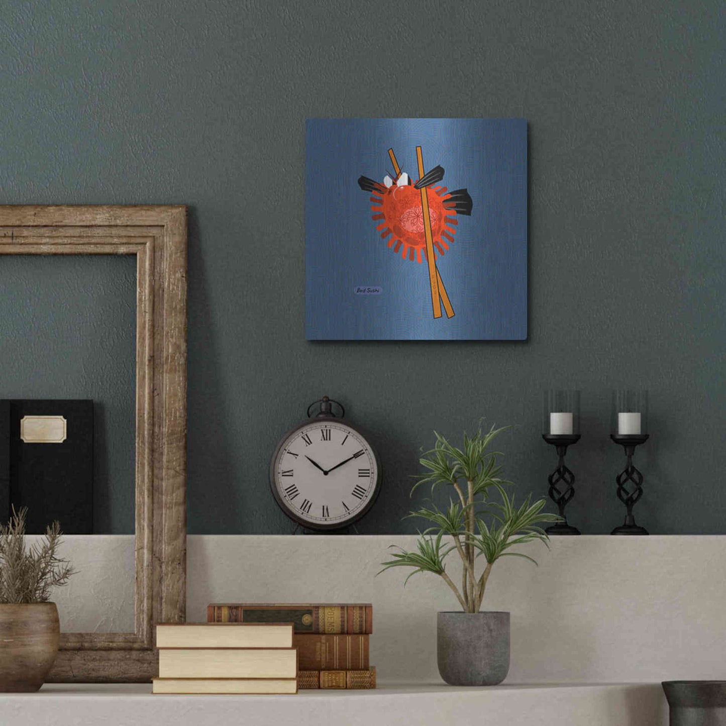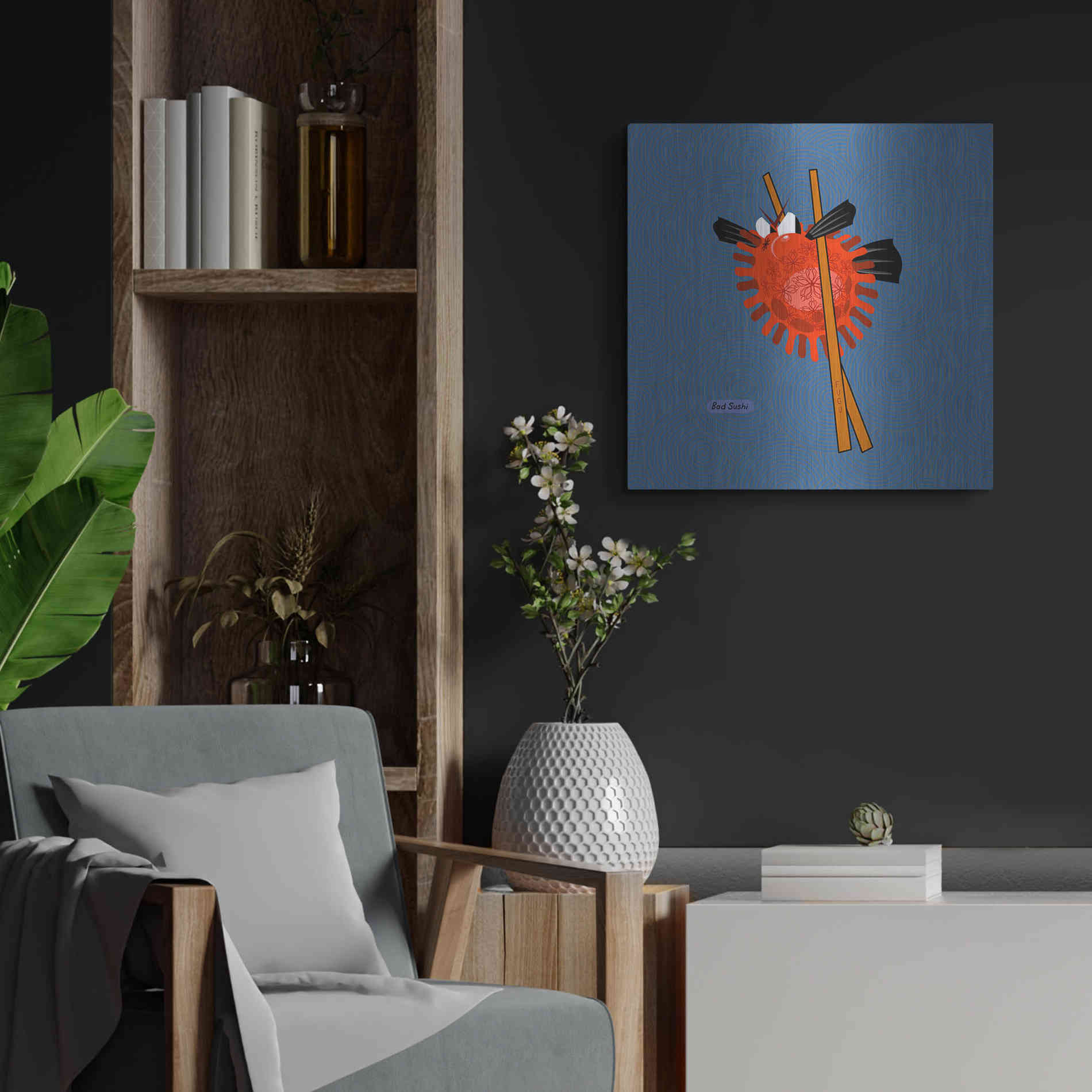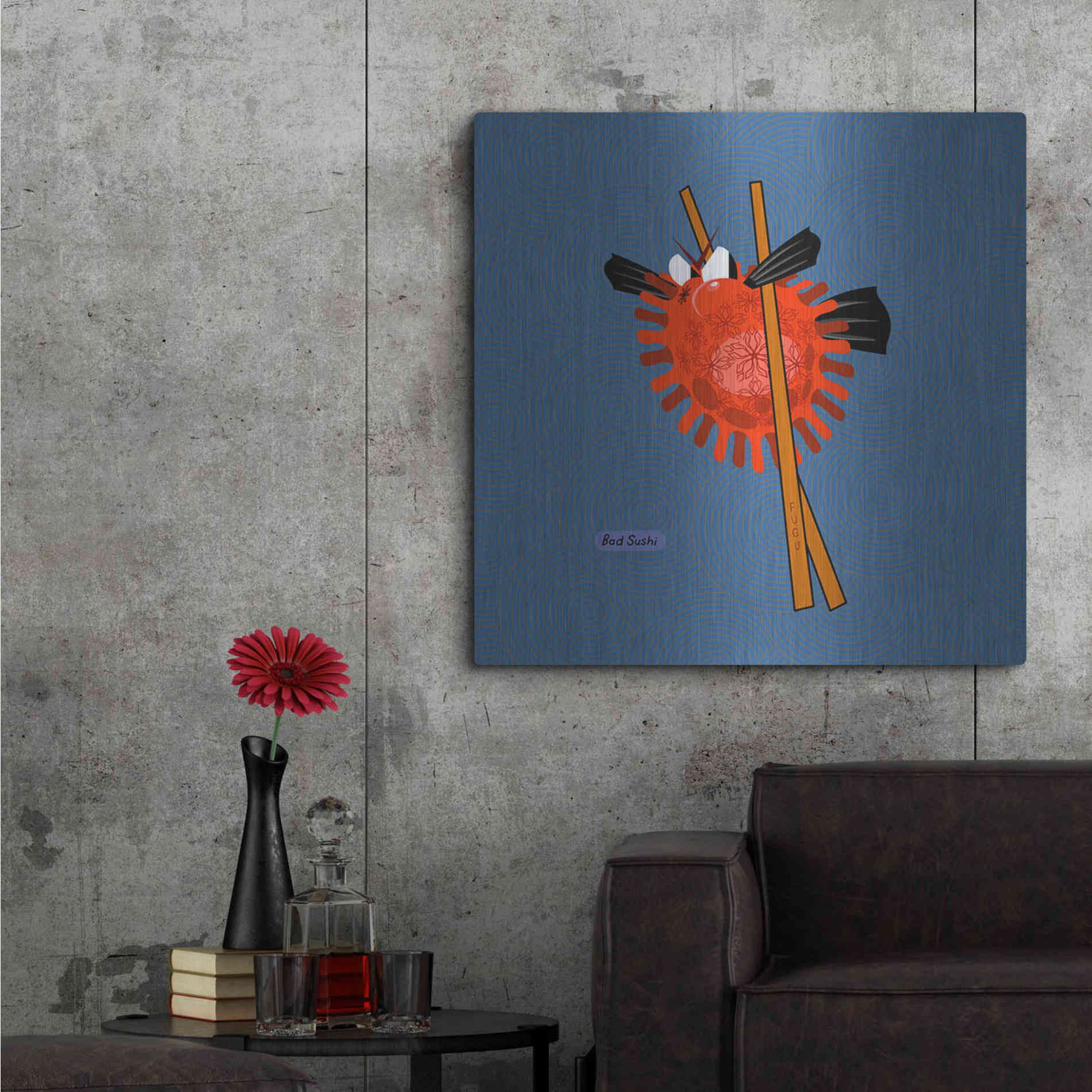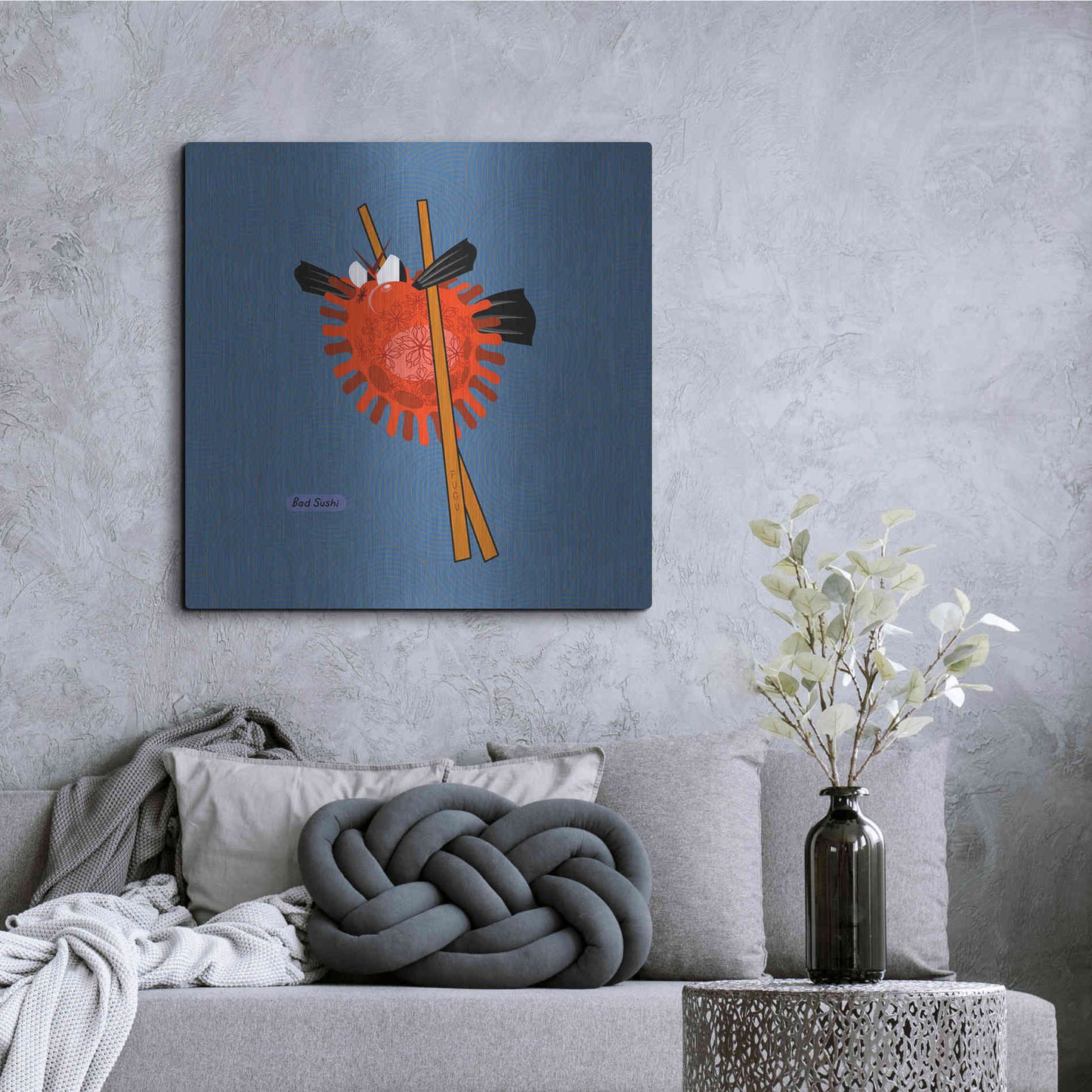 "Fugu" by Chuck Wimmer. Featuring a grumpy piece of sushi caught between two chopsticks. Perfect piece for your home kitchen or commercial space. Chuck Wimmer creates comical animal prints incorporating puns and whimsical humor. All images are hand-drawn by computer using a tablet. Bring a touch of something unique with Aluminum Wall Art from Luxe Metal Art for your home or business. UV Printed on 1/4 inch brushed aluminum panel and arrives ready to hang right out of the box. The shimmer of the natural aluminum gives the art a truly unique feel that can't be duplicated. Floating just over half an inch of the wall your frameless art piece will feel light and airy and truly pop.