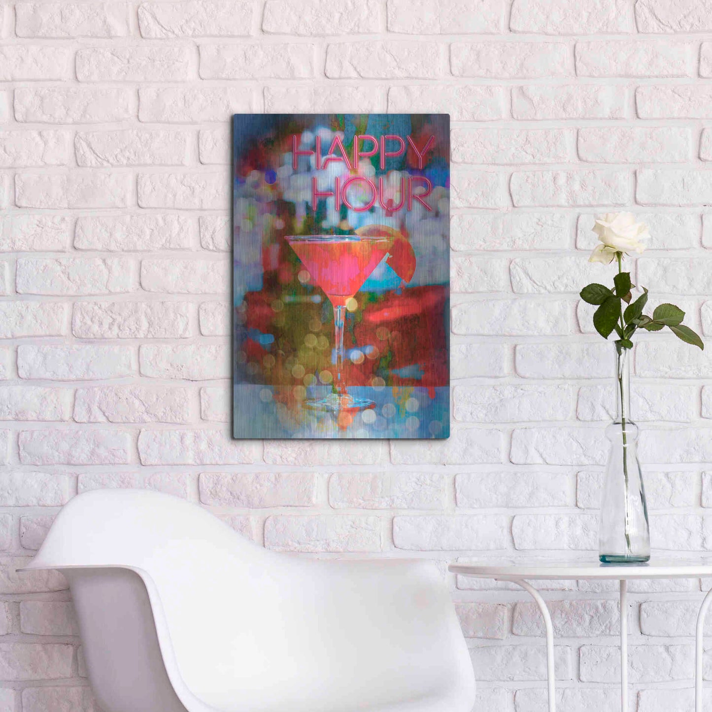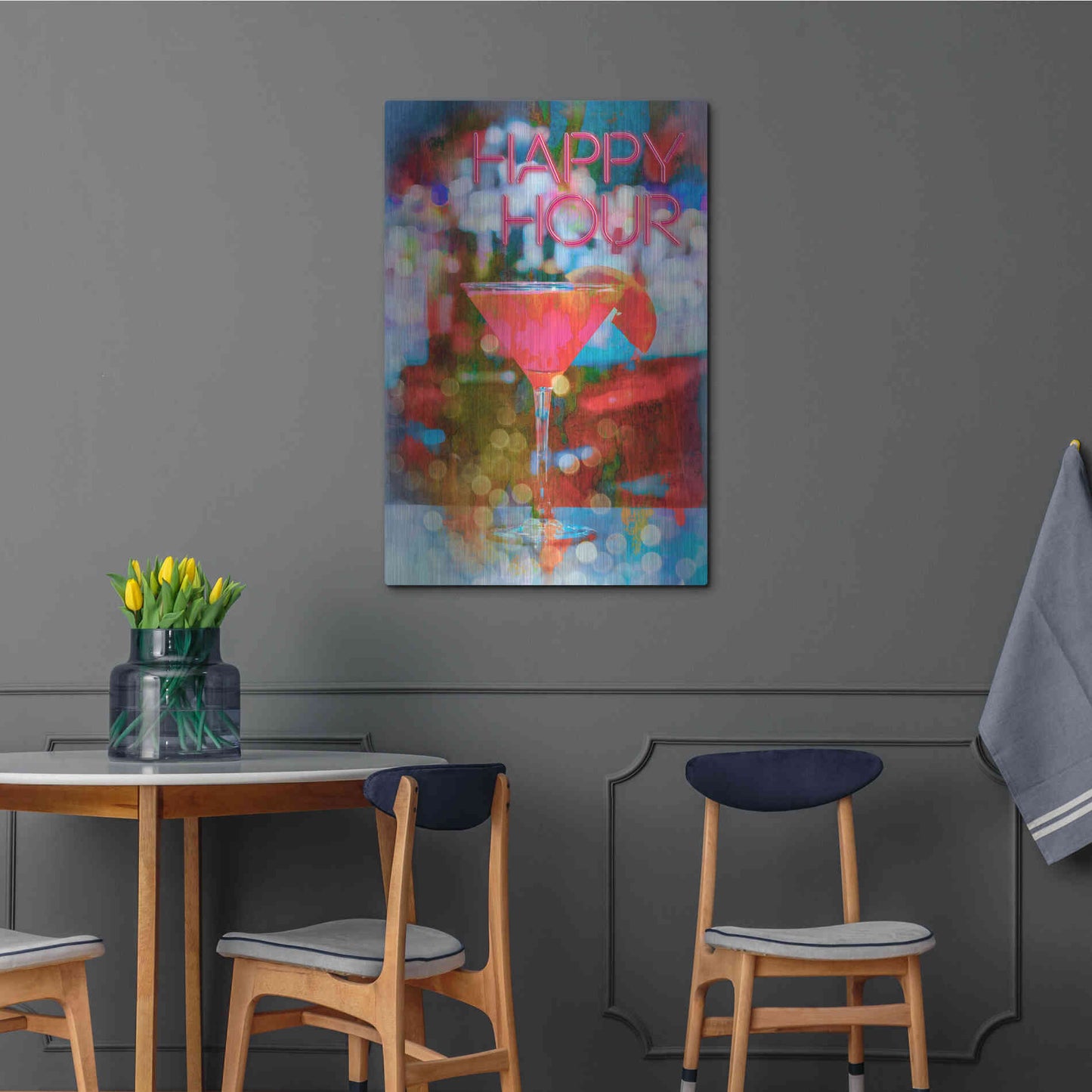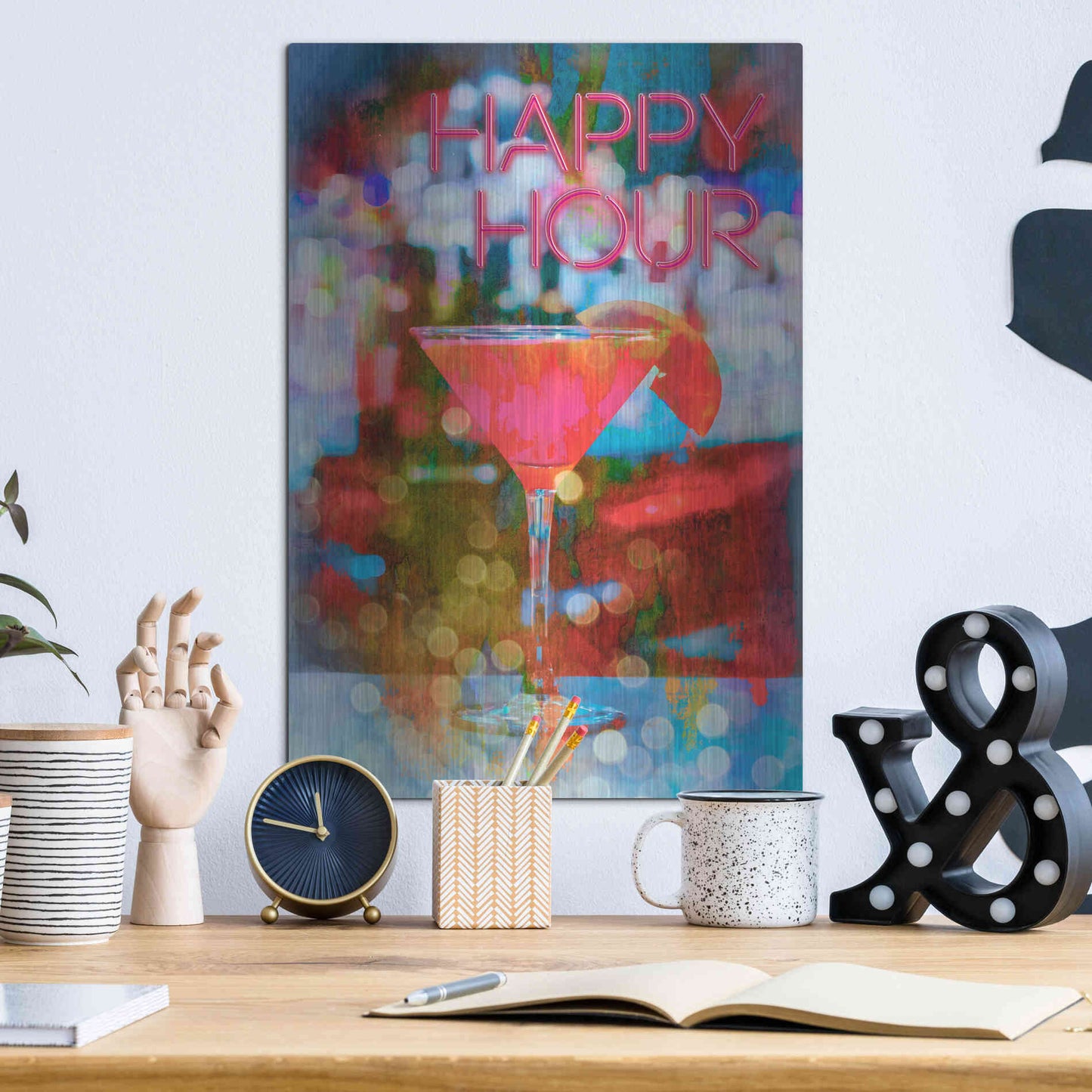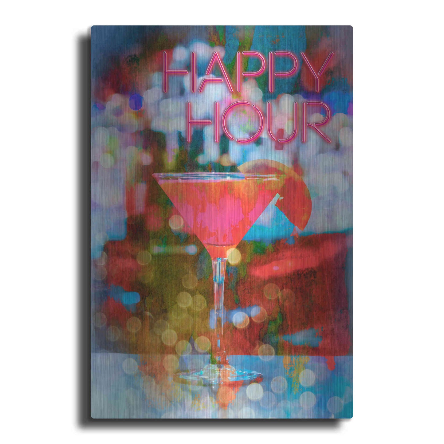 Luxe Metal Art 'Happy Hour' by Andrea Haase, Metal Wall Art. Featuring colorful mixed media art featuring a summer cocktail and neon text happy hour .
