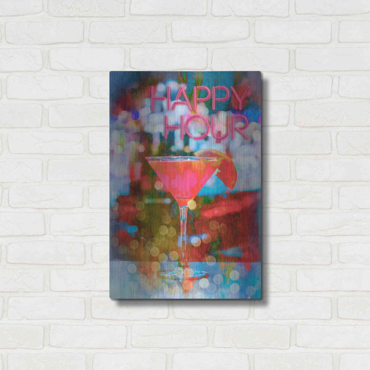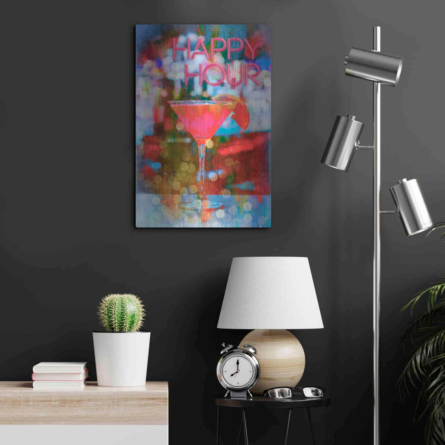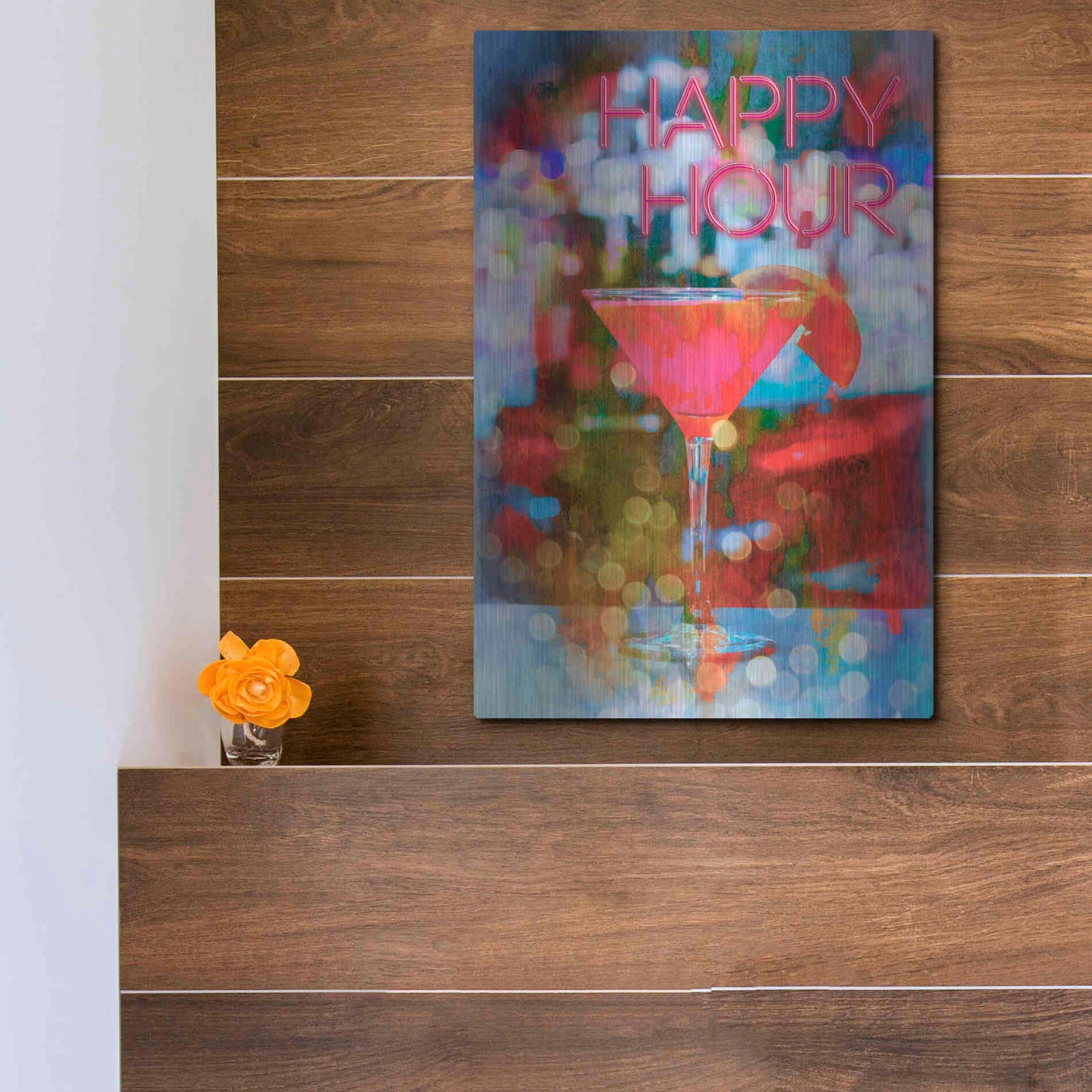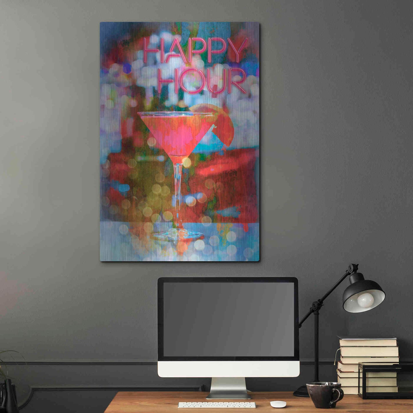 Luxe Metal Art 'Happy Hour' by Andrea Haase, Metal Wall Art. Featuring colorful mixed media art featuring a summer cocktail and neon text happy hour .