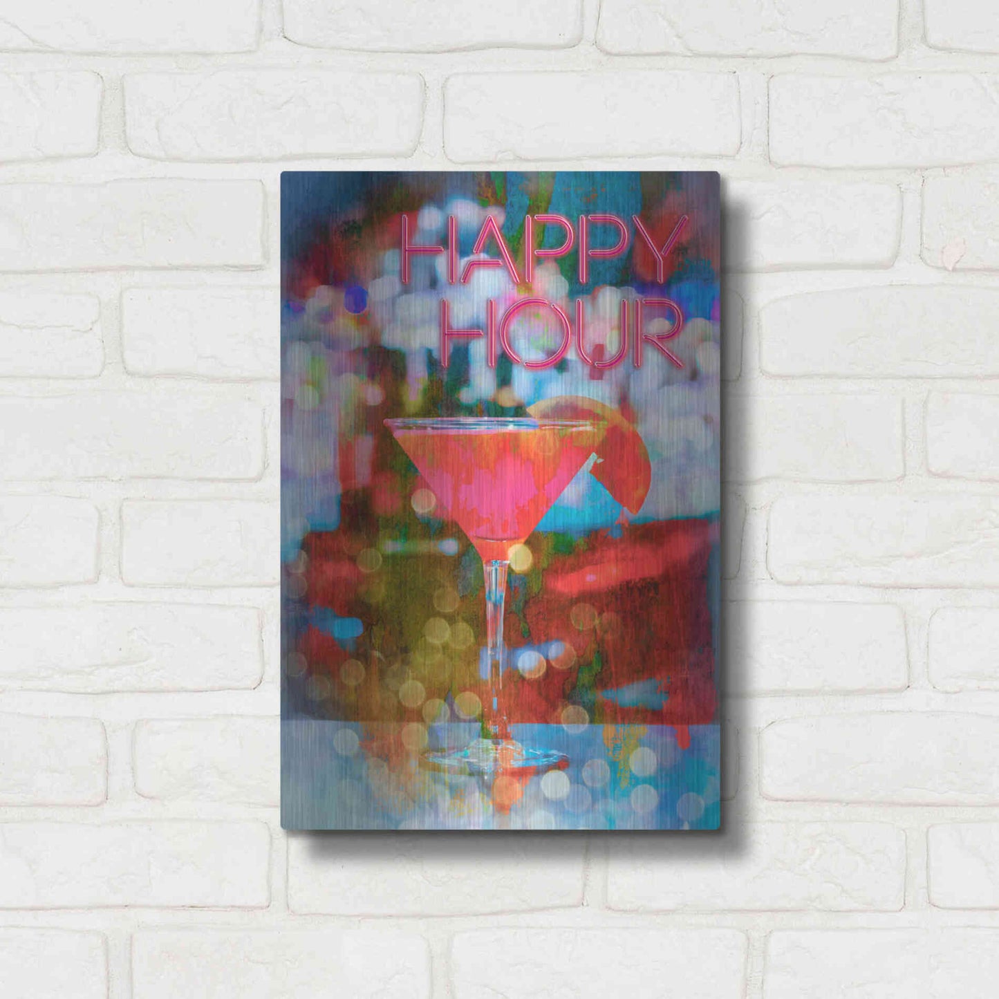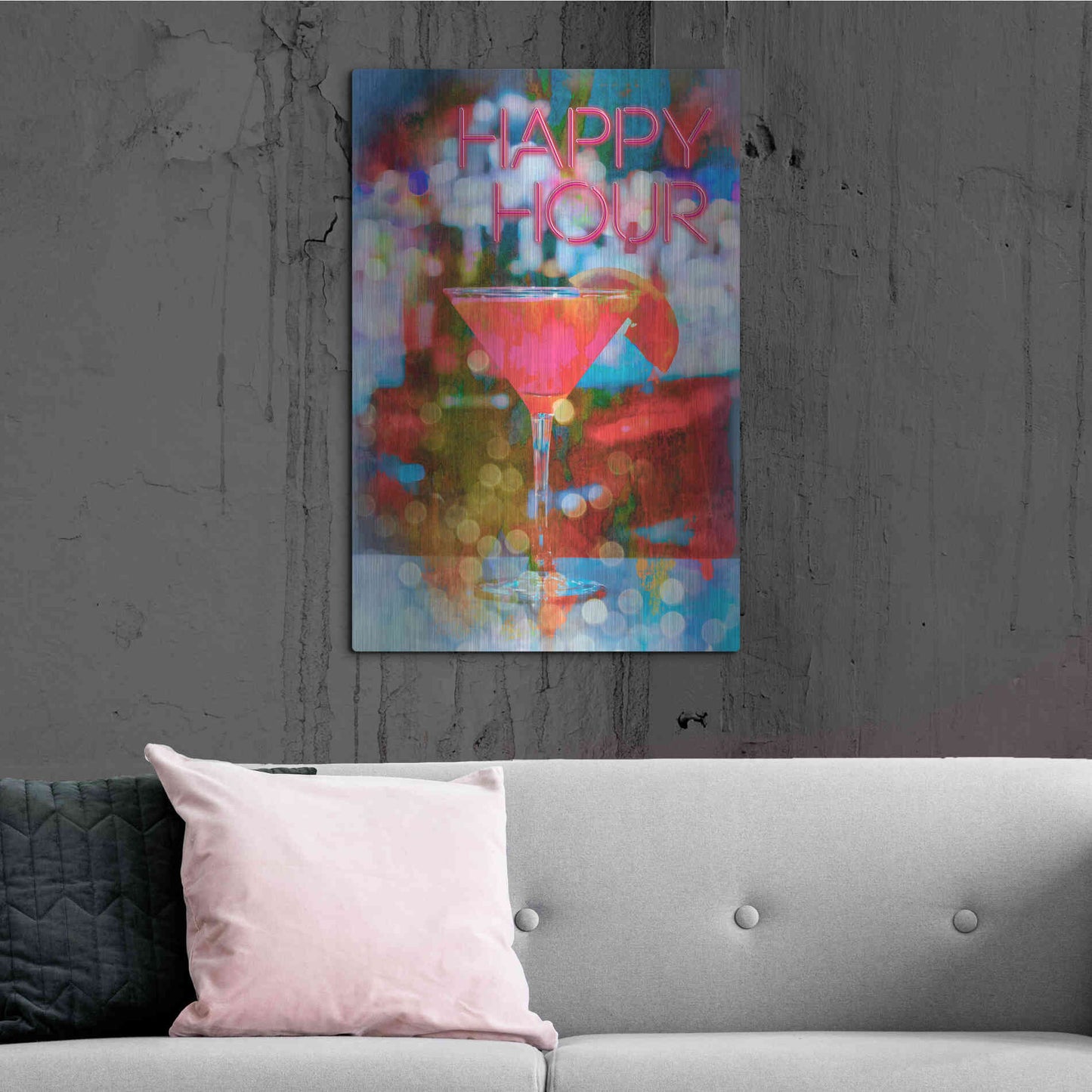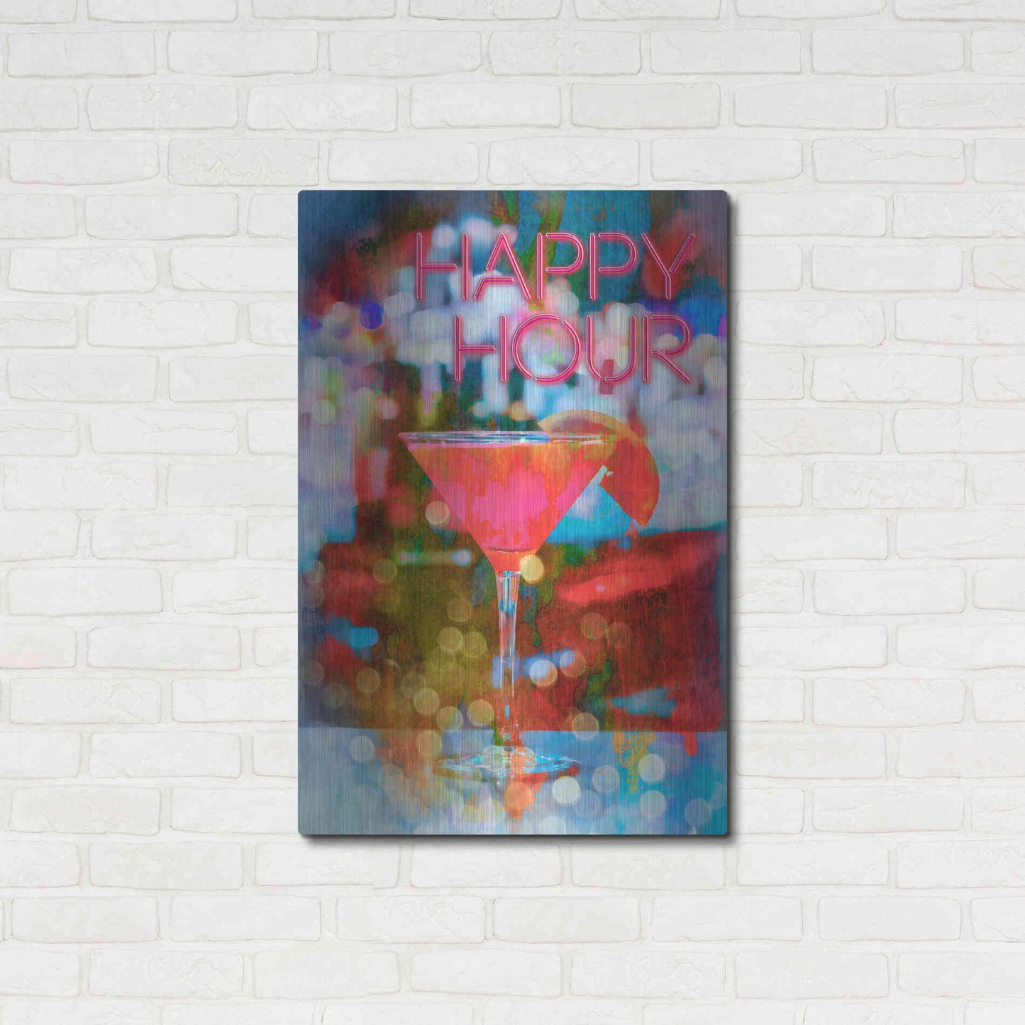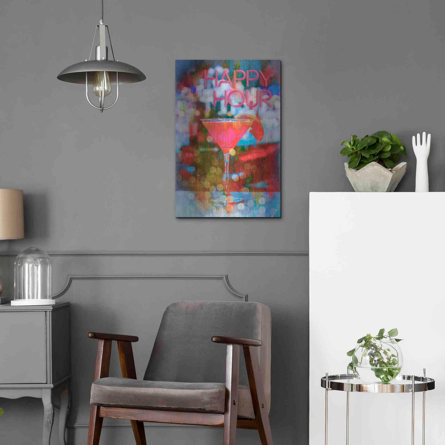 Luxe Metal Art 'Happy Hour' by Andrea Haase, Metal Wall Art. Featuring colorful mixed media art featuring a summer cocktail and neon text happy hour .