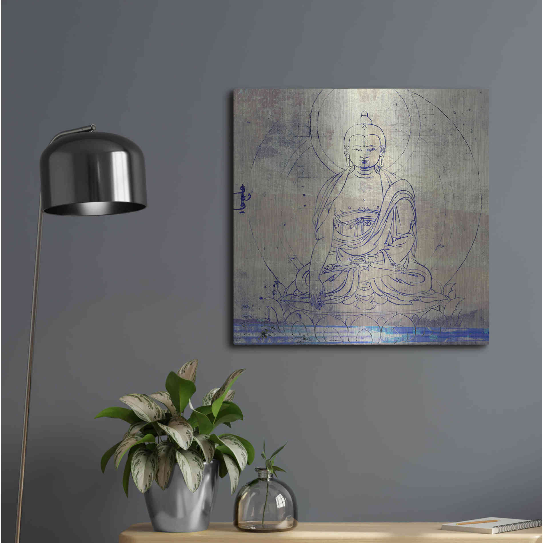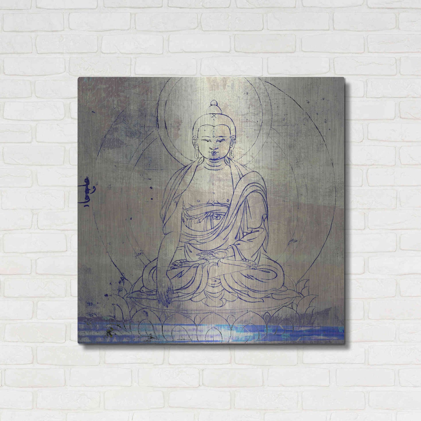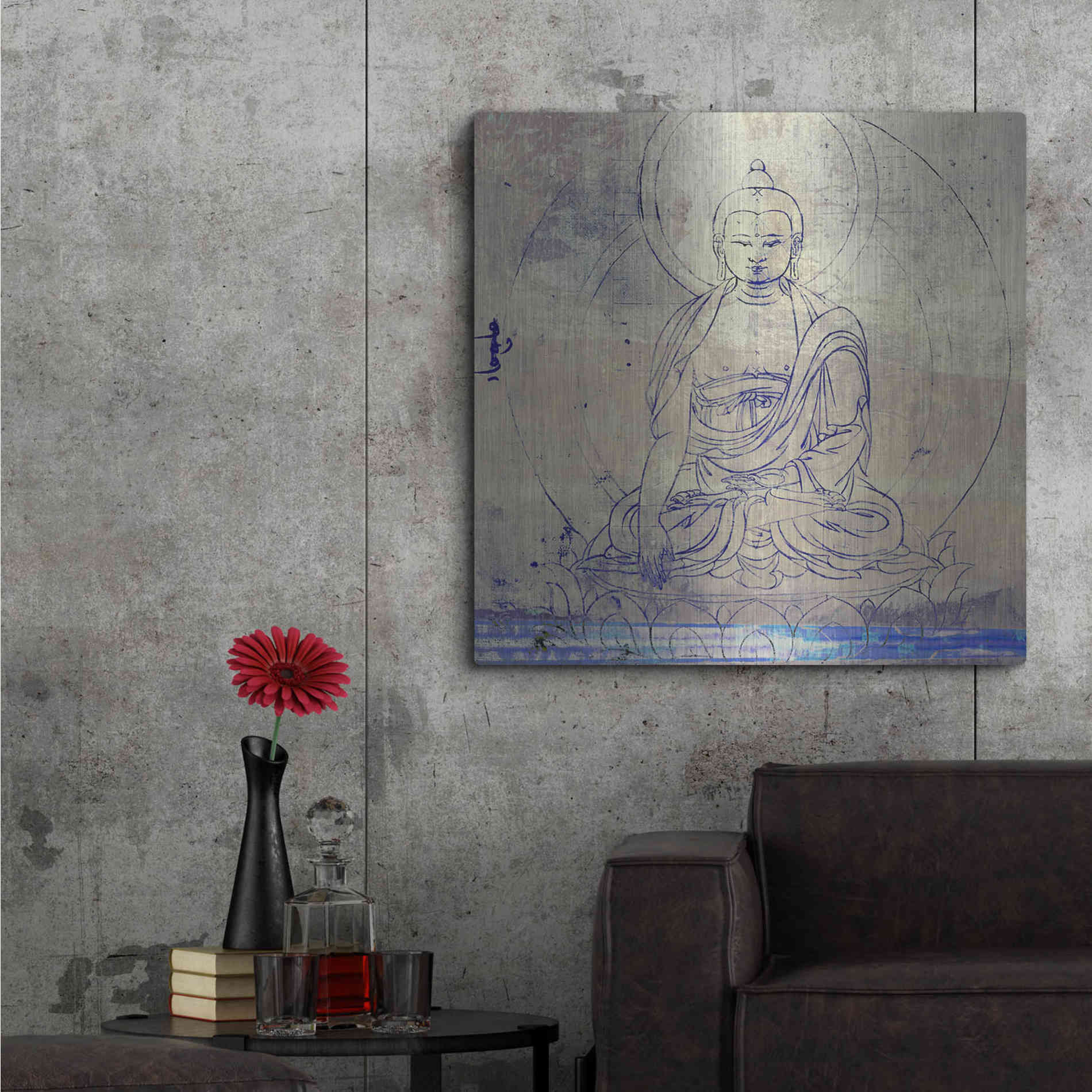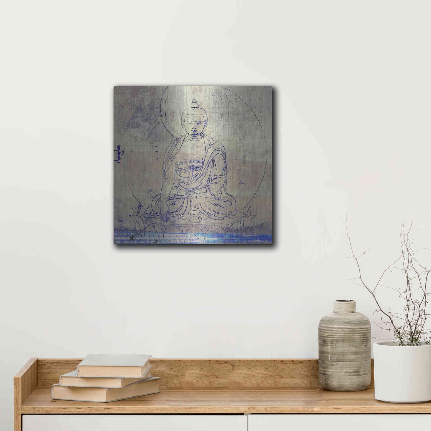 Luxe Metal Art 'Lotus Position' by Elena Ray, Metal Wall Art Featuring a digital illustration of an Asian deity on grunge background. Elena Ray is an artist exploring psychological revelation, spiritual unfolding, healing, and energy work with a foc