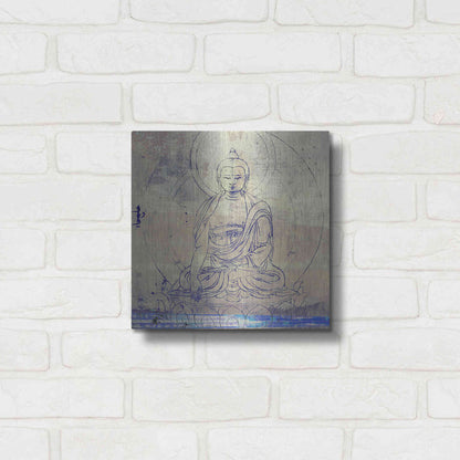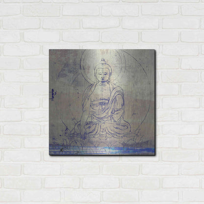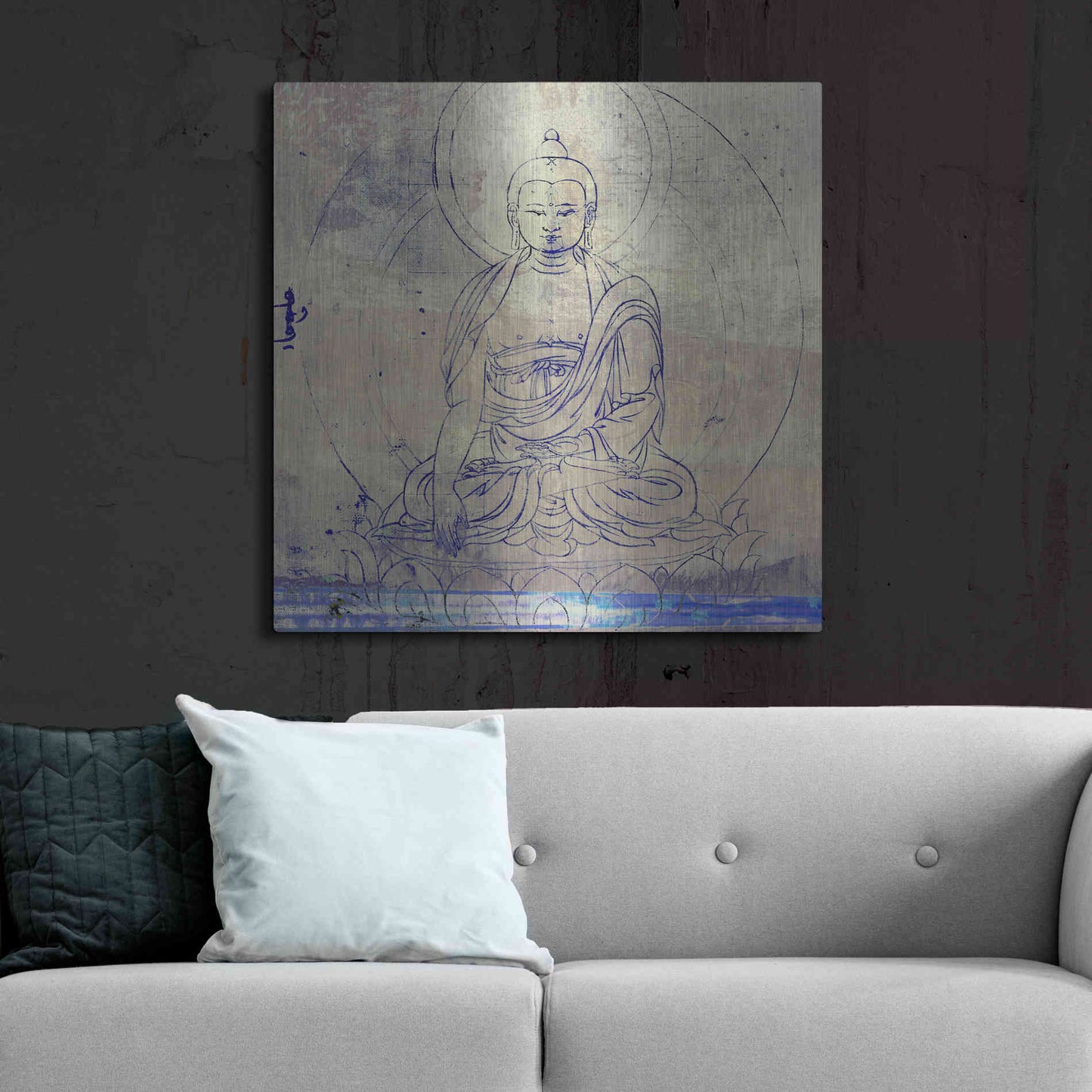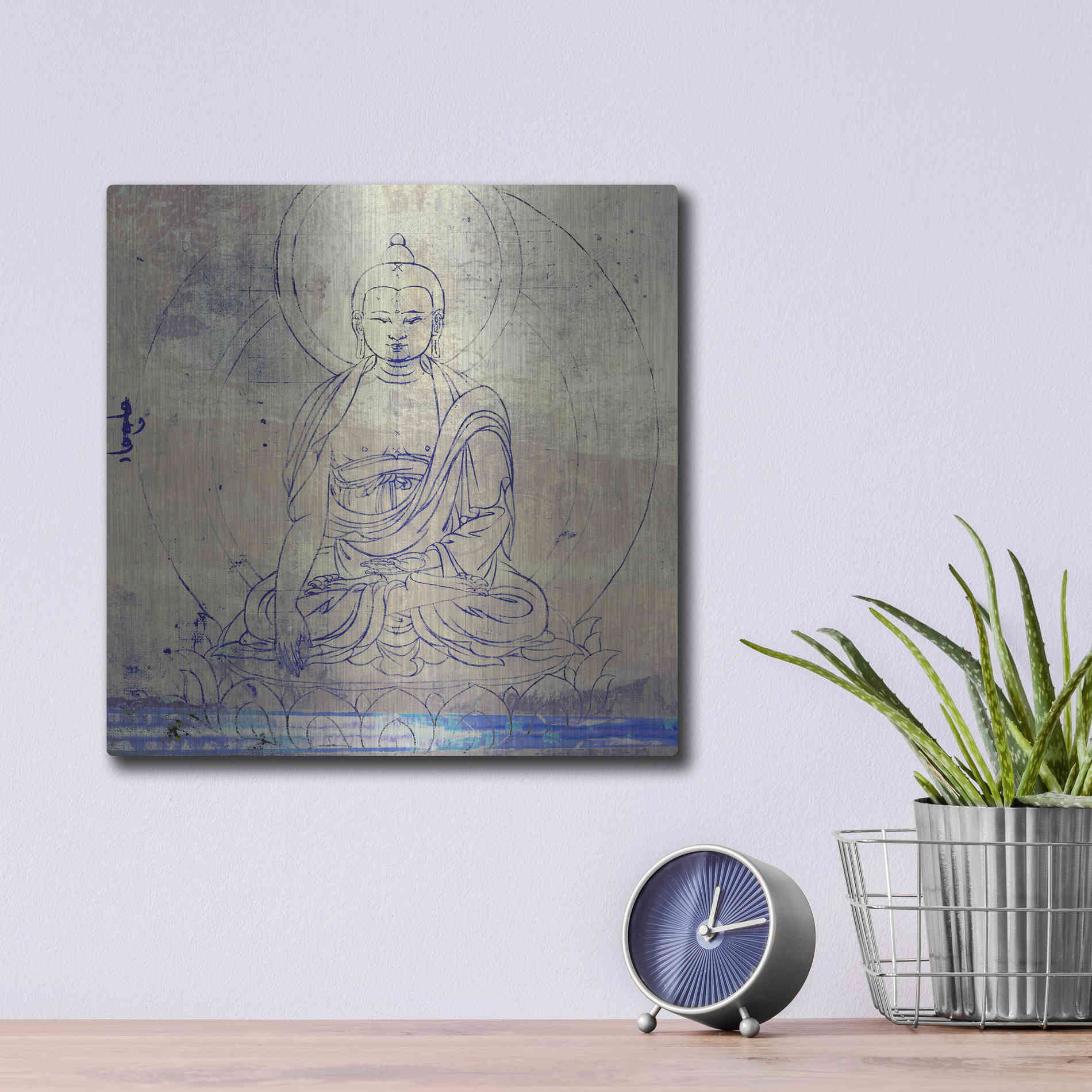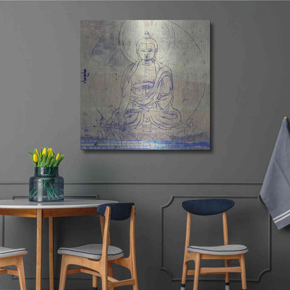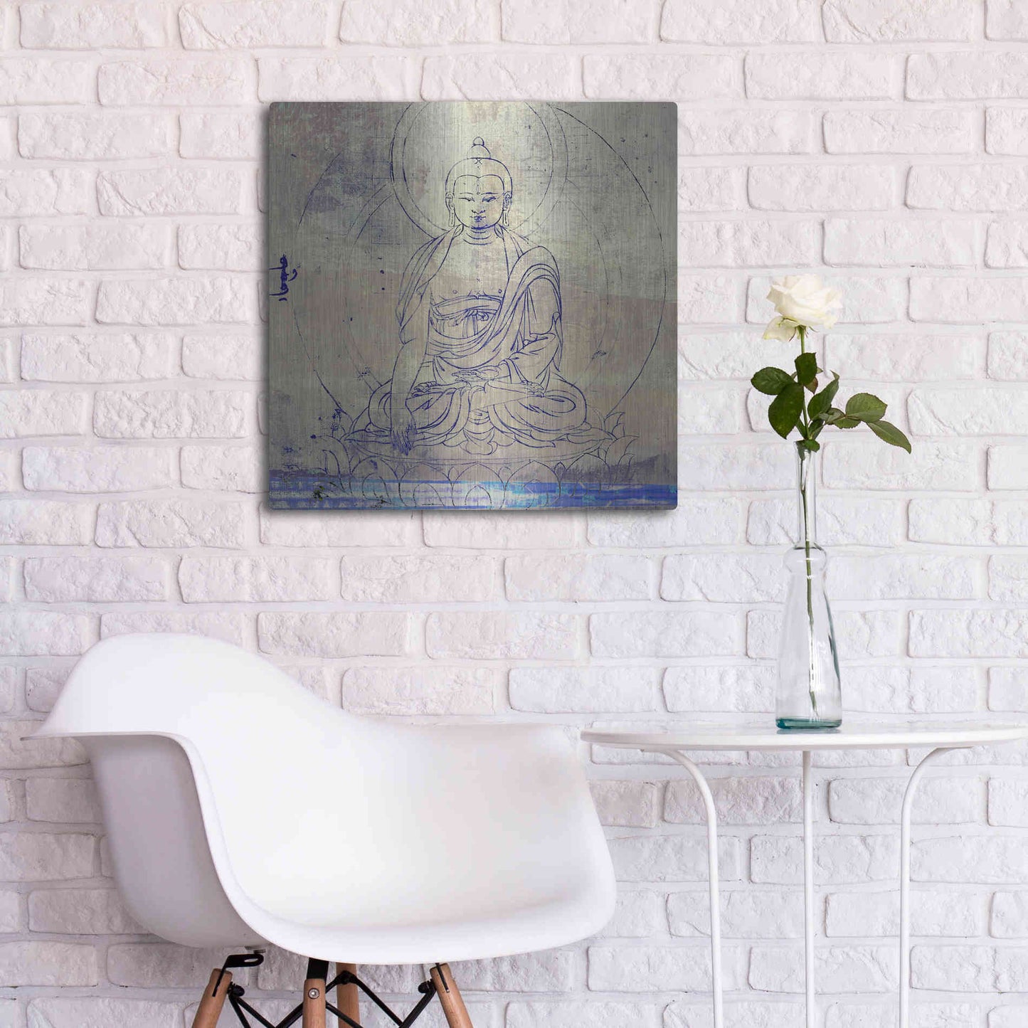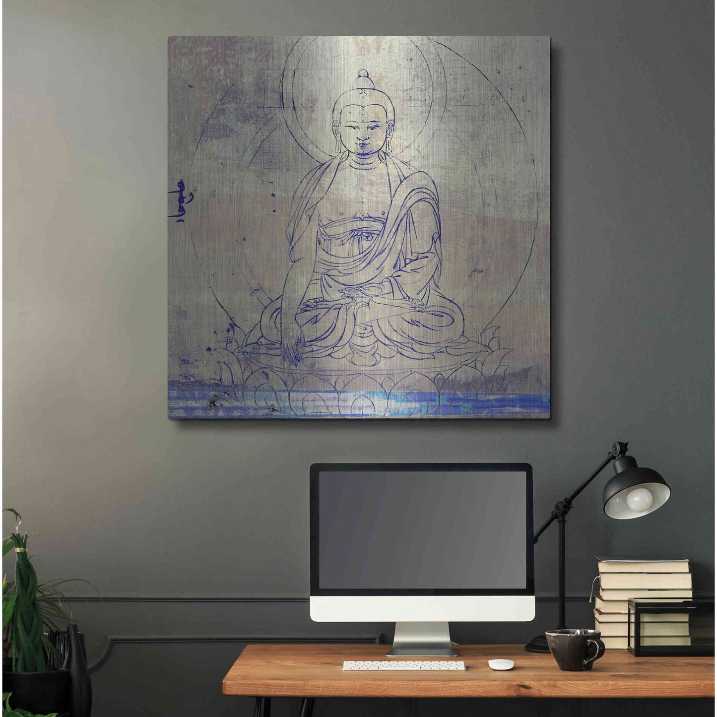 Luxe Metal Art 'Lotus Position' by Elena Ray, Metal Wall Art Featuring a digital illustration of an Asian deity on grunge background. Elena Ray is an artist exploring psychological revelation, spiritual unfolding, healing, and energy work with a foc