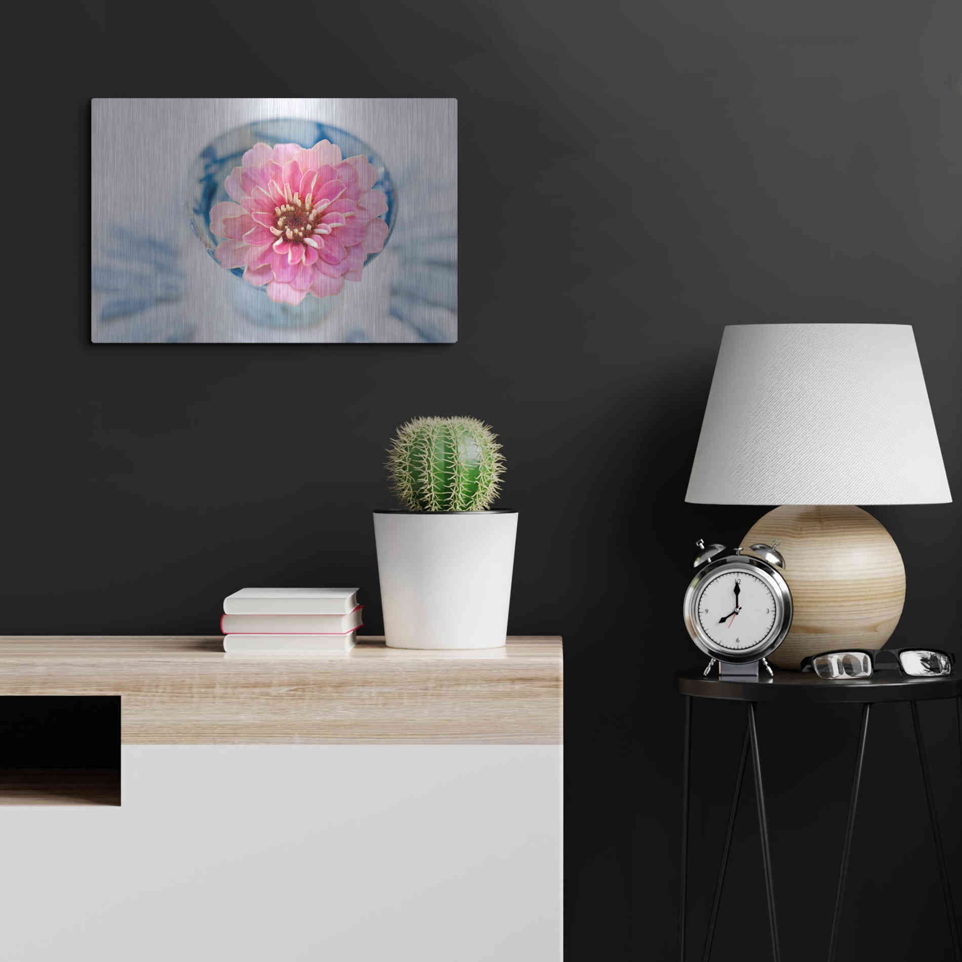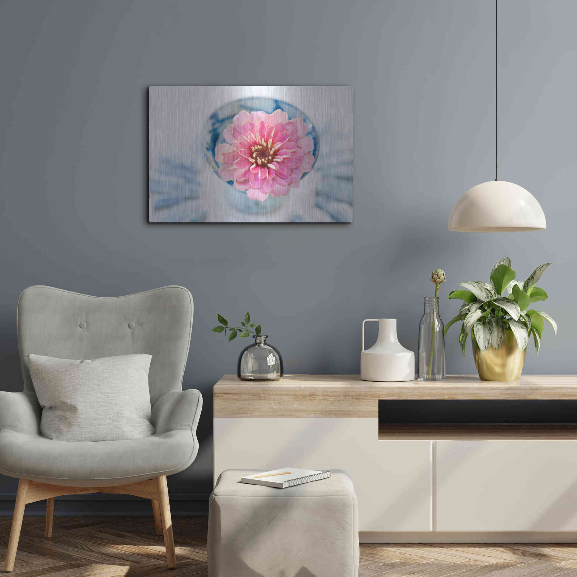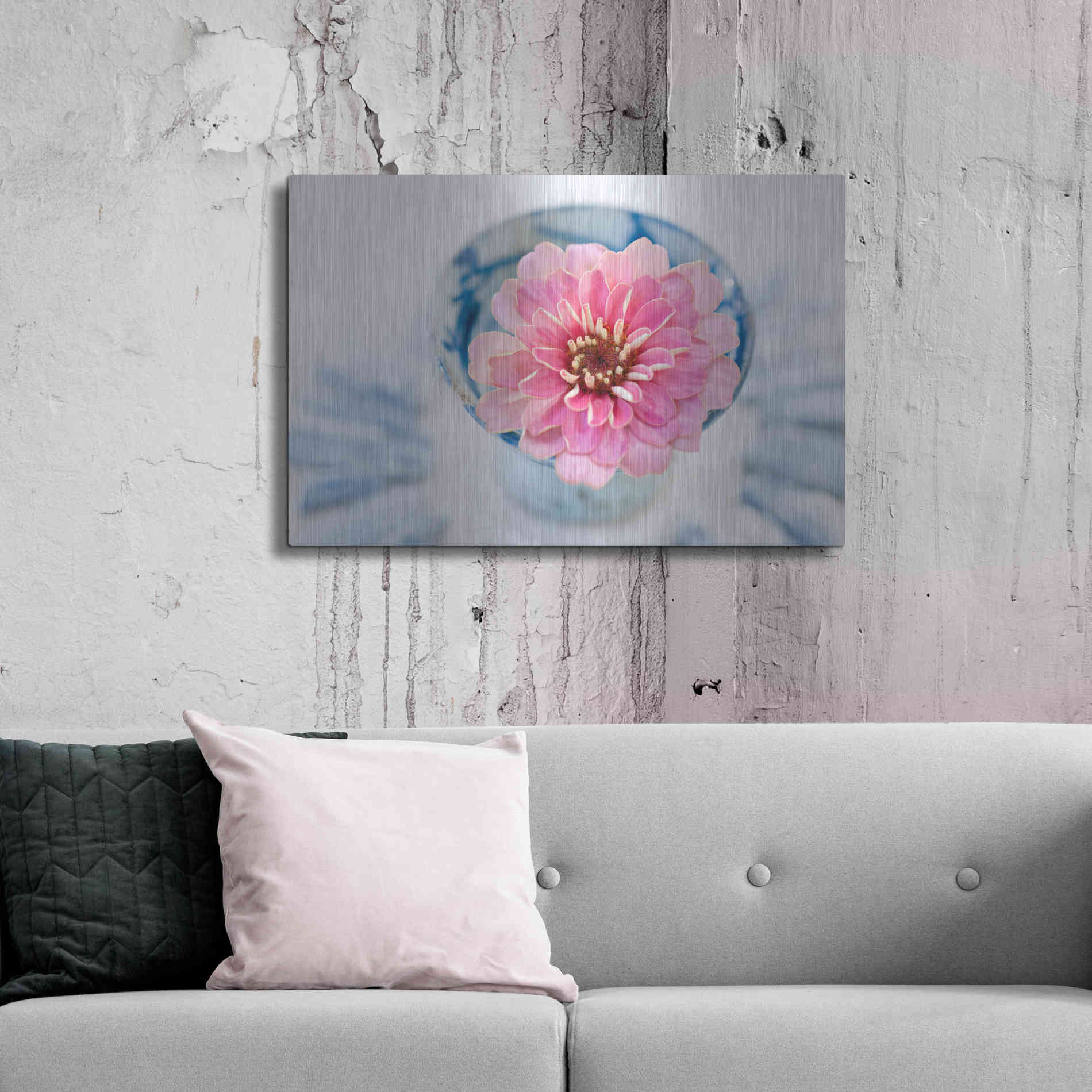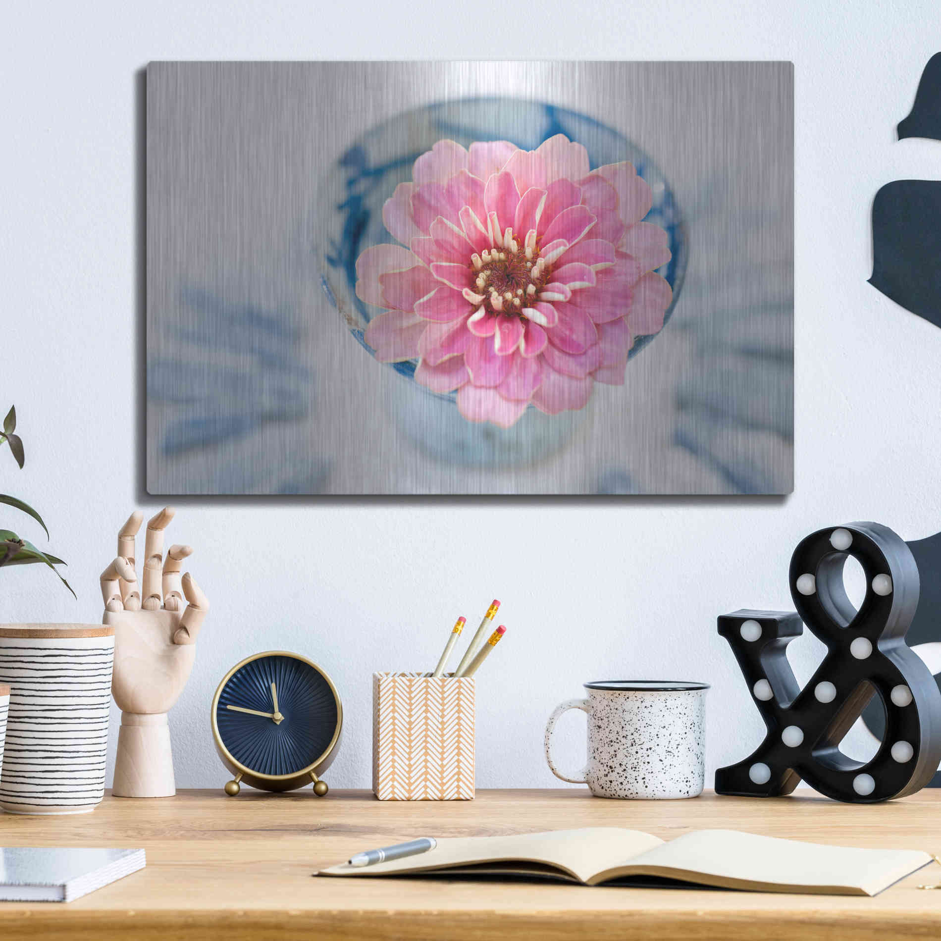 Luxe Metal Art 'Pink Flower in a sake Cup' by Elena Ray, Metal Wall Art Featuring a Buddha sailboat resting in a tranquil blue lagoon. Elena Ray is an artist exploring psychological revelation, spiritual unfolding, healing, and energy work with a fo