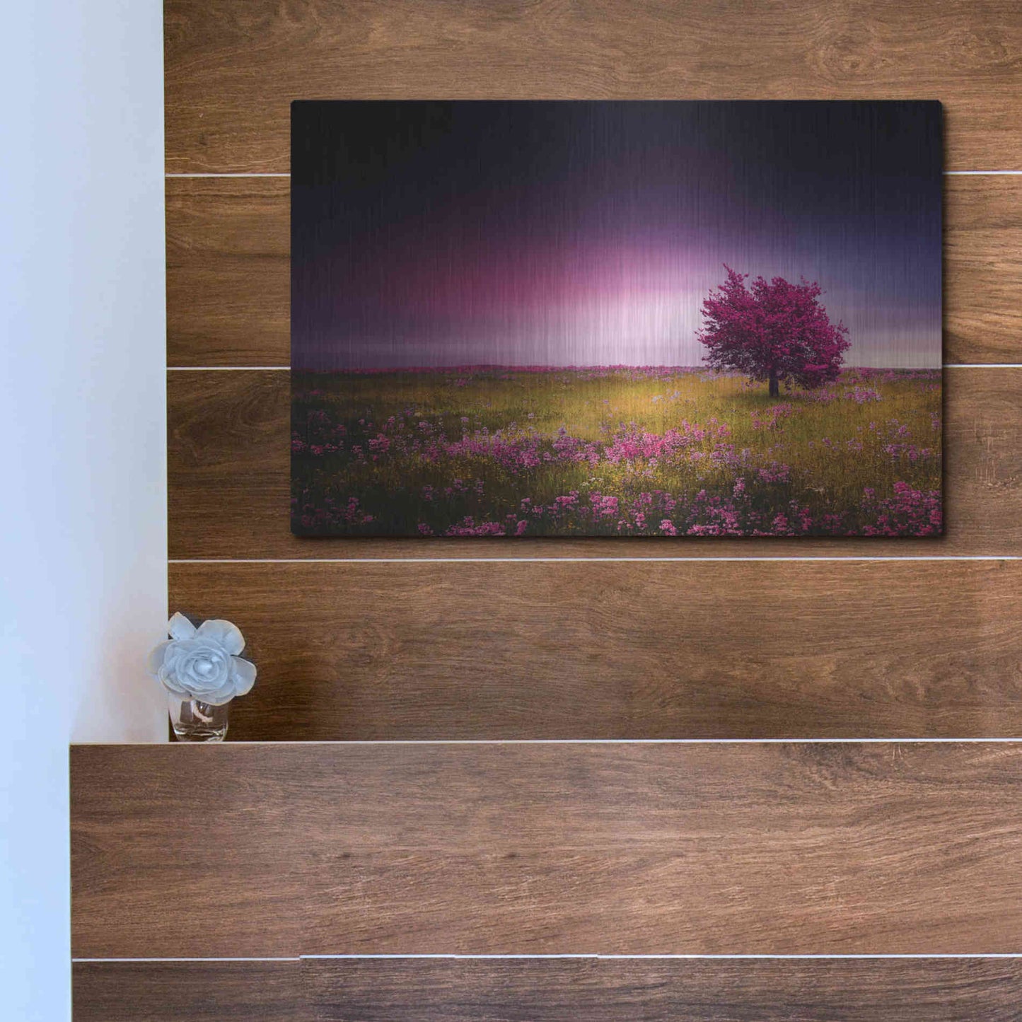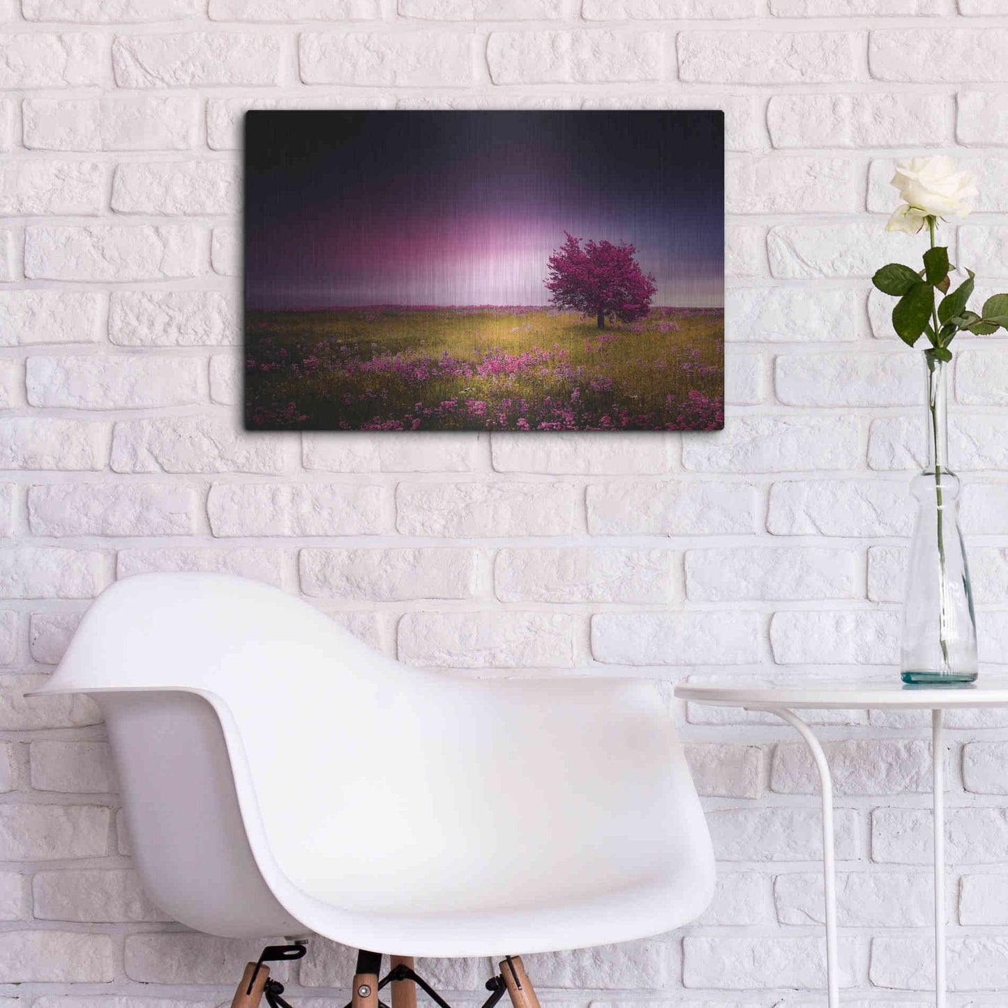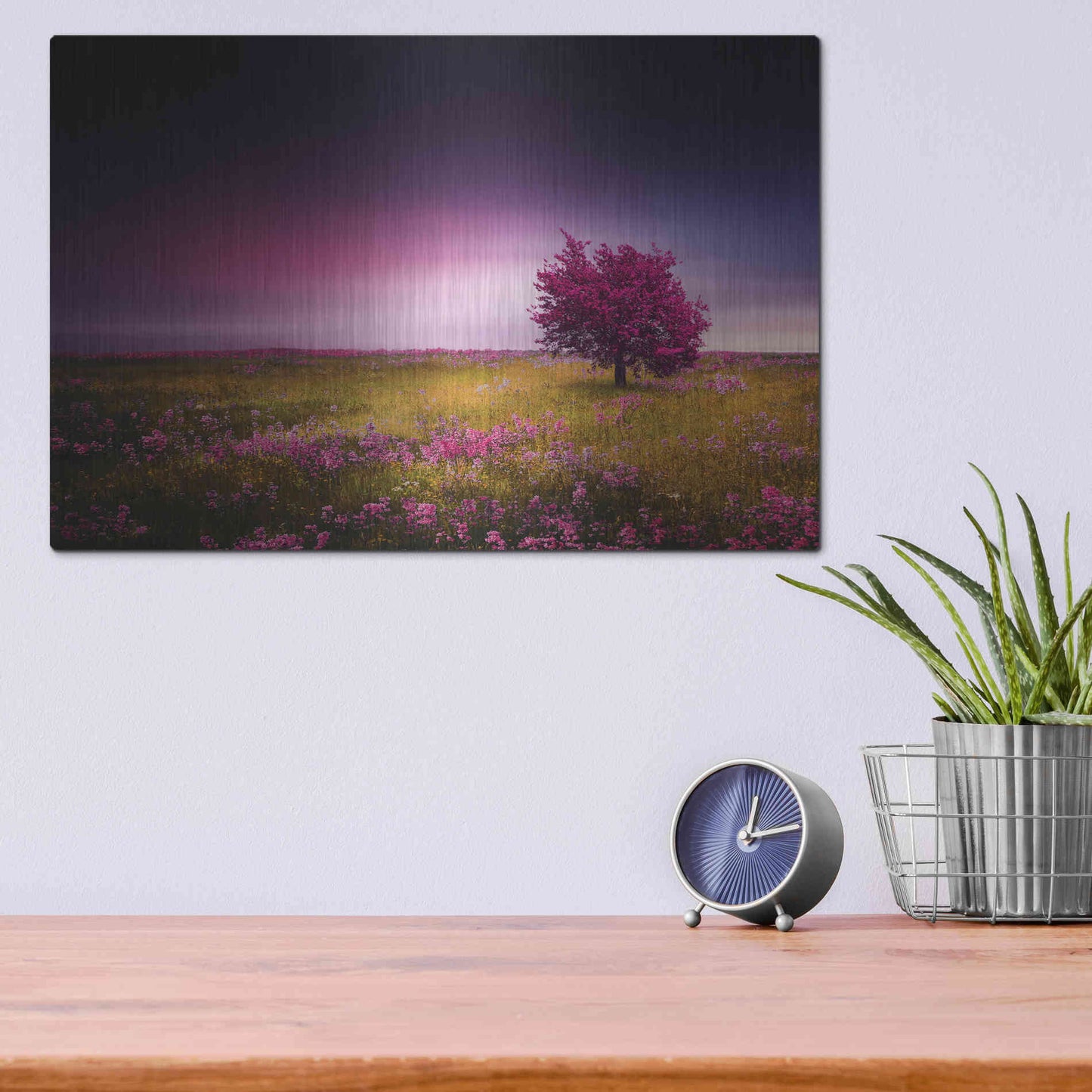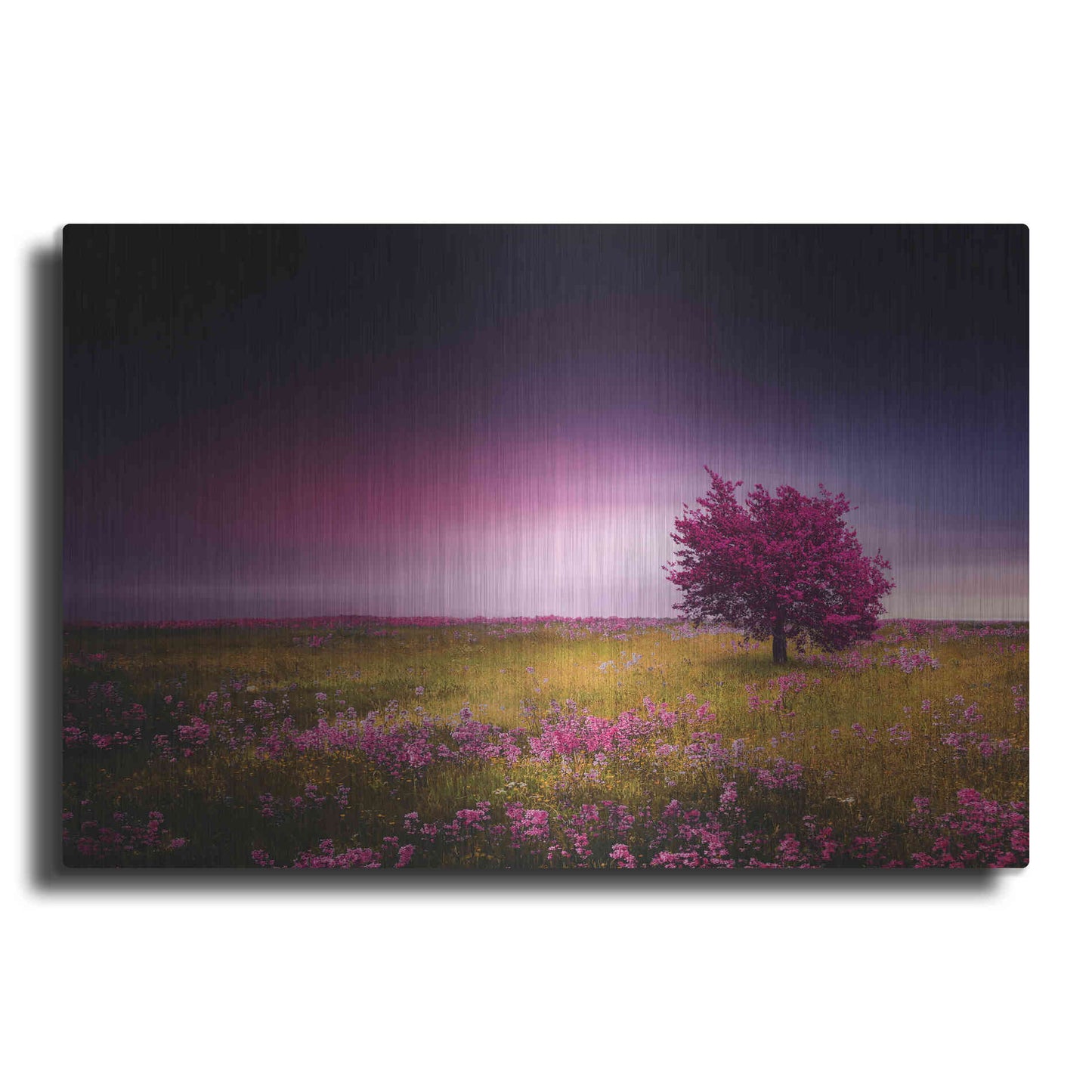 Luxe Metal Art 'Pink Nights', Metal Wall Art Featuring a tree in a field of flowers bathed in a beautiful sky.
