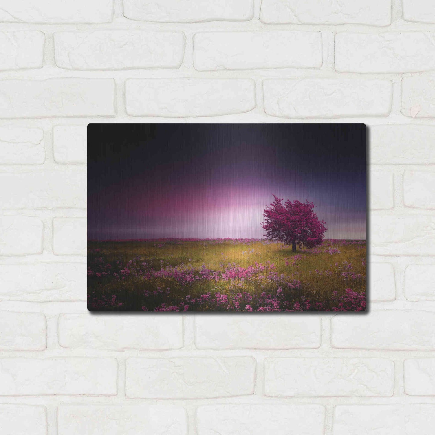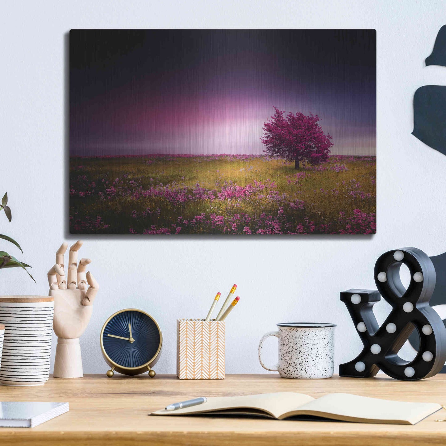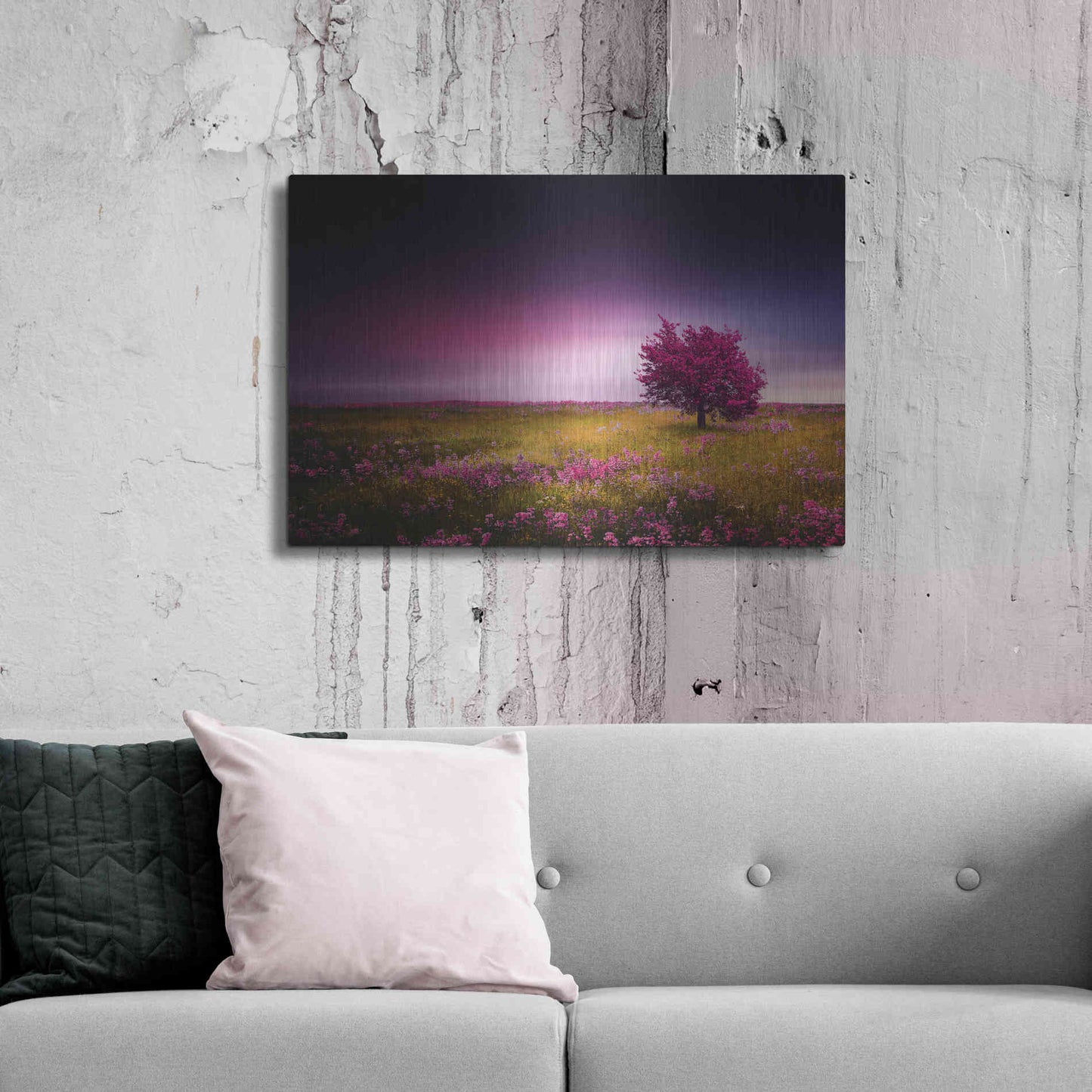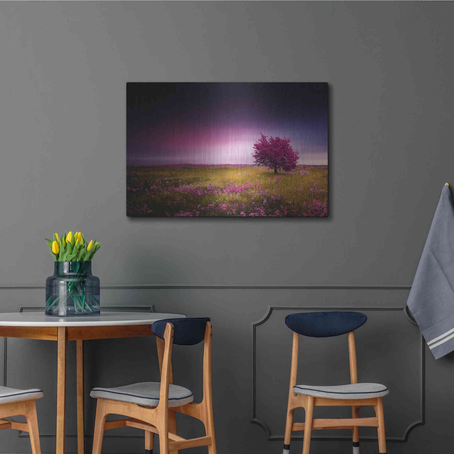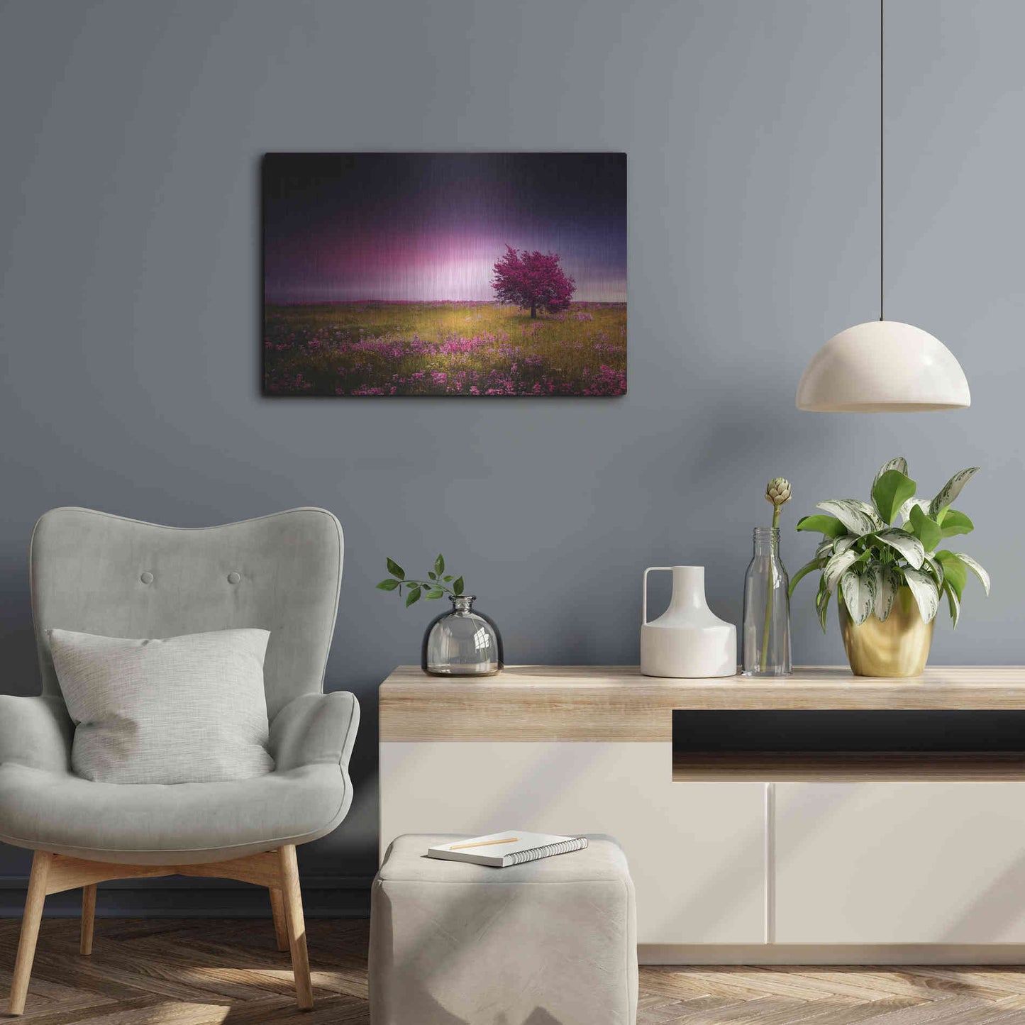 Luxe Metal Art 'Pink Nights', Metal Wall Art Featuring a tree in a field of flowers bathed in a beautiful sky.
