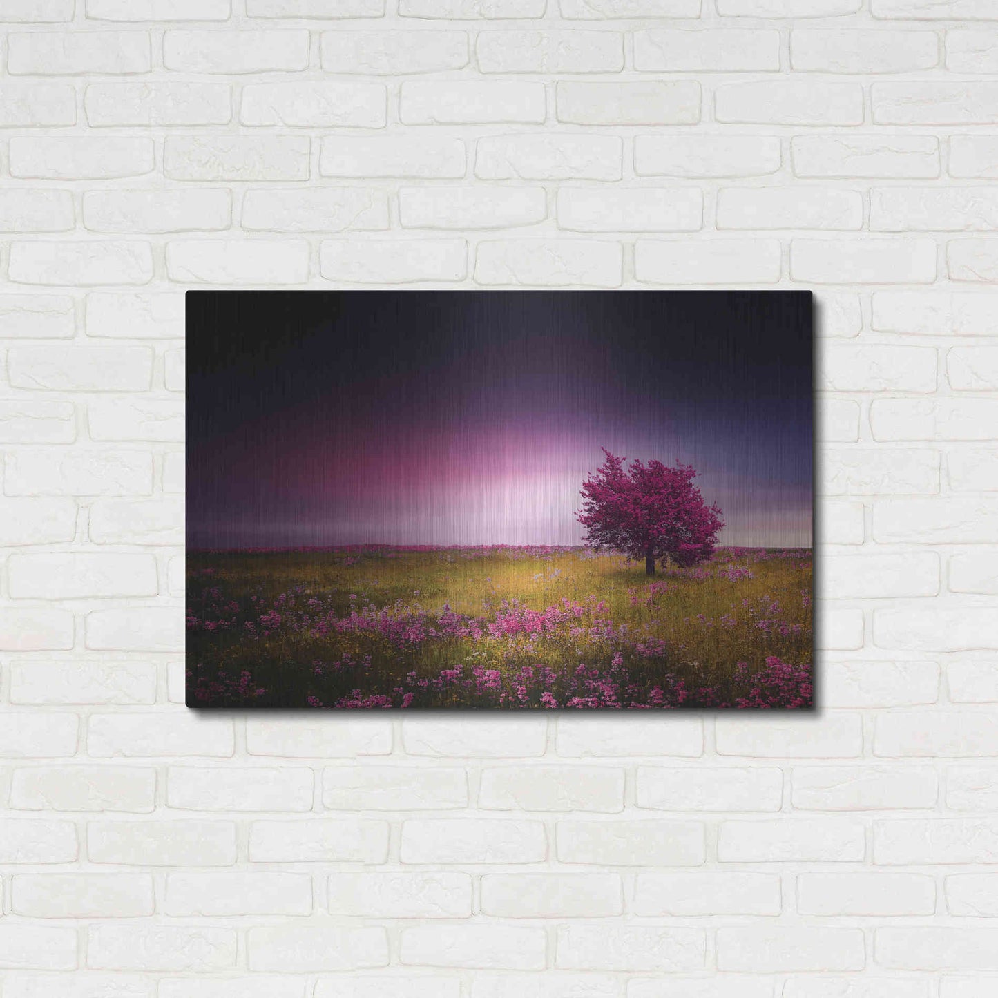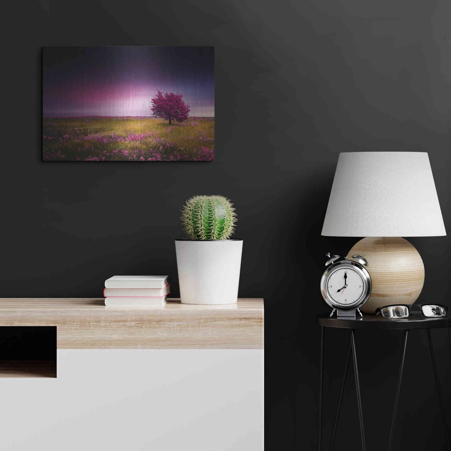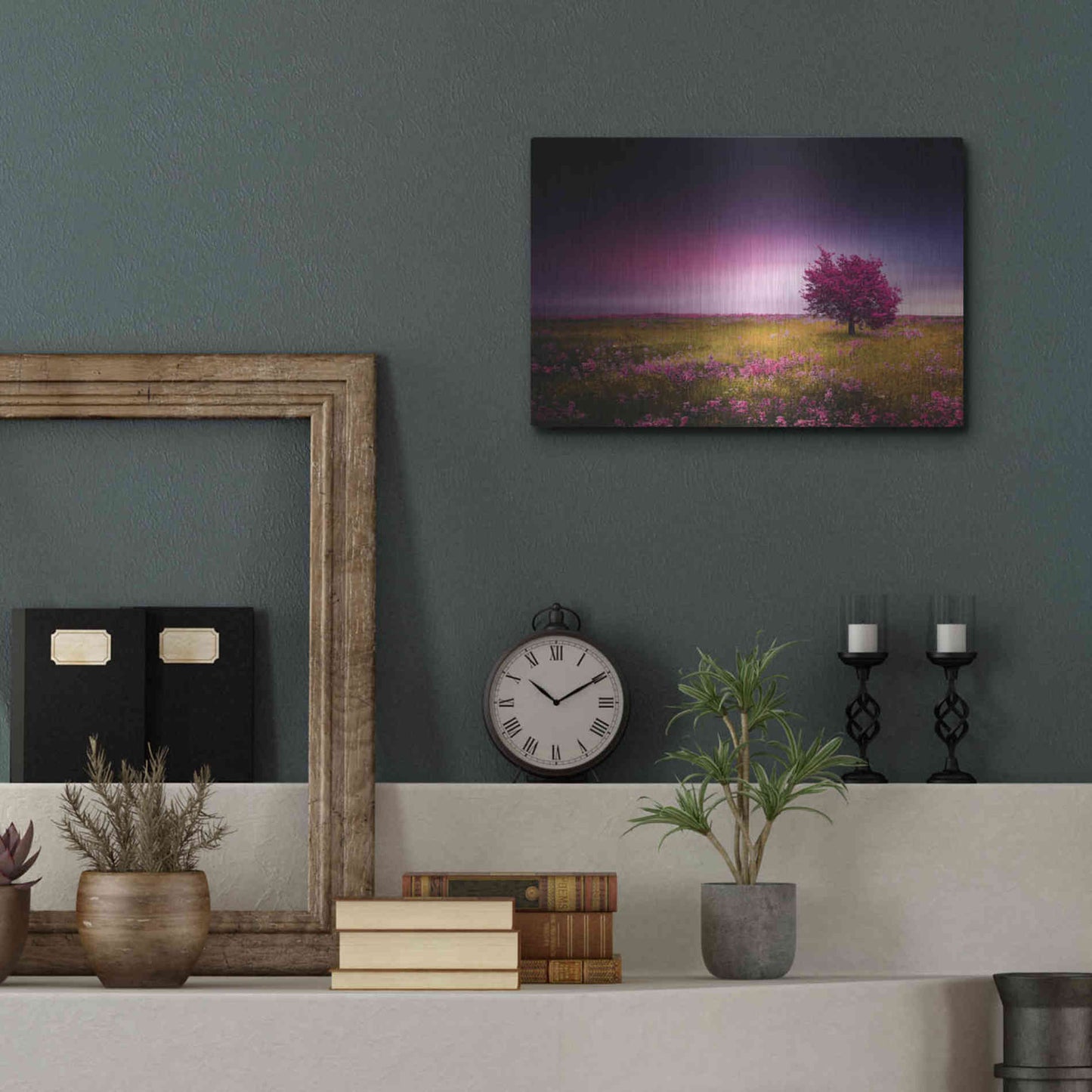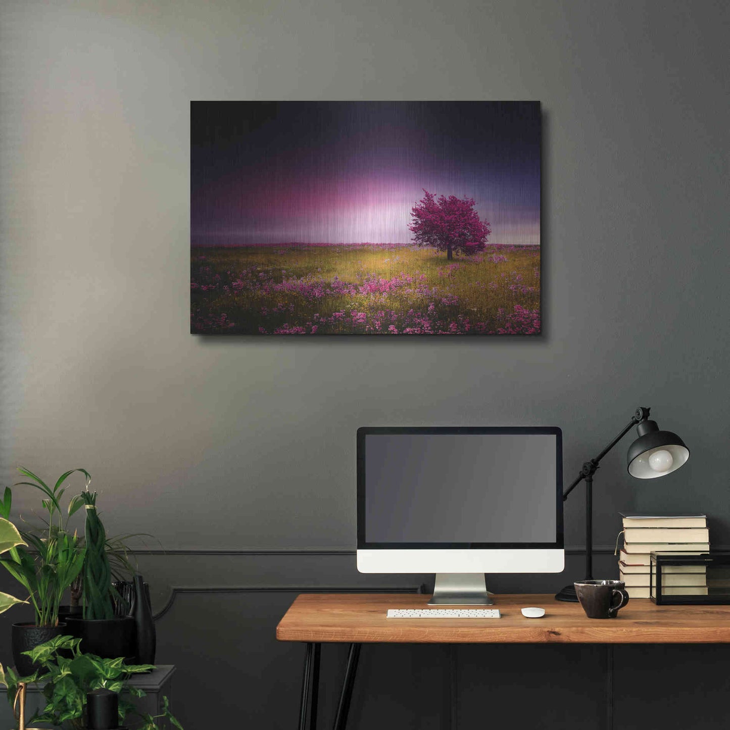 Luxe Metal Art 'Pink Nights', Metal Wall Art Featuring a tree in a field of flowers bathed in a beautiful sky.