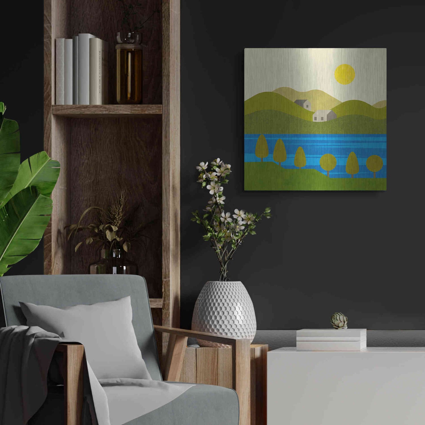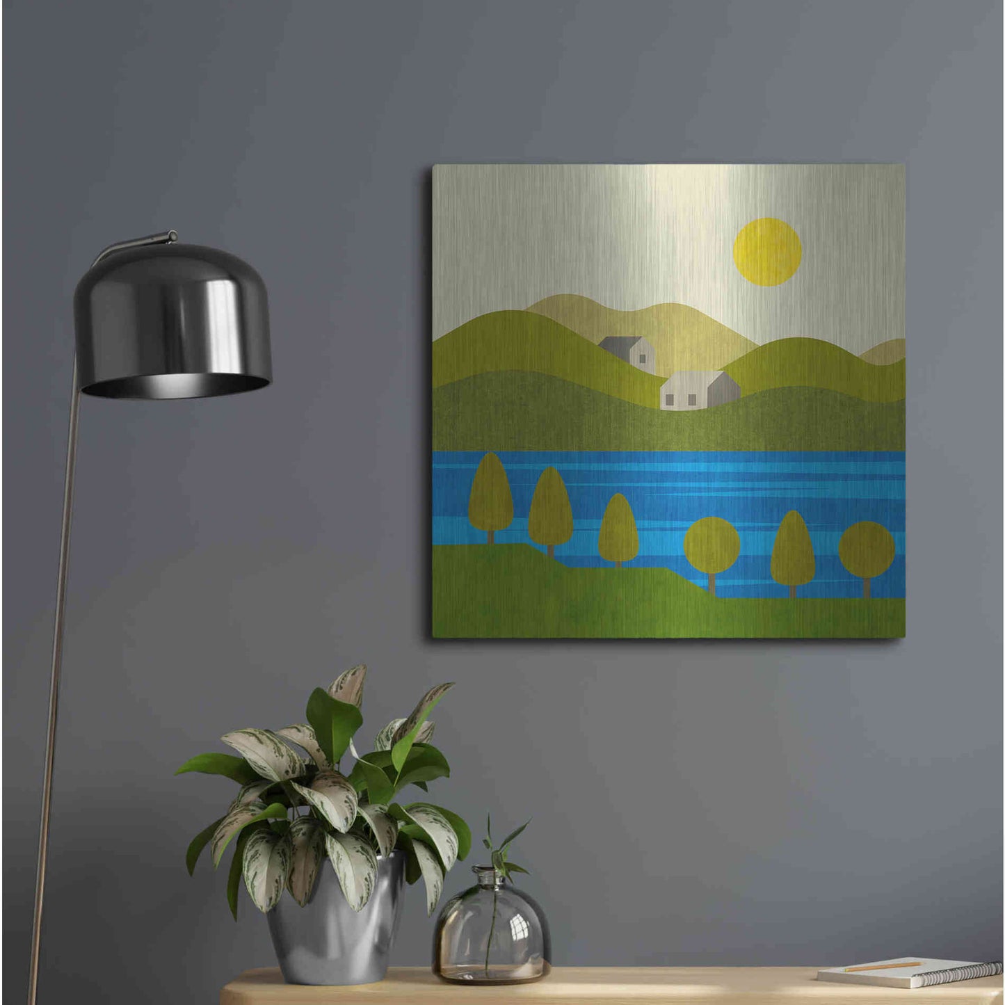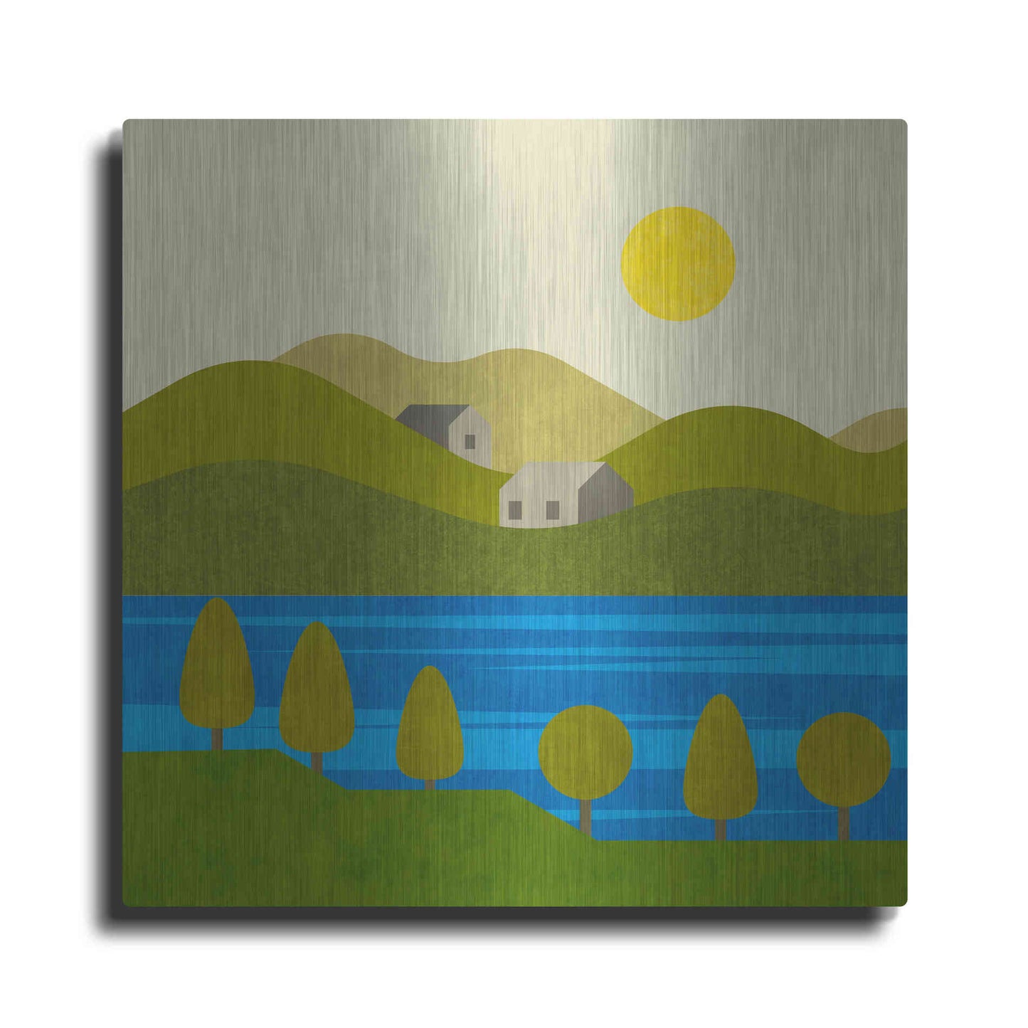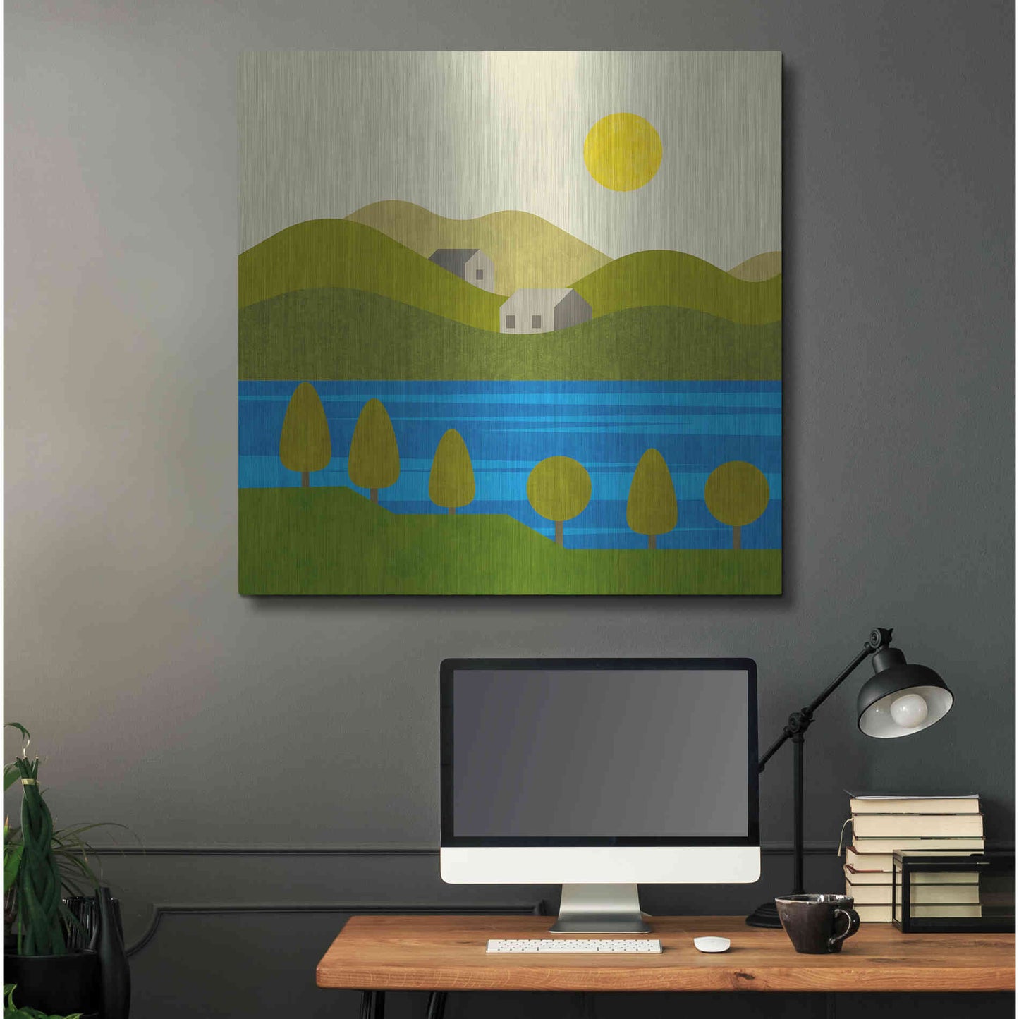 Luxe Metal Art 'River View' by Andrea Haase, Metal Wall Art. Featuring peaceful, idyllic landscape with two houses , water and green hills in minimalist graphics with light texture .