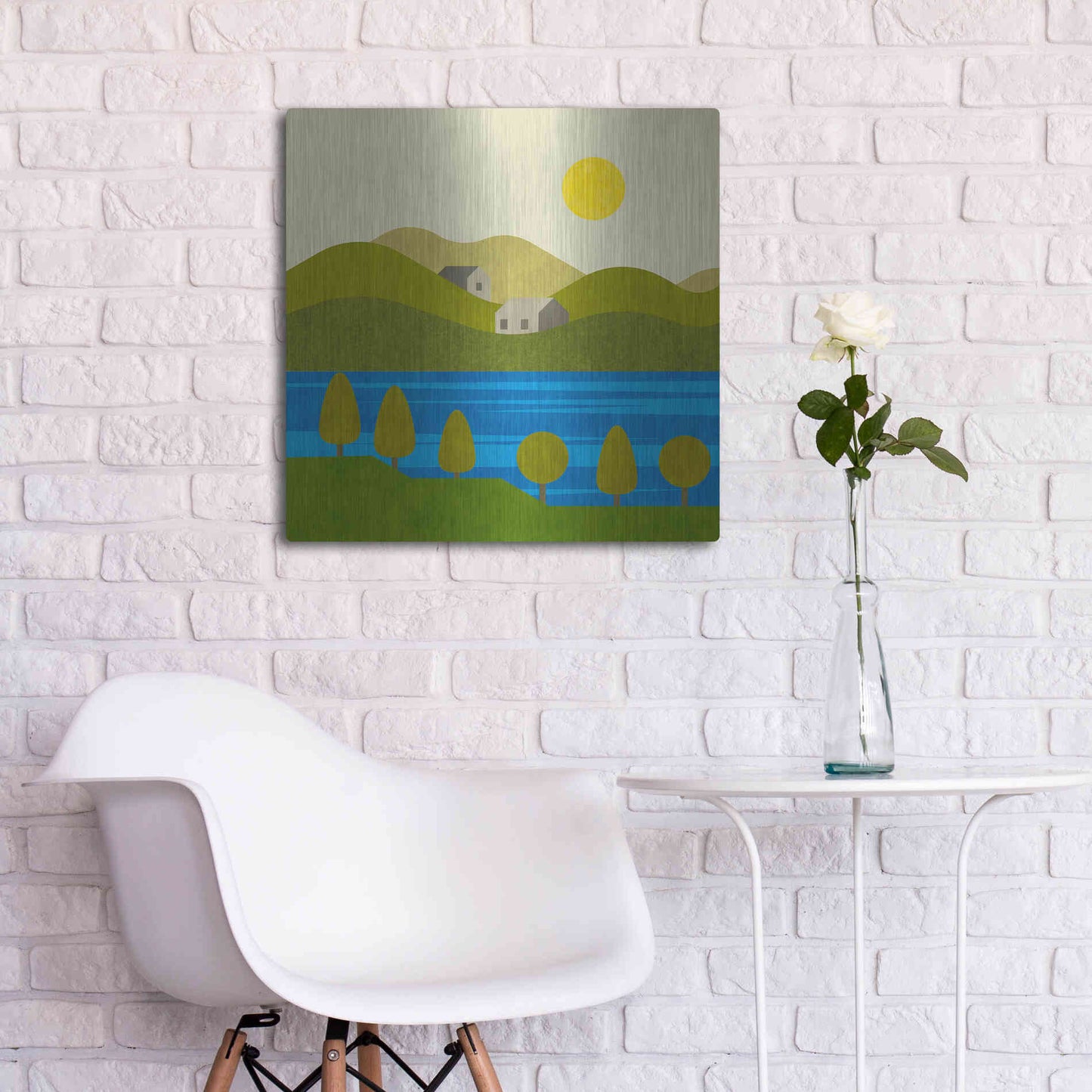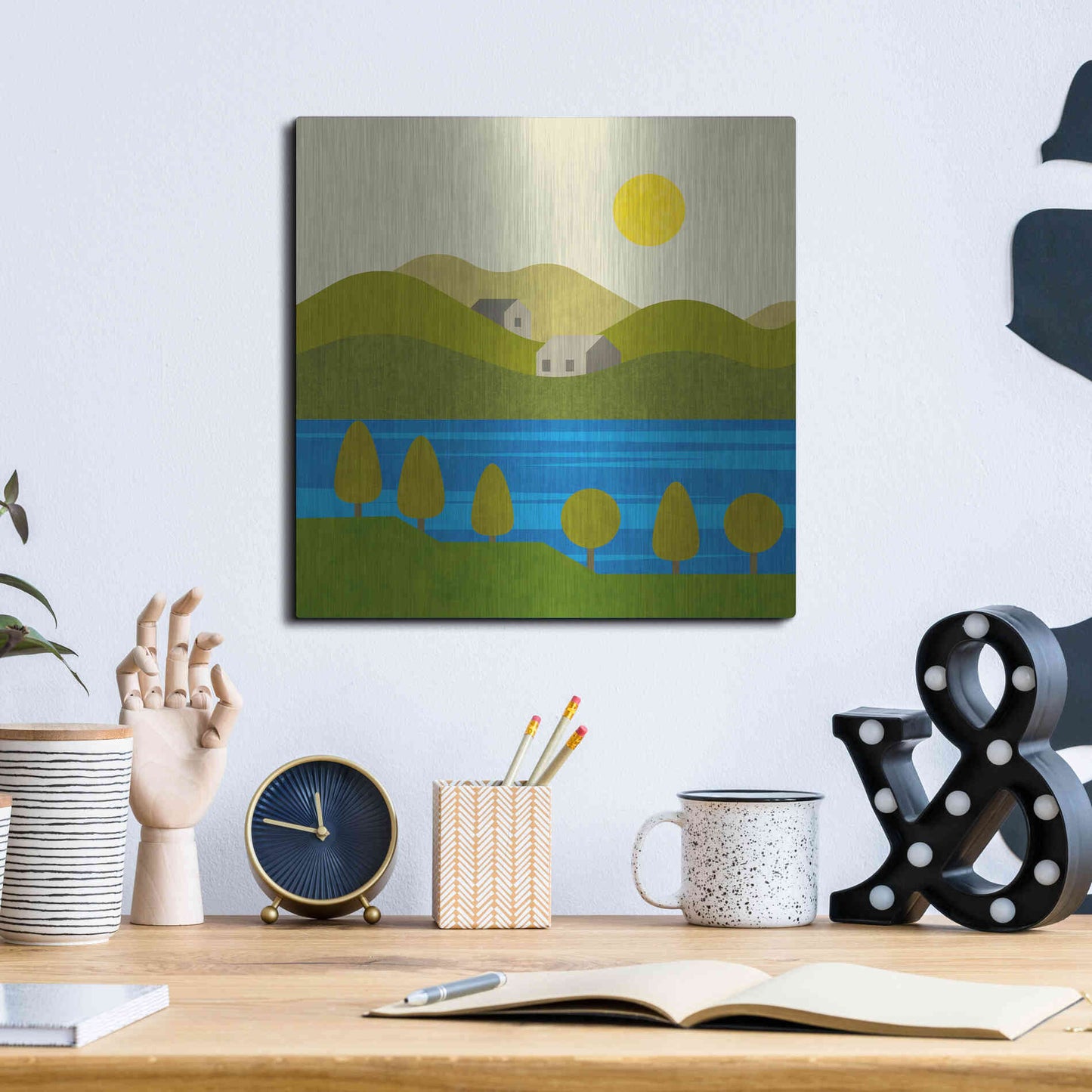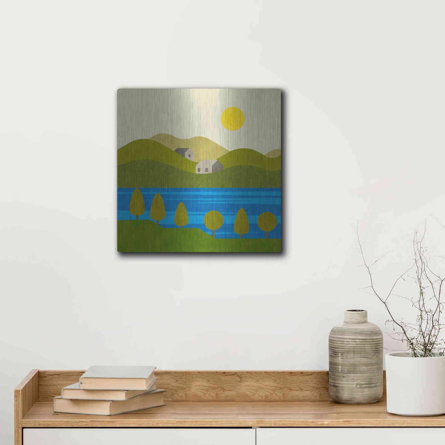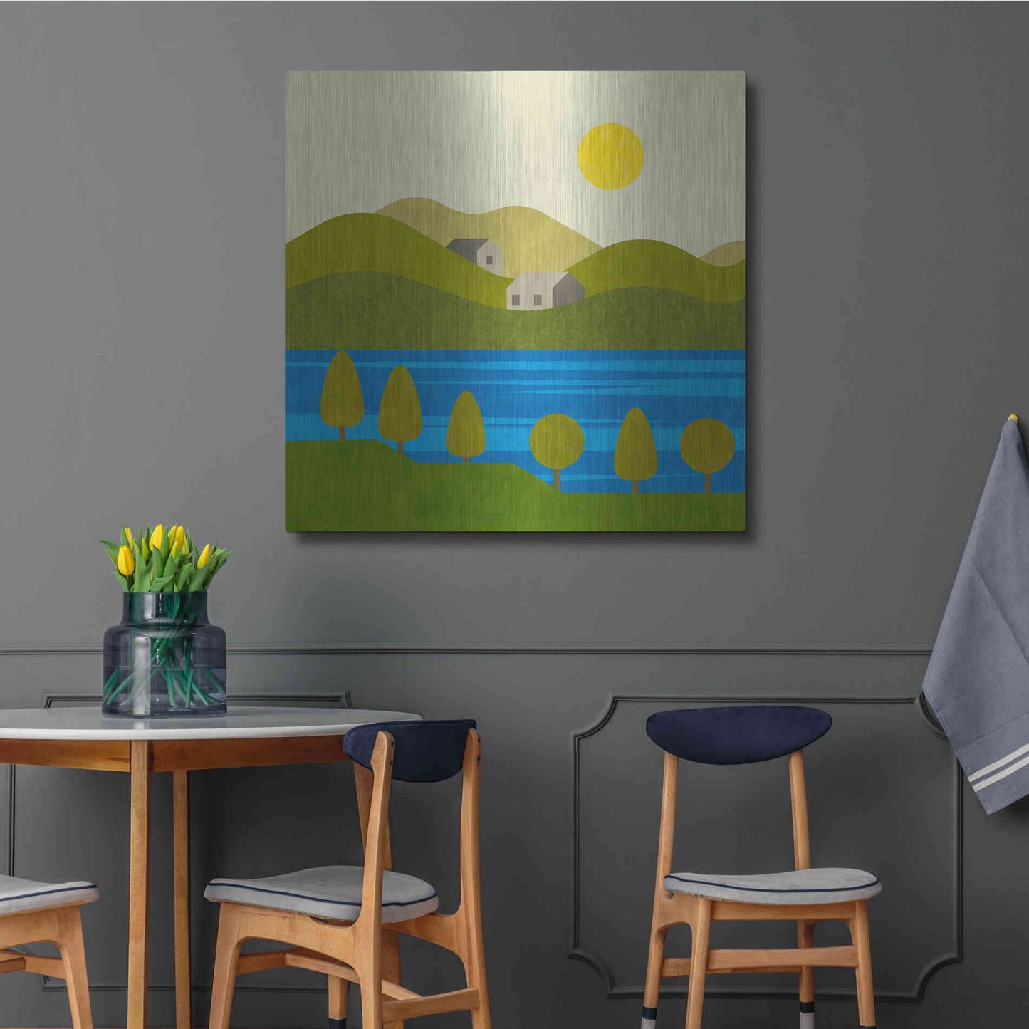 Luxe Metal Art 'River View' by Andrea Haase, Metal Wall Art. Featuring peaceful, idyllic landscape with two houses , water and green hills in minimalist graphics with light texture .