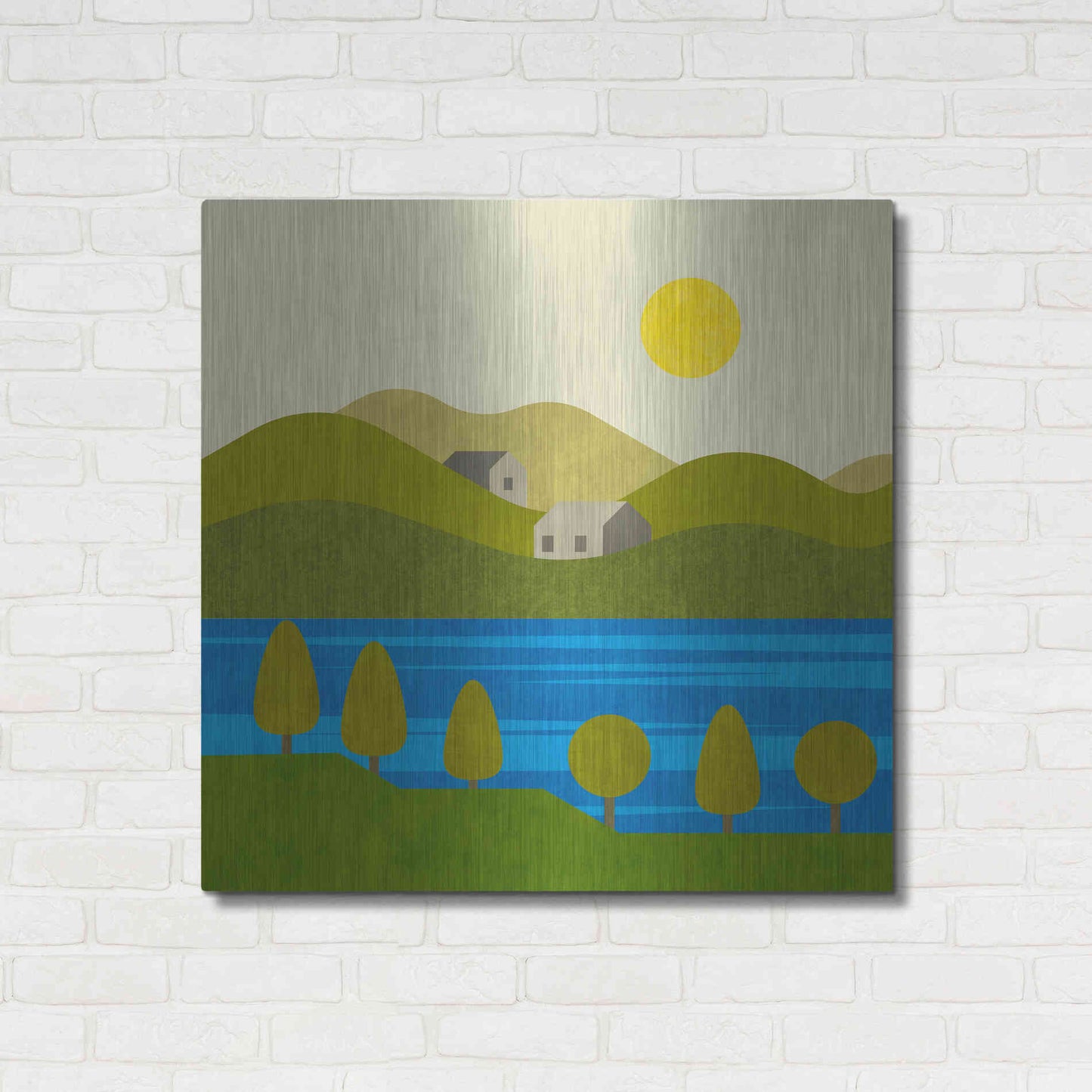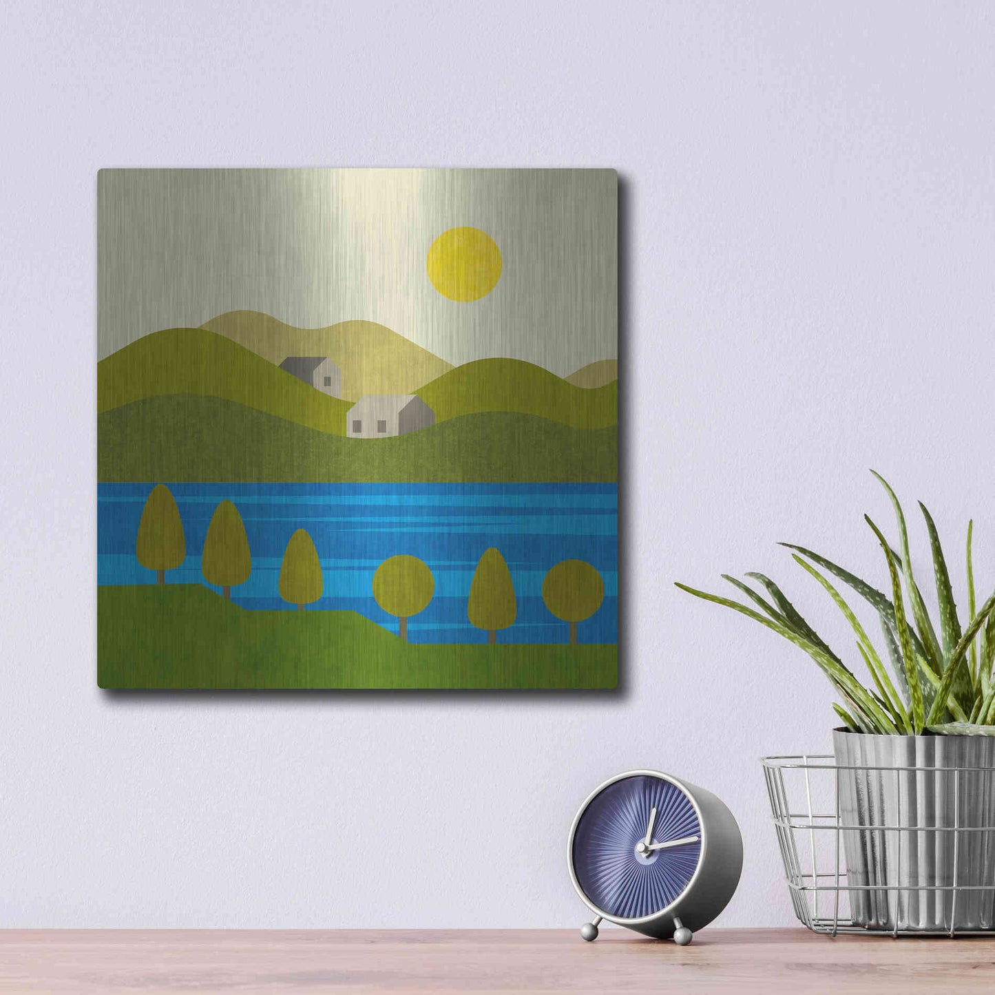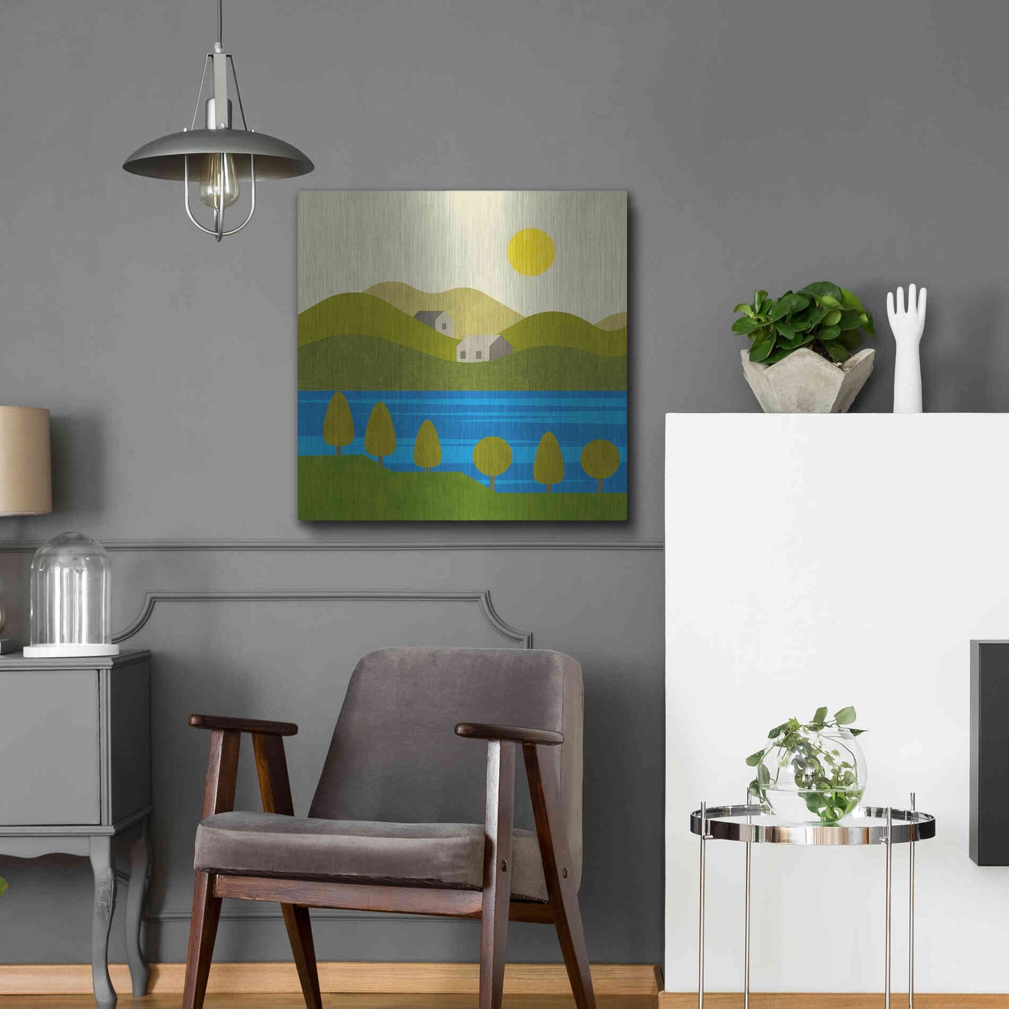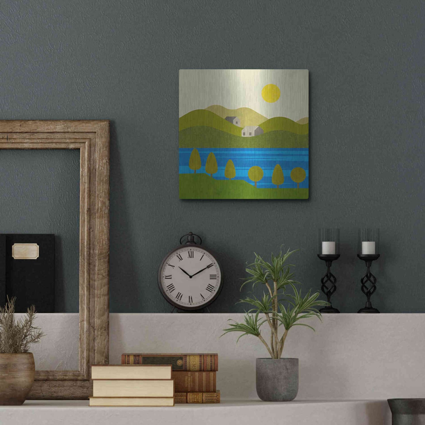 Luxe Metal Art 'River View' by Andrea Haase, Metal Wall Art. Featuring peaceful, idyllic landscape with two houses , water and green hills in minimalist graphics with light texture .