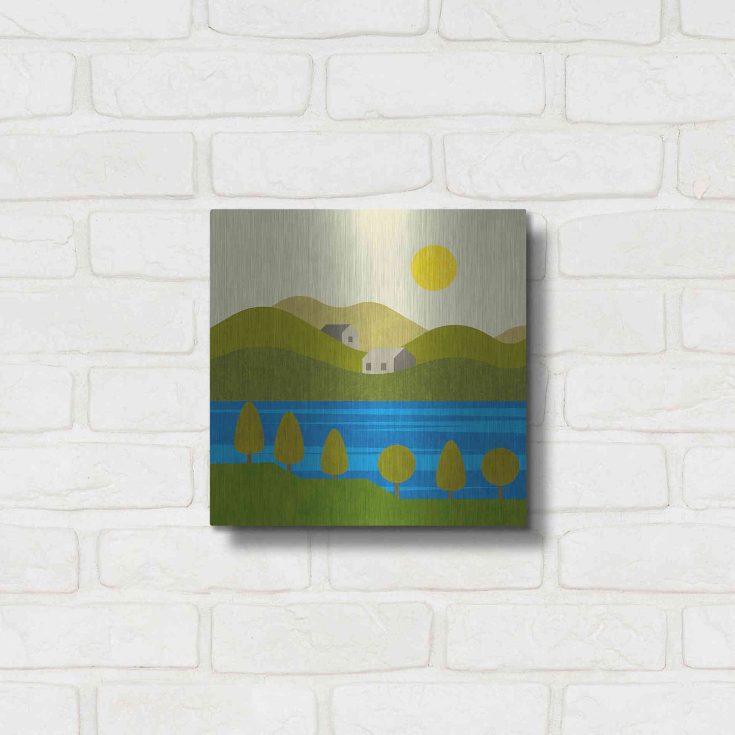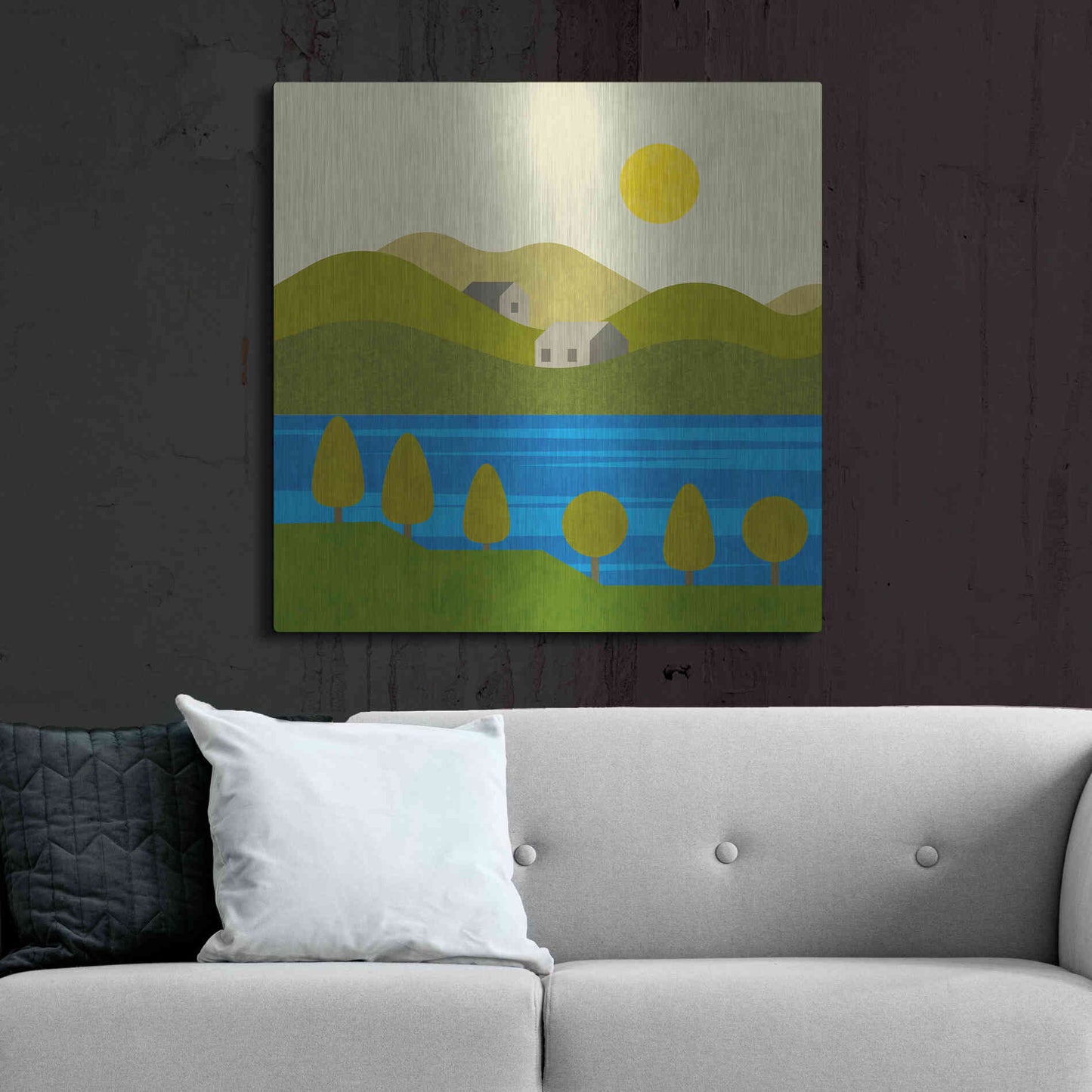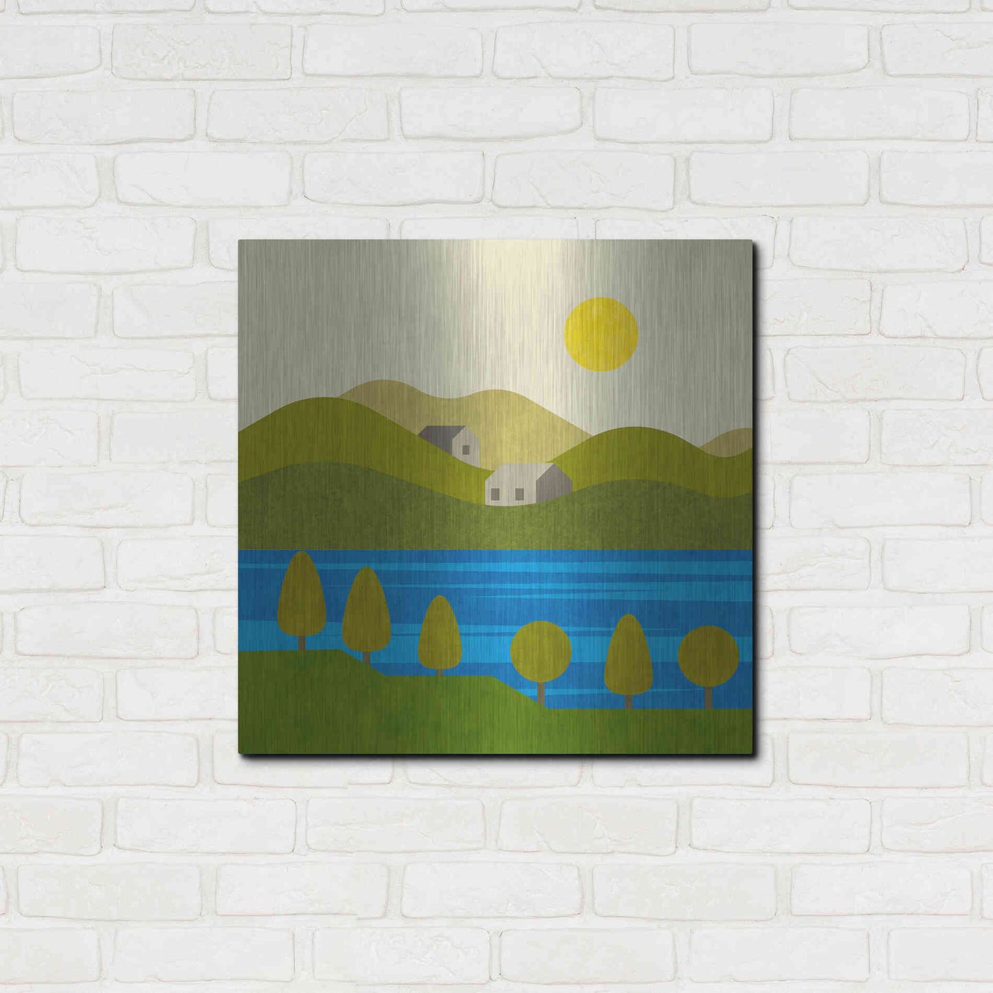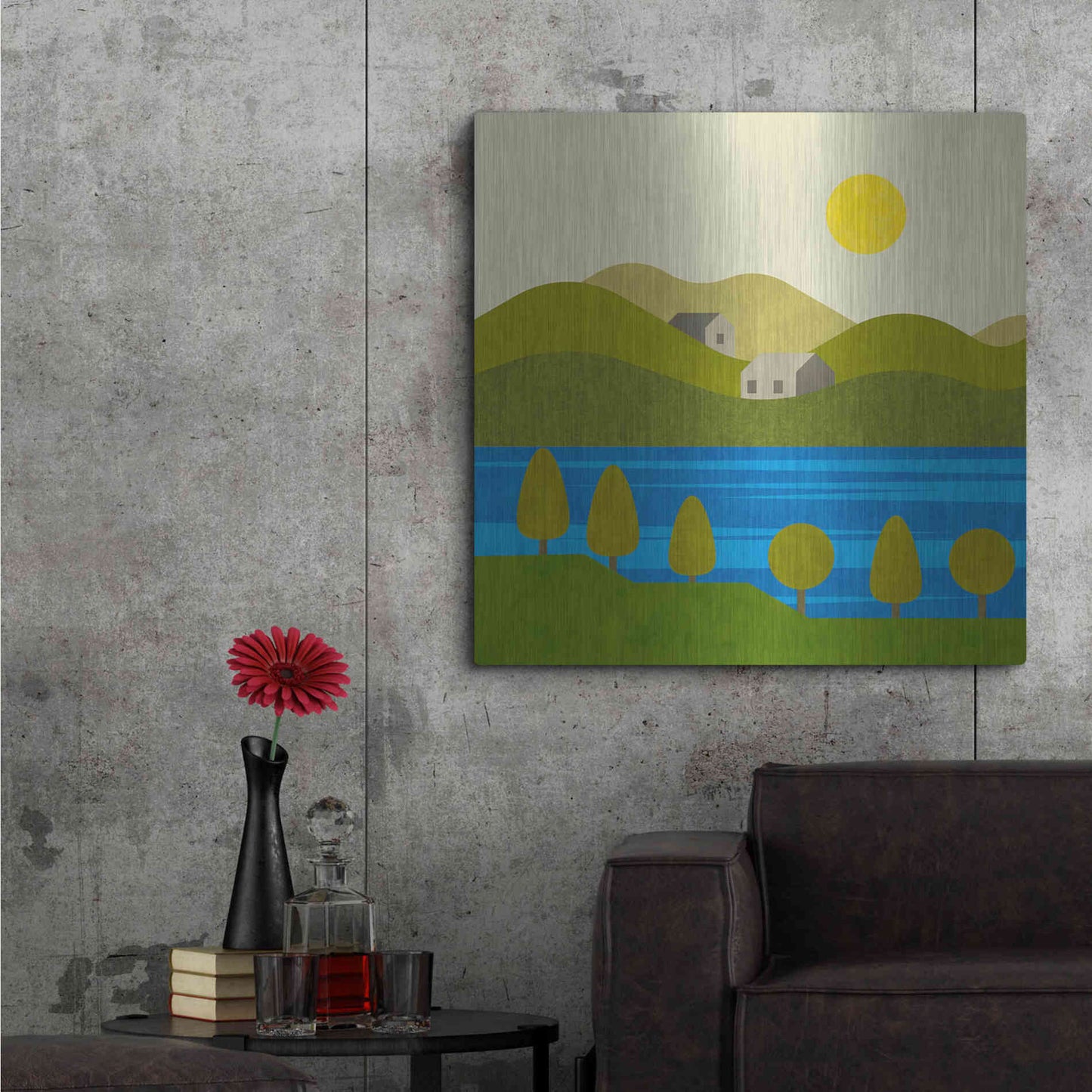 Luxe Metal Art 'River View' by Andrea Haase, Metal Wall Art. Featuring peaceful, idyllic landscape with two houses , water and green hills in minimalist graphics with light texture .