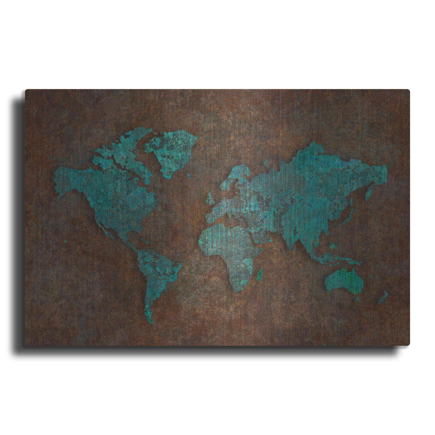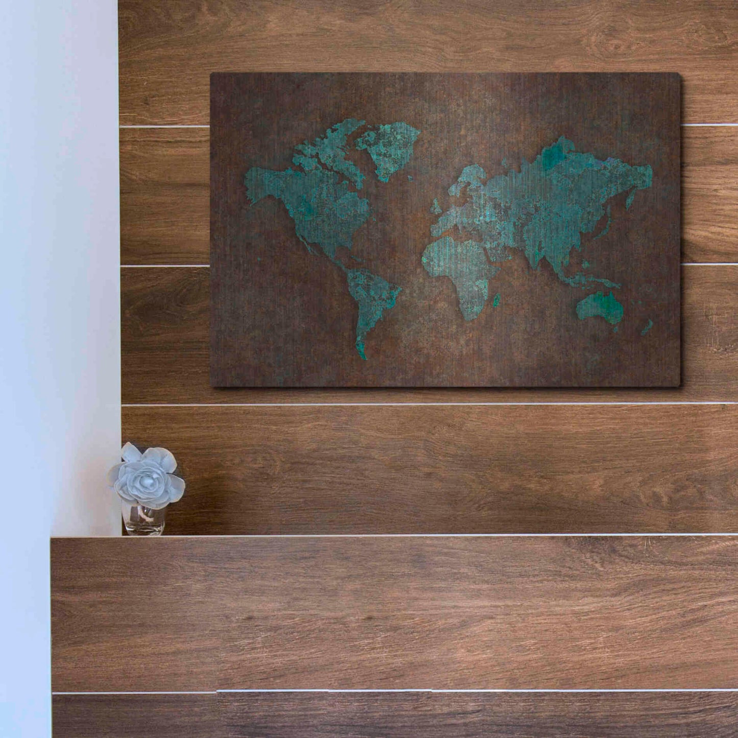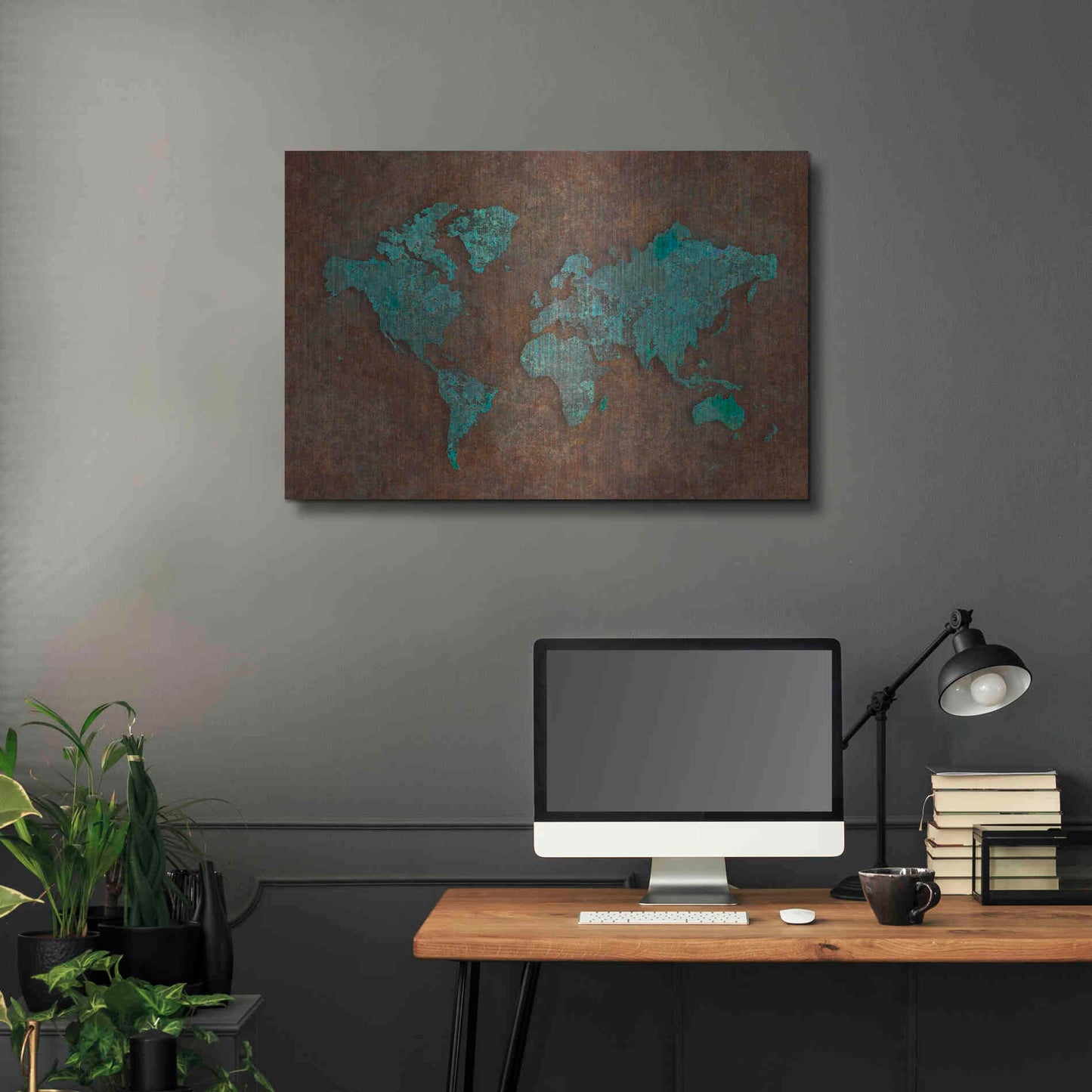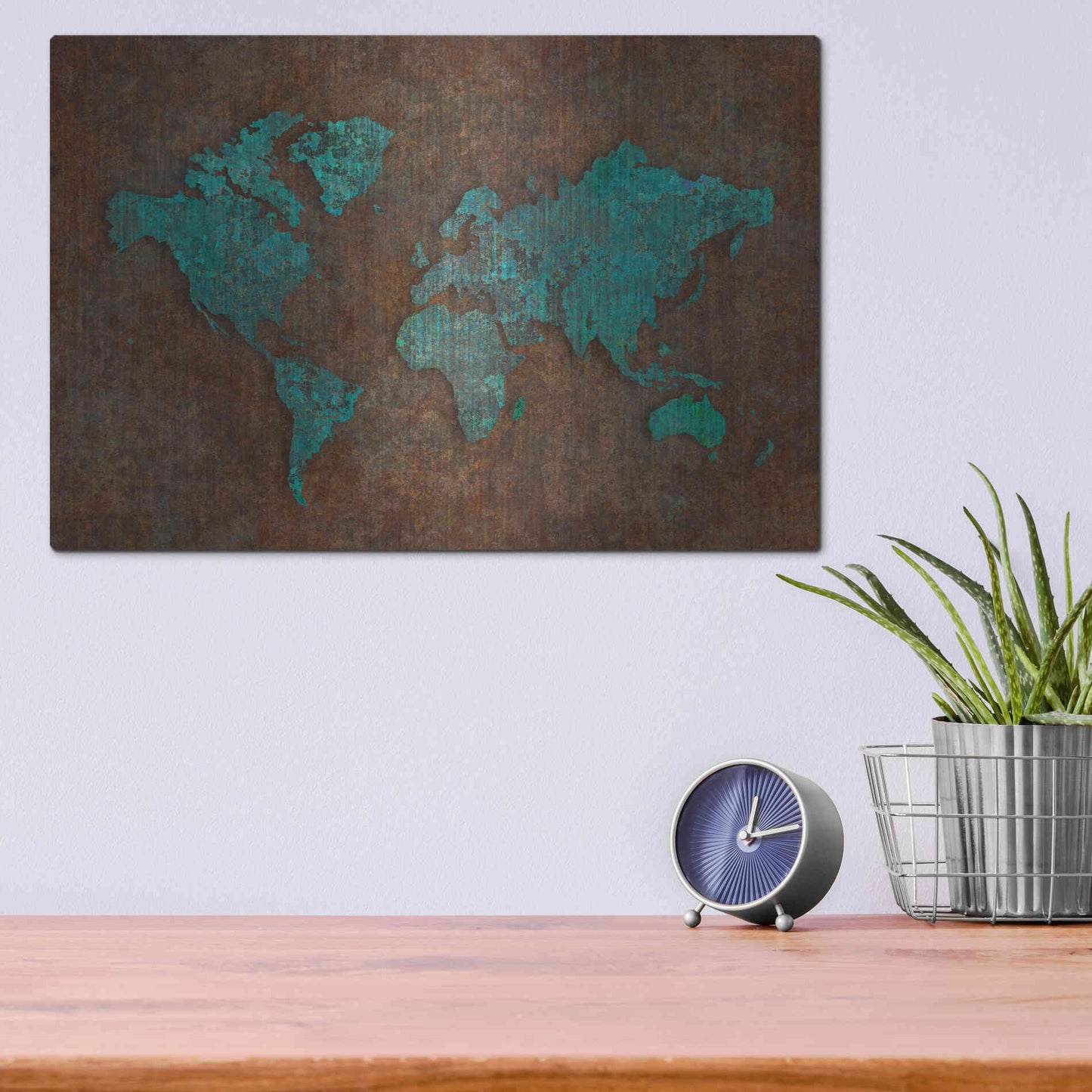 Luxe Metal Art 'Rusted World' by Andrea Haase, Metal Wall Art. Featuring rusty metal surfac with world map silhouette in a tarnished copper metal style .