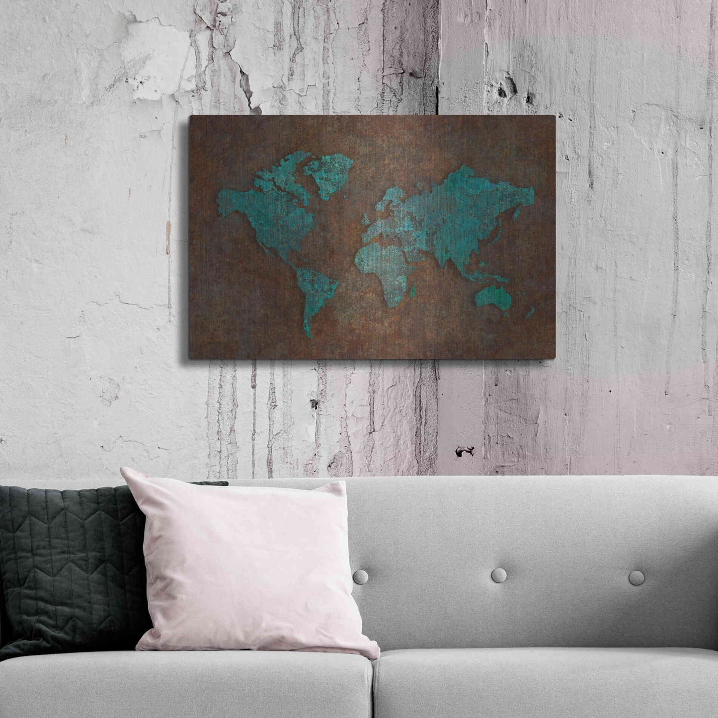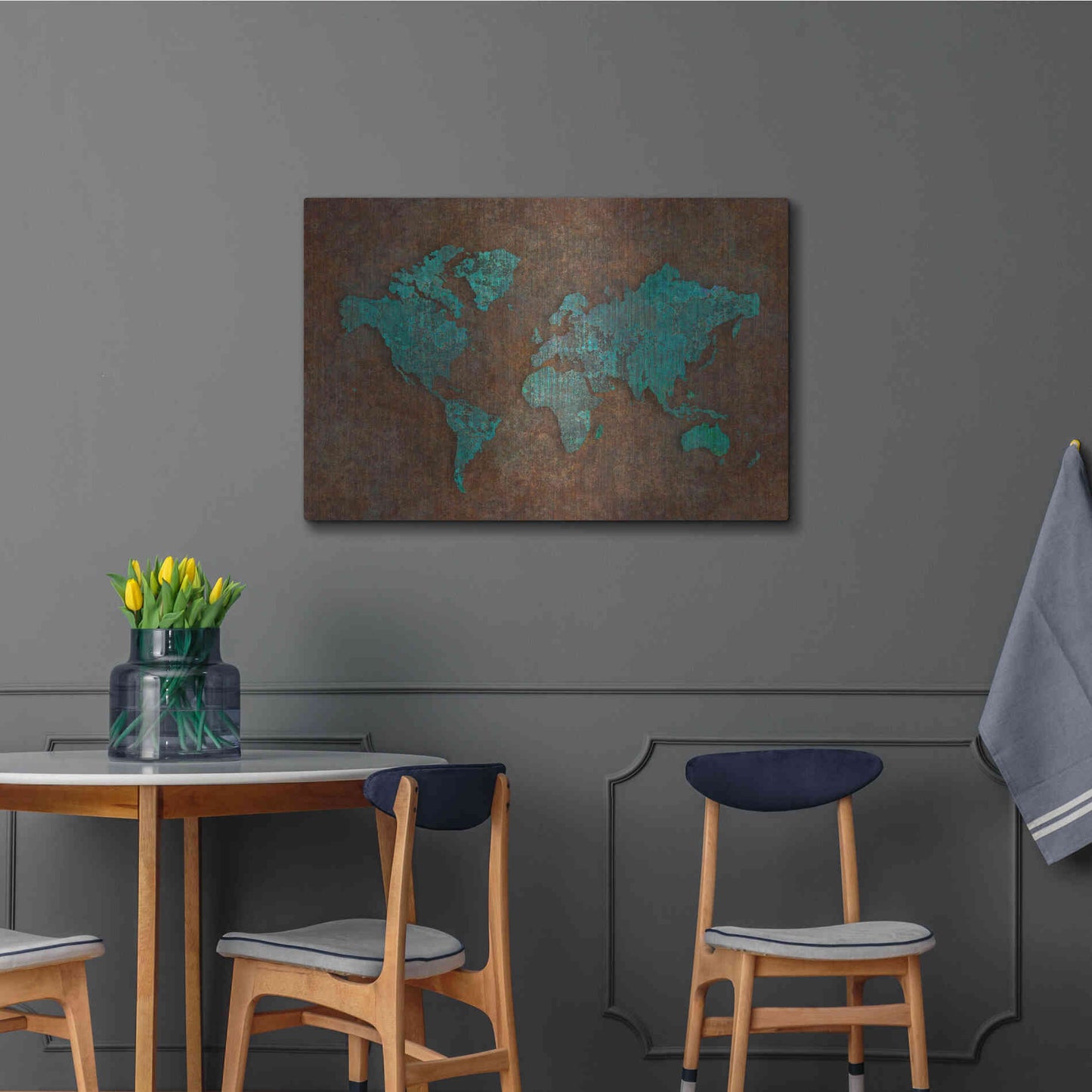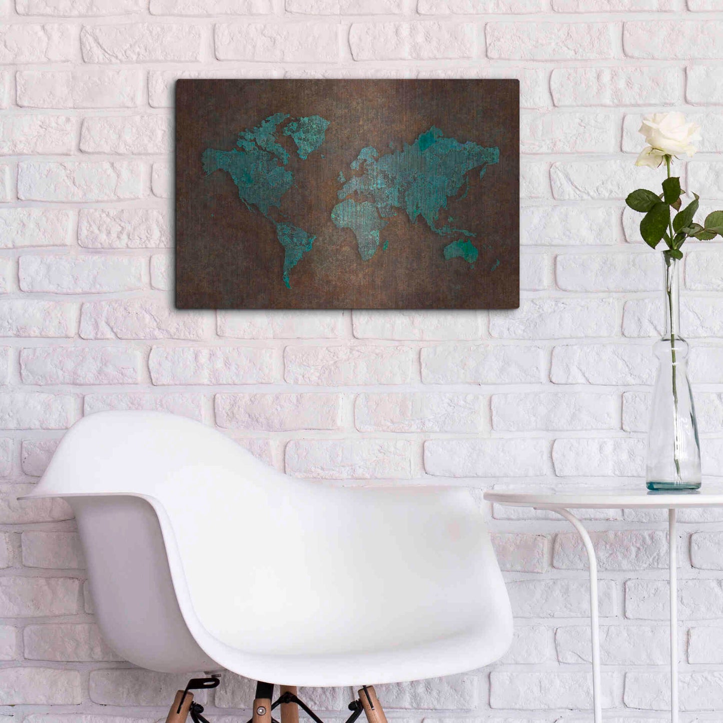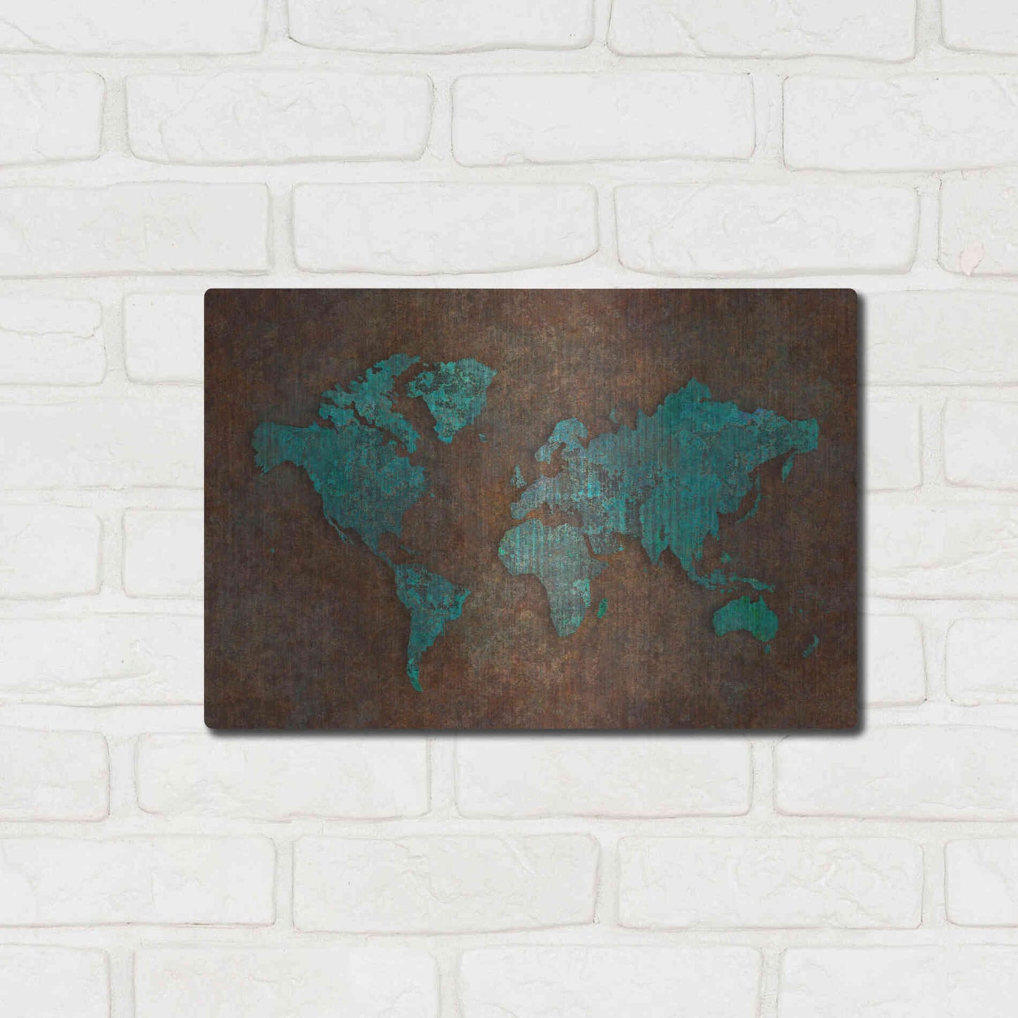 Luxe Metal Art 'Rusted World' by Andrea Haase, Metal Wall Art. Featuring rusty metal surfac with world map silhouette in a tarnished copper metal style .
