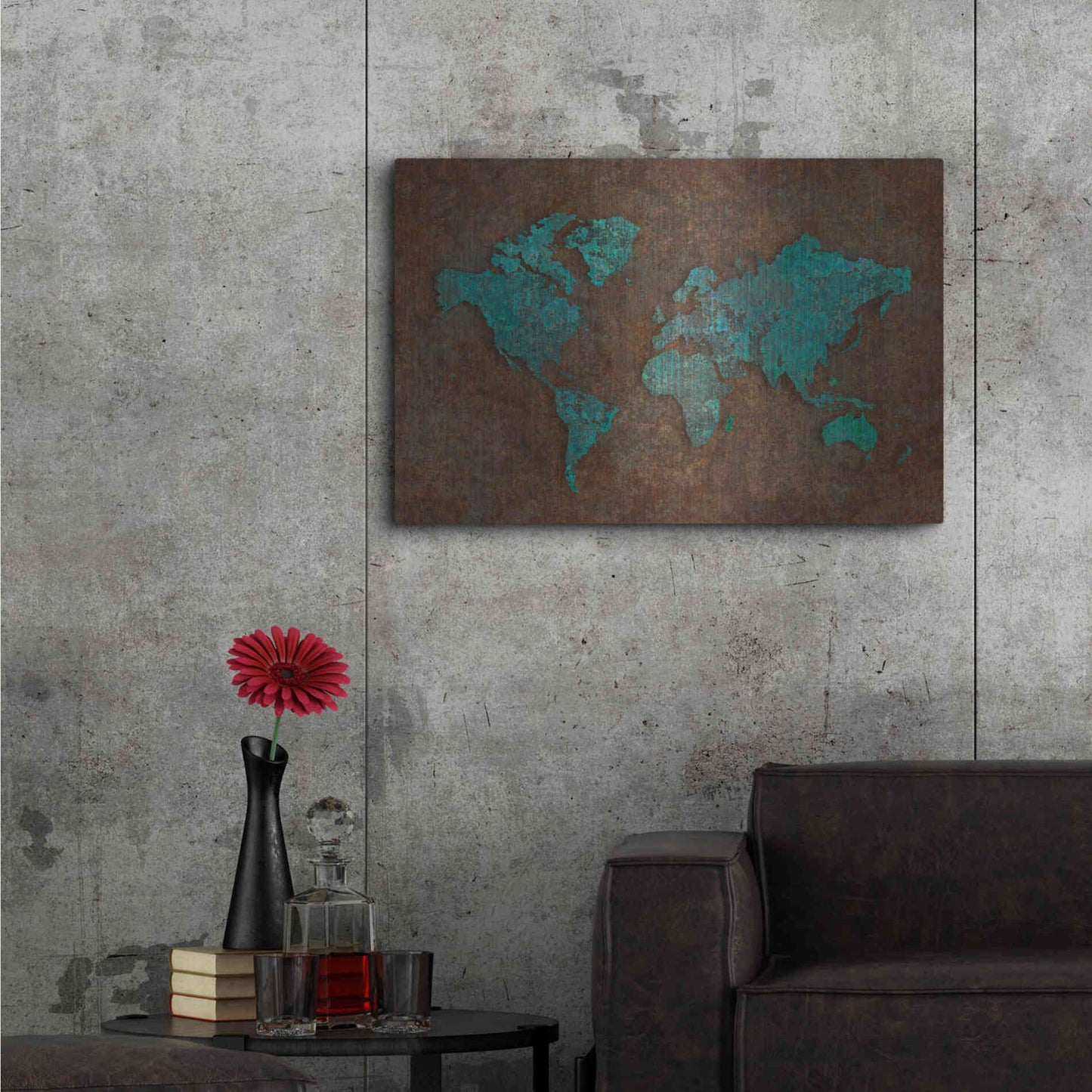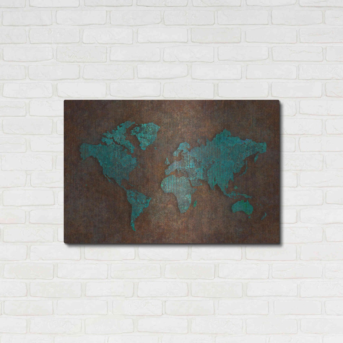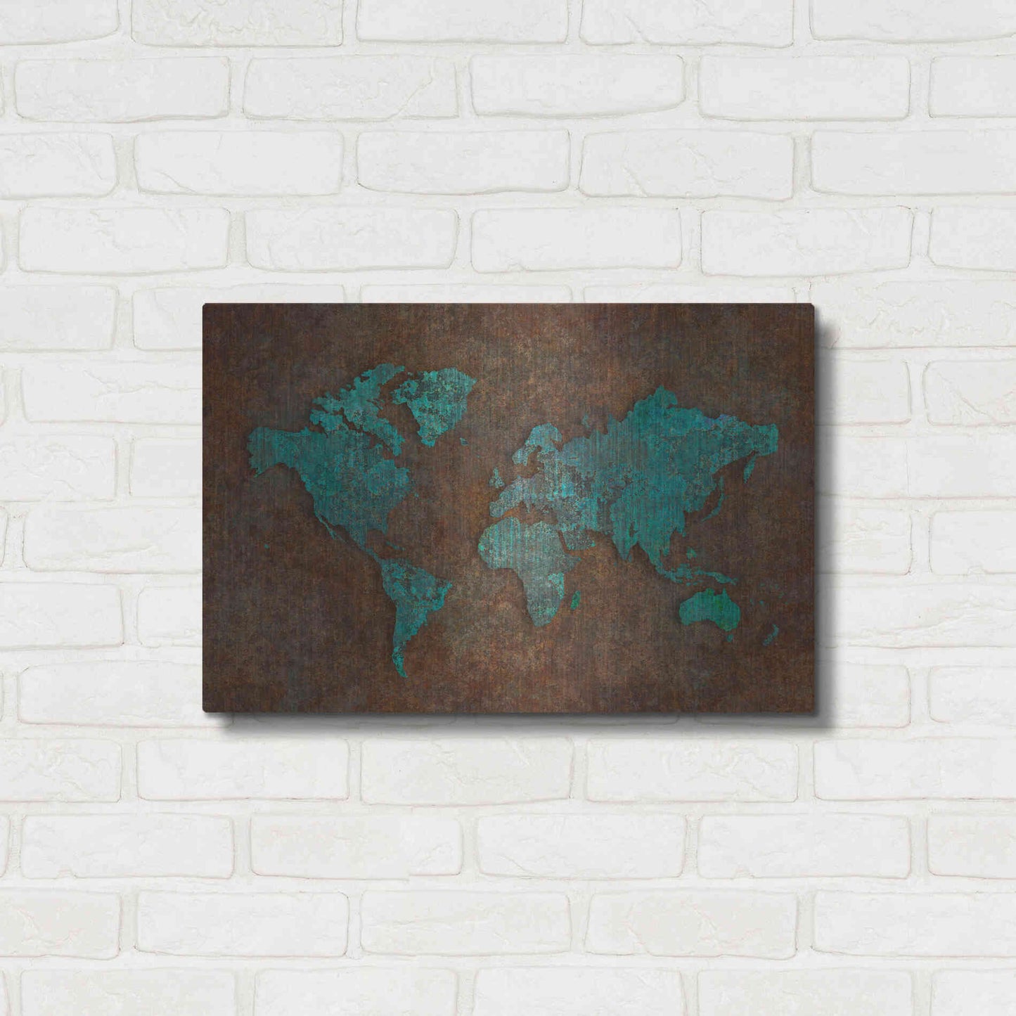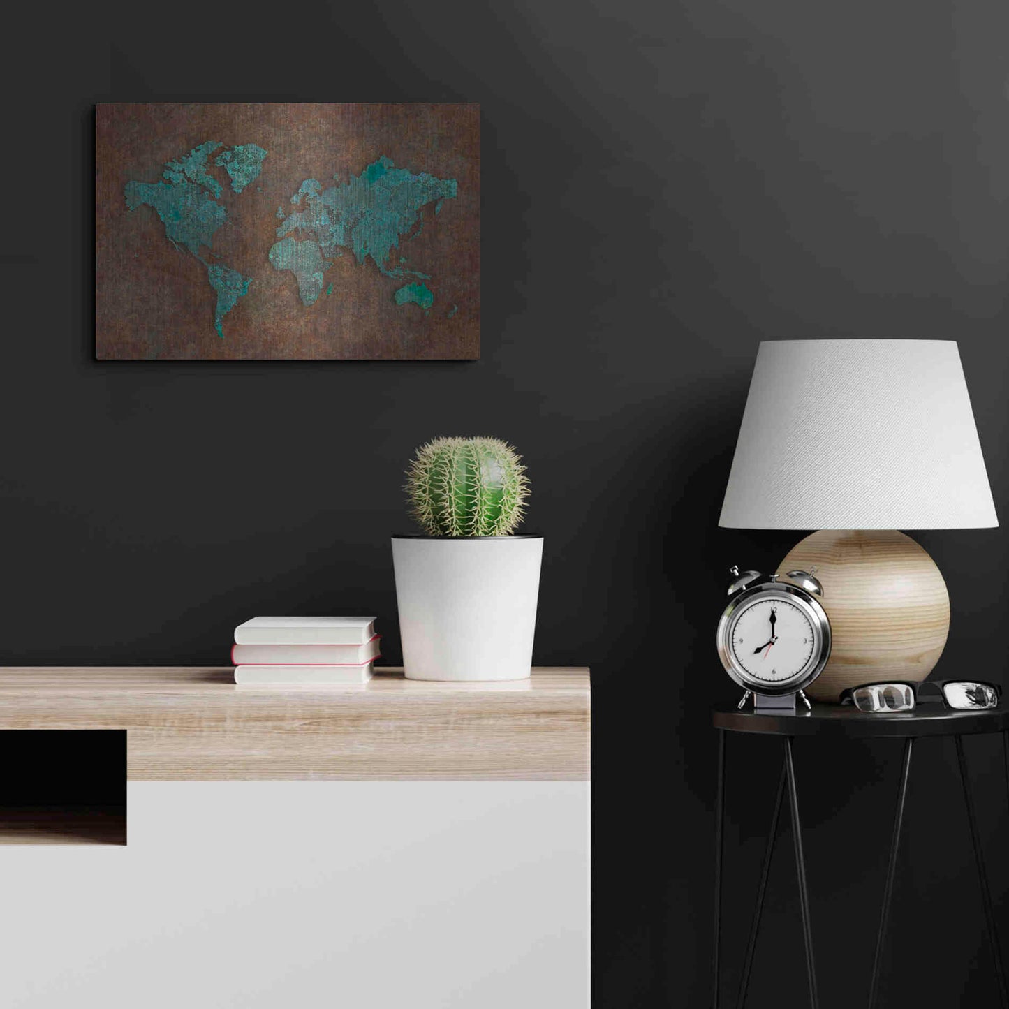 Luxe Metal Art 'Rusted World' by Andrea Haase, Metal Wall Art. Featuring rusty metal surfac with world map silhouette in a tarnished copper metal style .