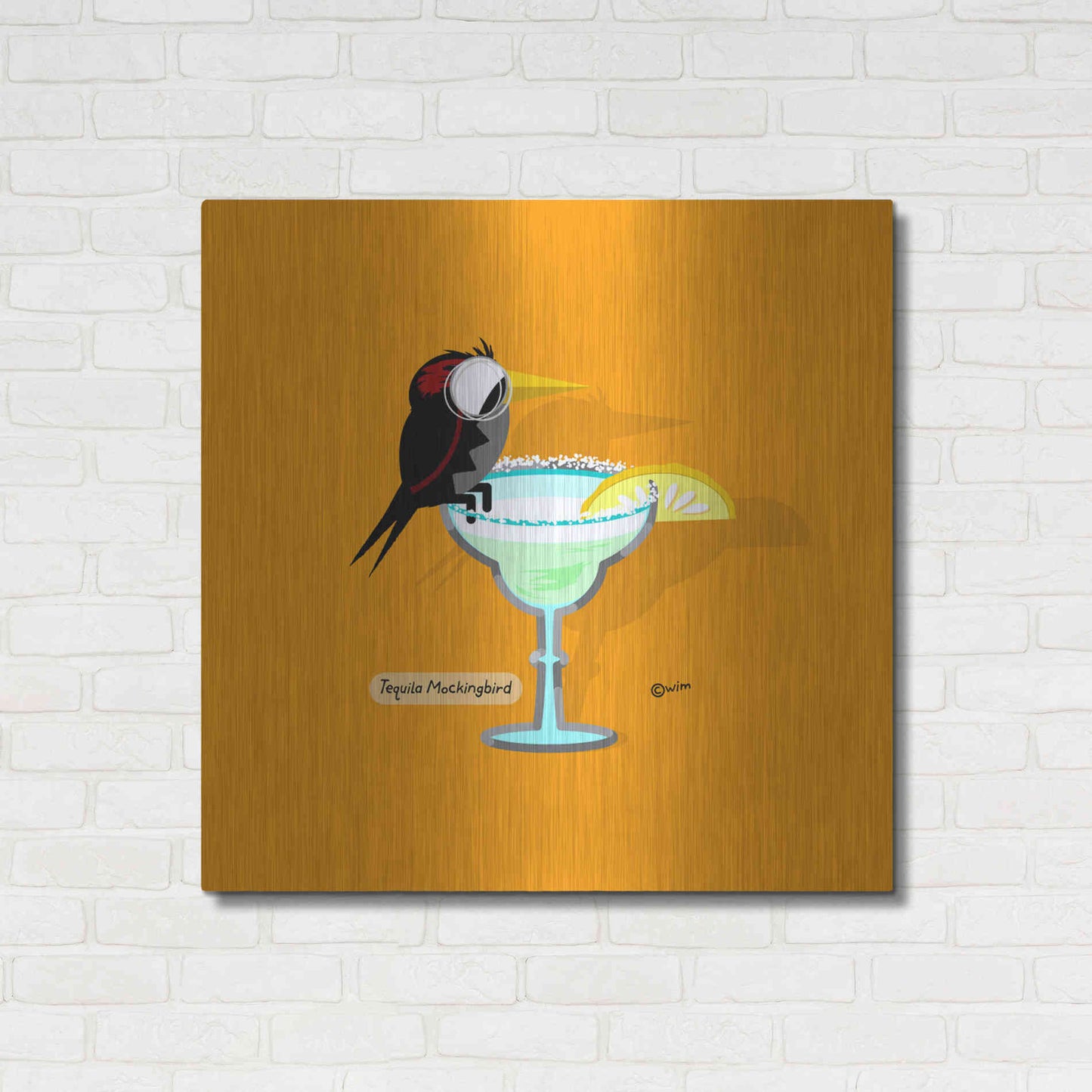 "Tequila Mockingbird" by Chuck Wimmer. Featuring a boozing bird relaxing in a margarita glass. This art piece is great for a wet bar, kitchen, or as a housewarming gift. Chuck Wimmer creates comical animal prints incorporating puns and whimsical humor. All images are hand-drawn by computer using a tablet. Bring a touch of something unique with Aluminum Wall Art from Luxe Metal Art for your home or business. UV Printed on 1/4 inch brushed aluminum panel and arrives ready to hang right out of the box. The shimmer of the natural aluminum gives the art a truly unique feel that can't be duplicated. Floating just over half an inch of the wall your frameless art piece will feel light and airy and truly pop.