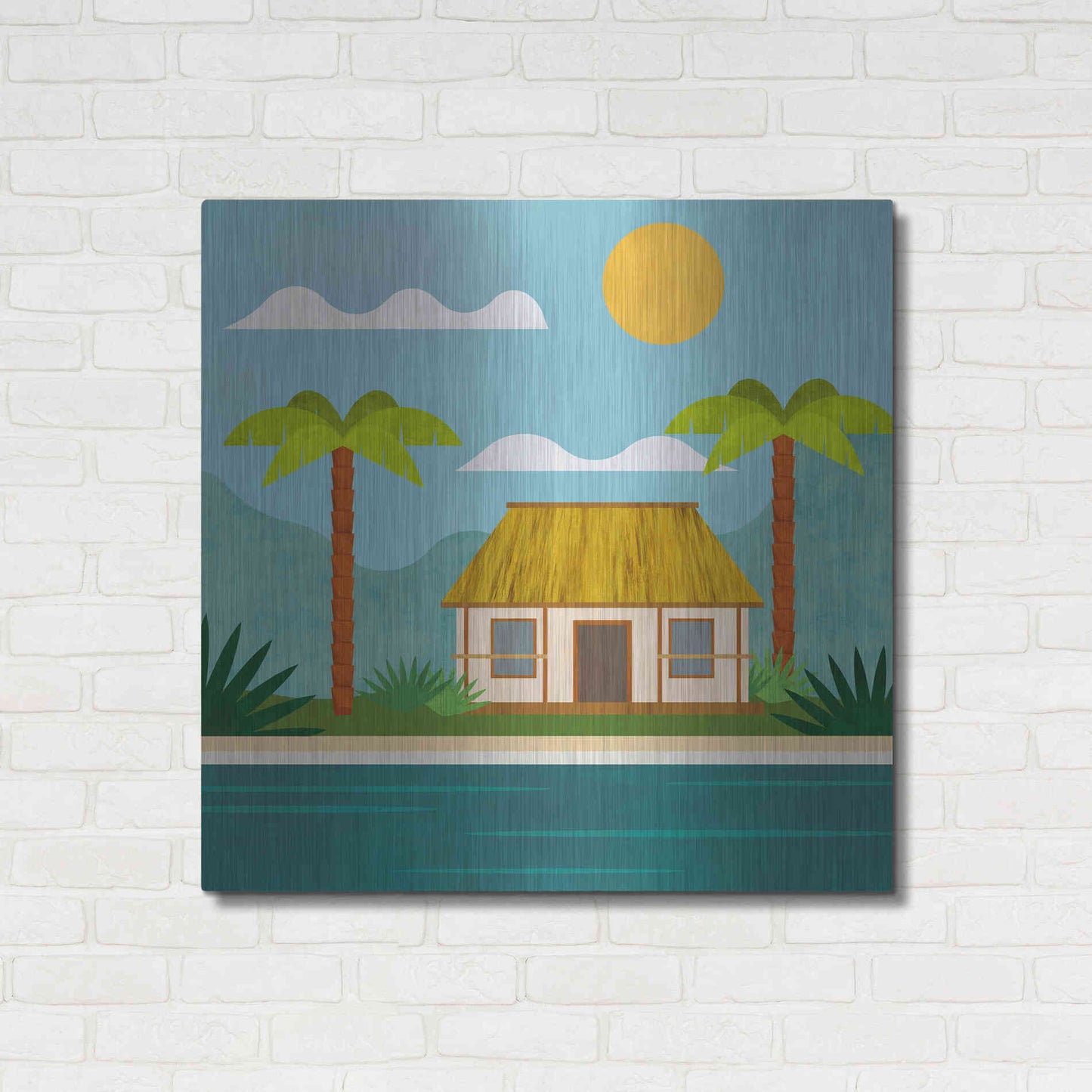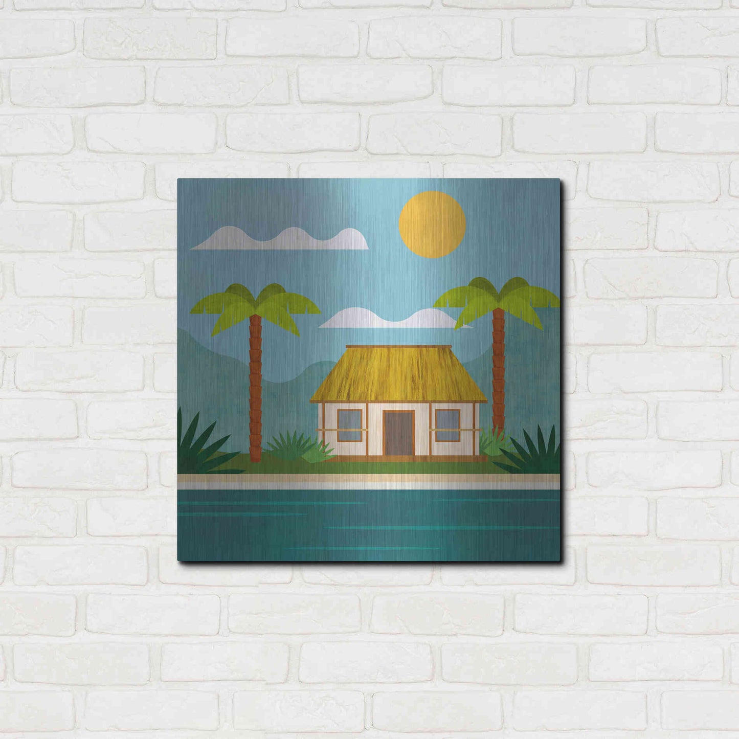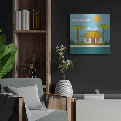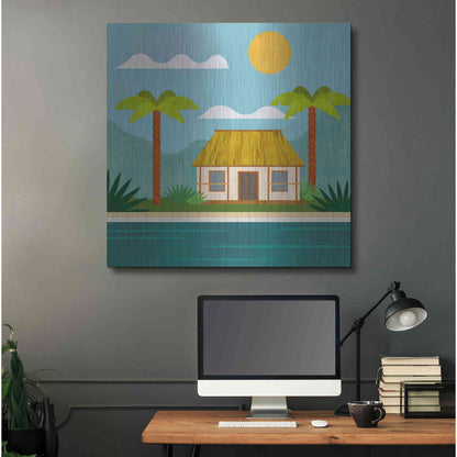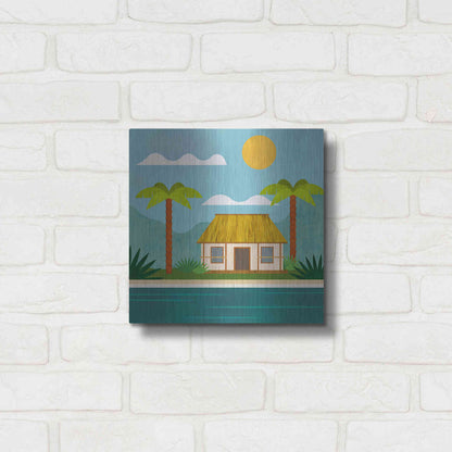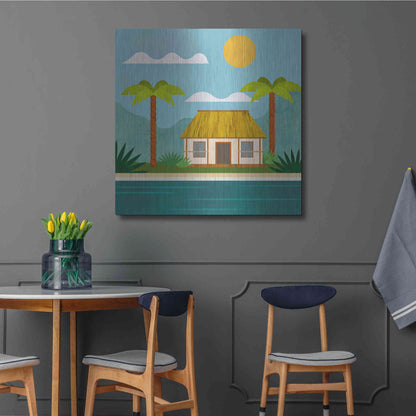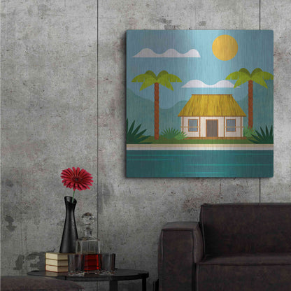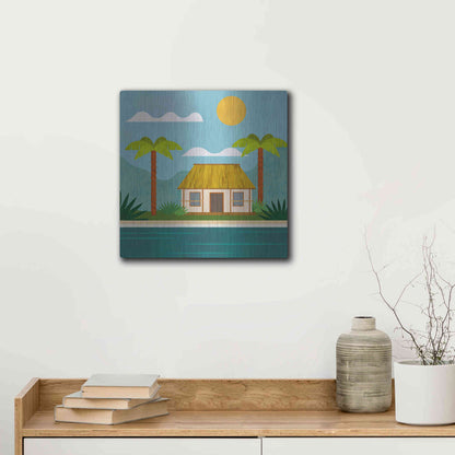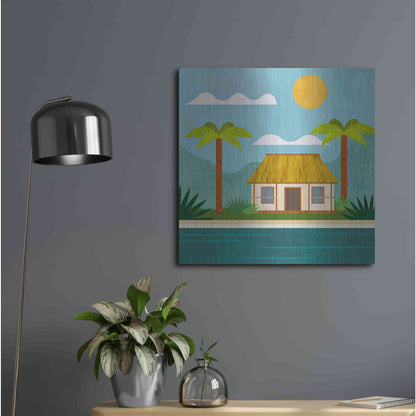 Luxe Metal Art 'Tropical Island Hideaway' by Andrea Haase, Metal Wall Art. Featuring peaceful, idyllic tropical scenery with little beach house at the ocean and palm trees in minimalist graphics with light texture .