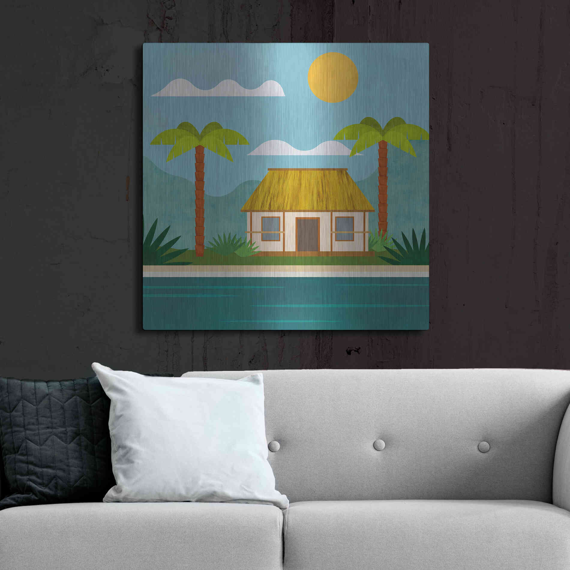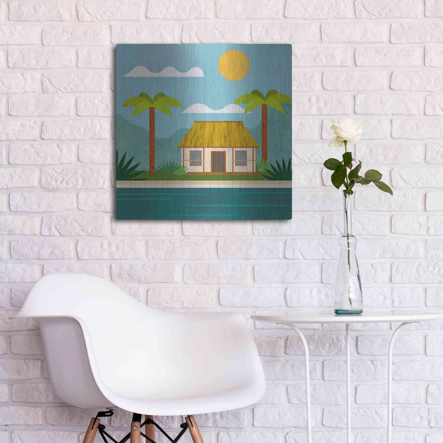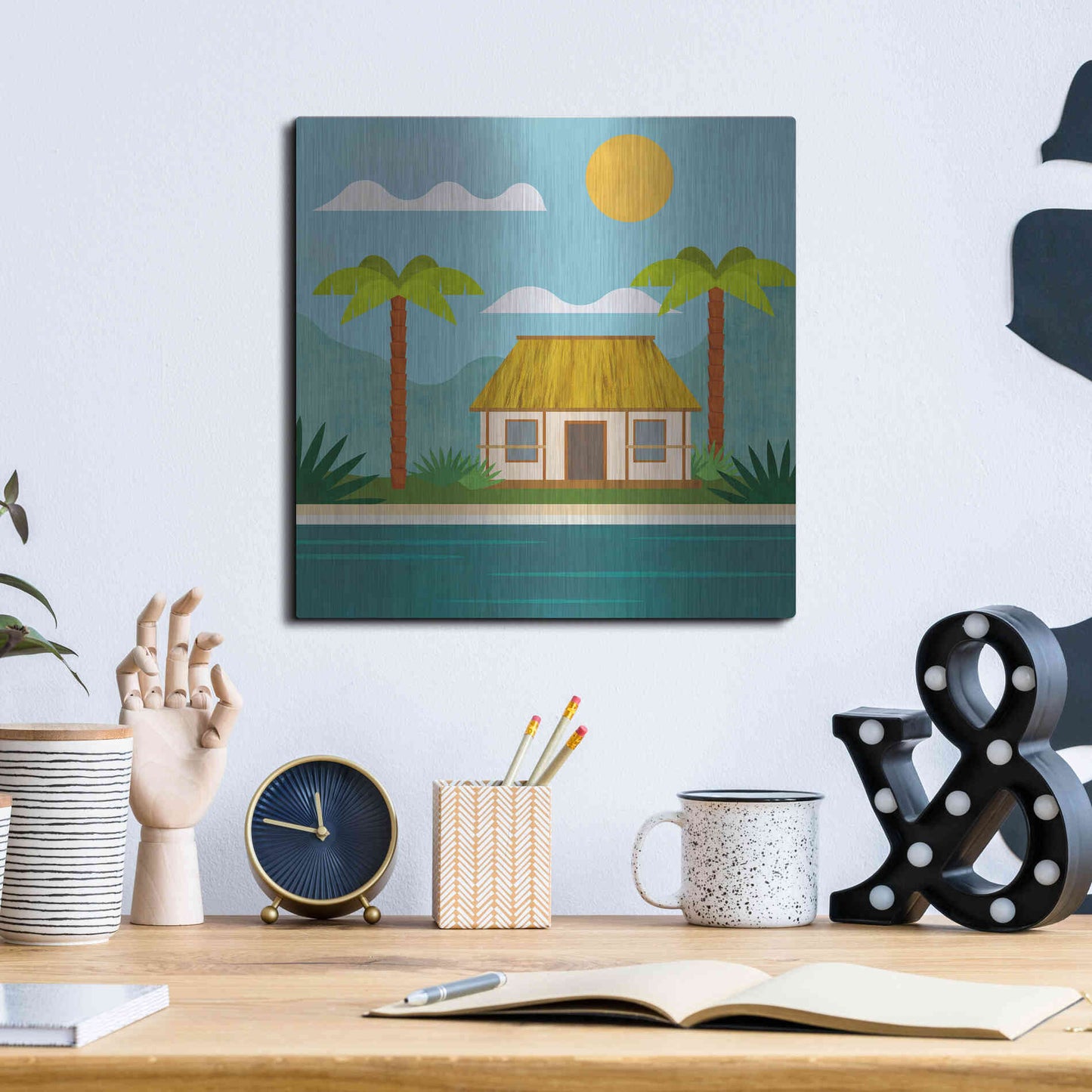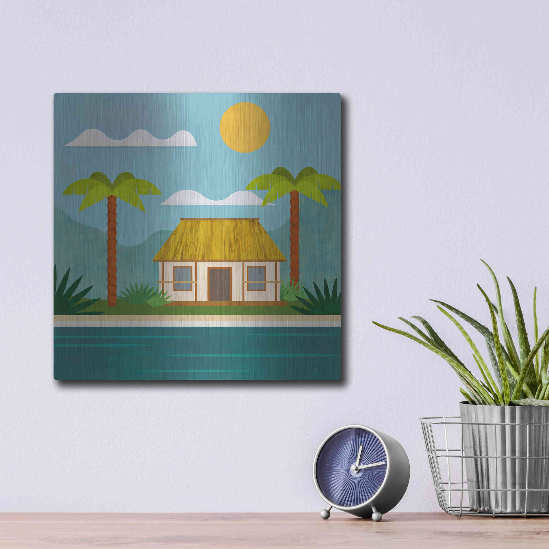 Luxe Metal Art 'Tropical Island Hideaway' by Andrea Haase, Metal Wall Art. Featuring peaceful, idyllic tropical scenery with little beach house at the ocean and palm trees in minimalist graphics with light texture .
