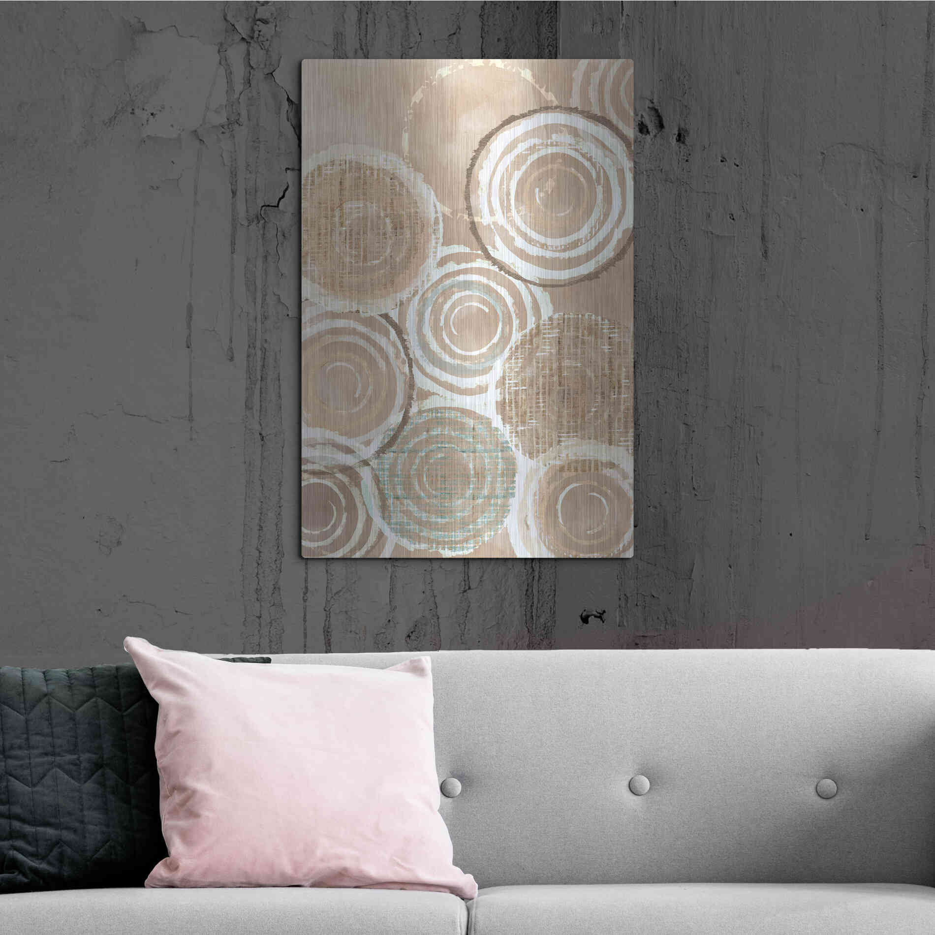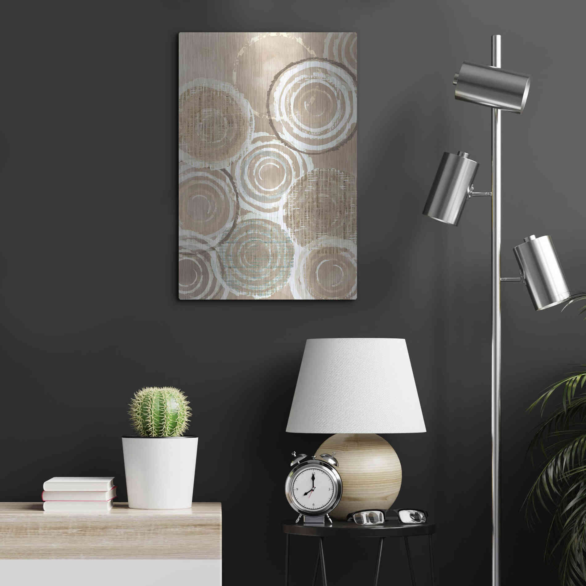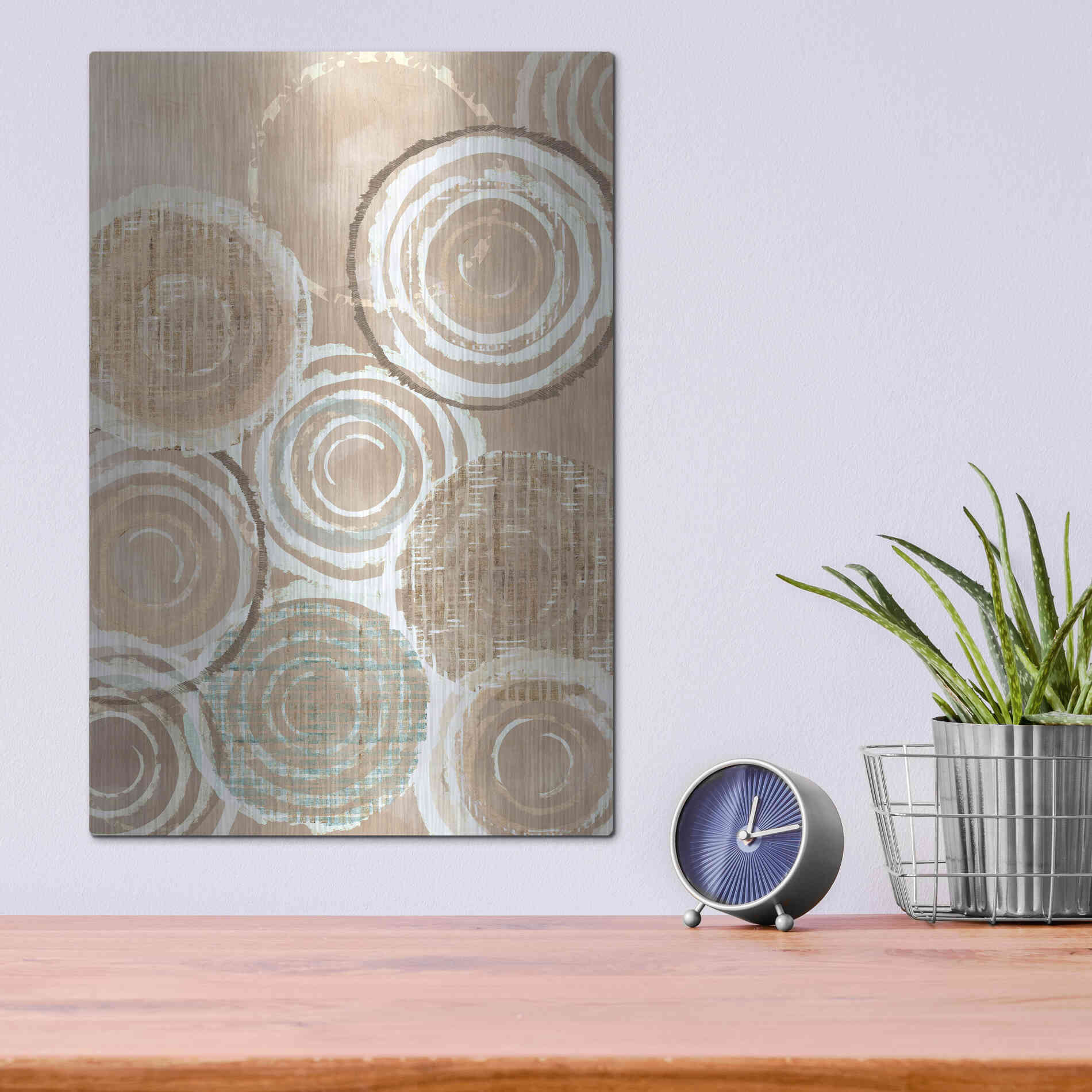 Woven Baskets IV' by Flora Kouta Metal Wall Art. Brown and cream abstract painting inspired by rattan and wicker lamps and baskets