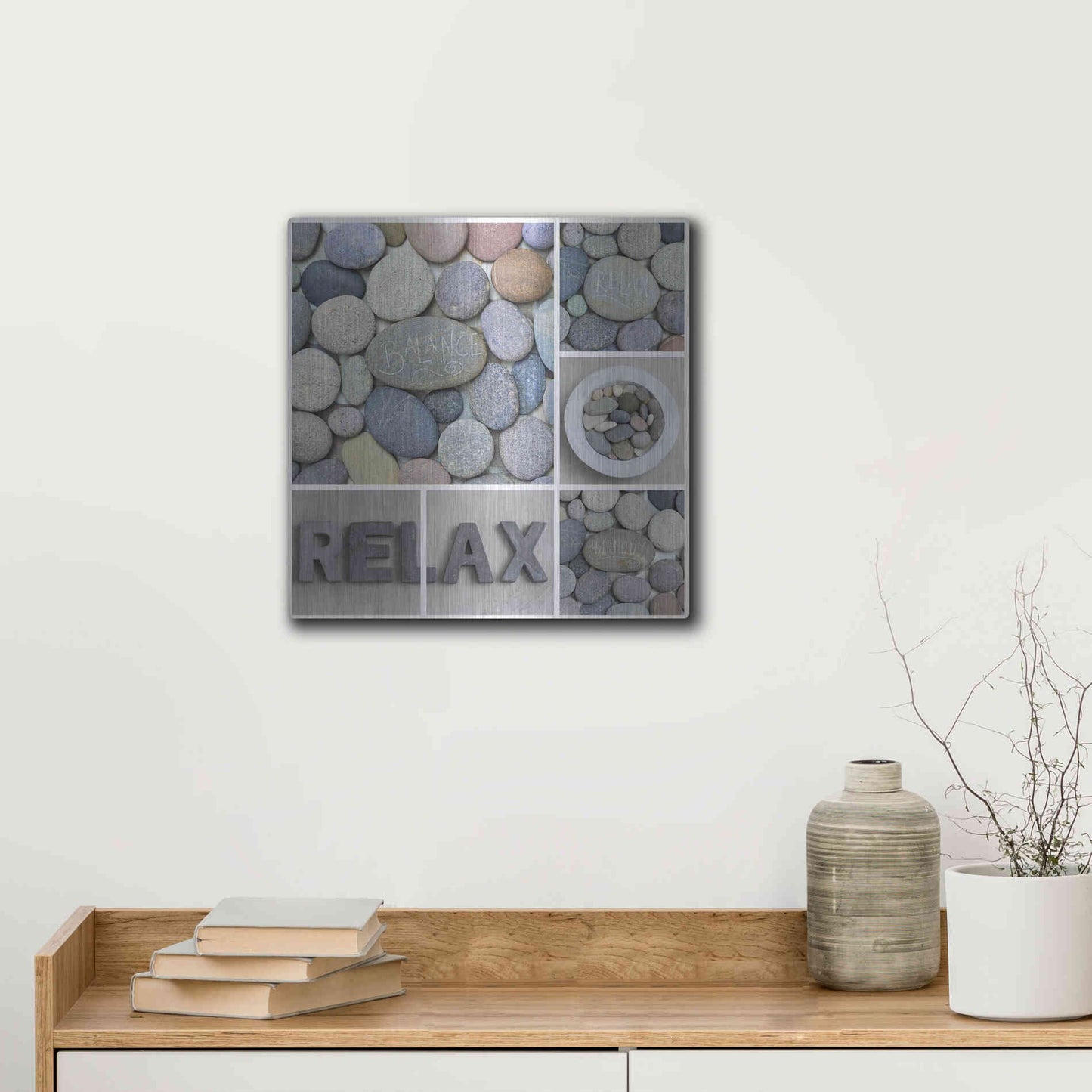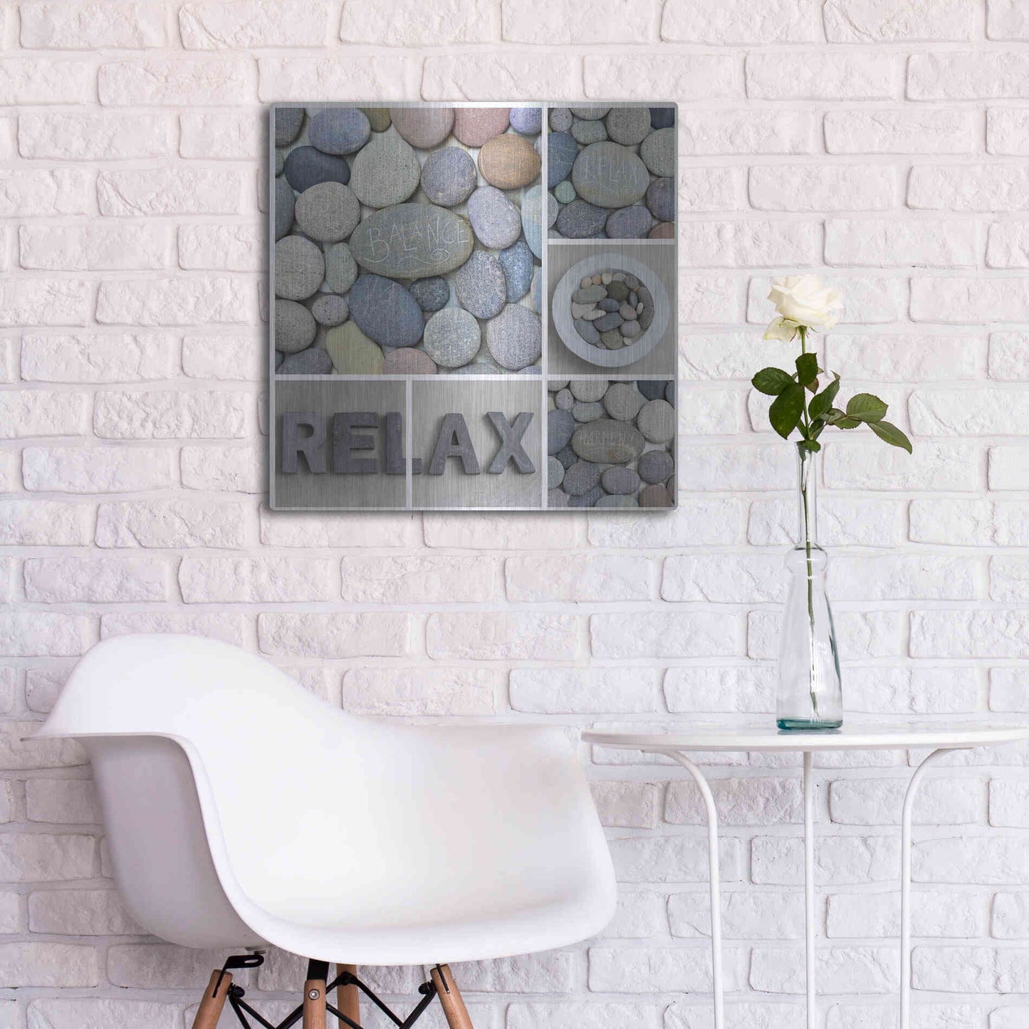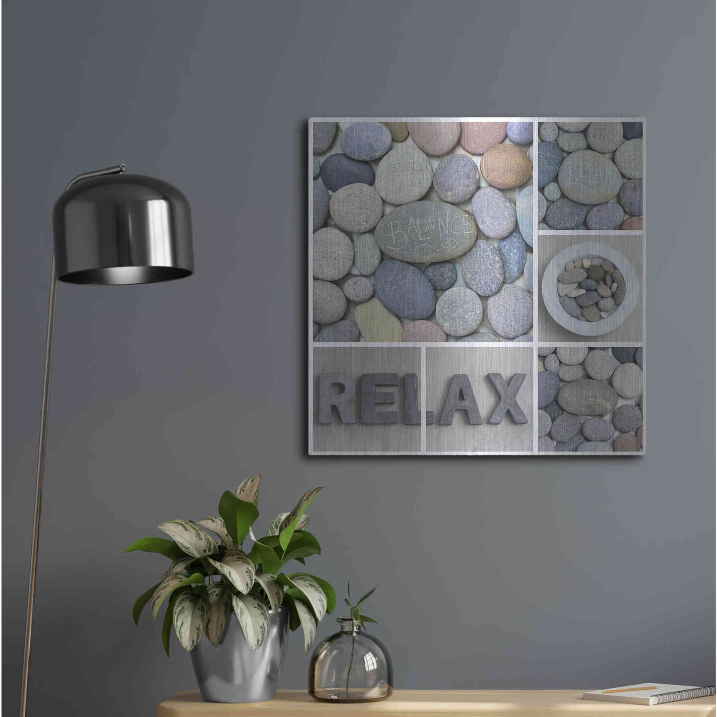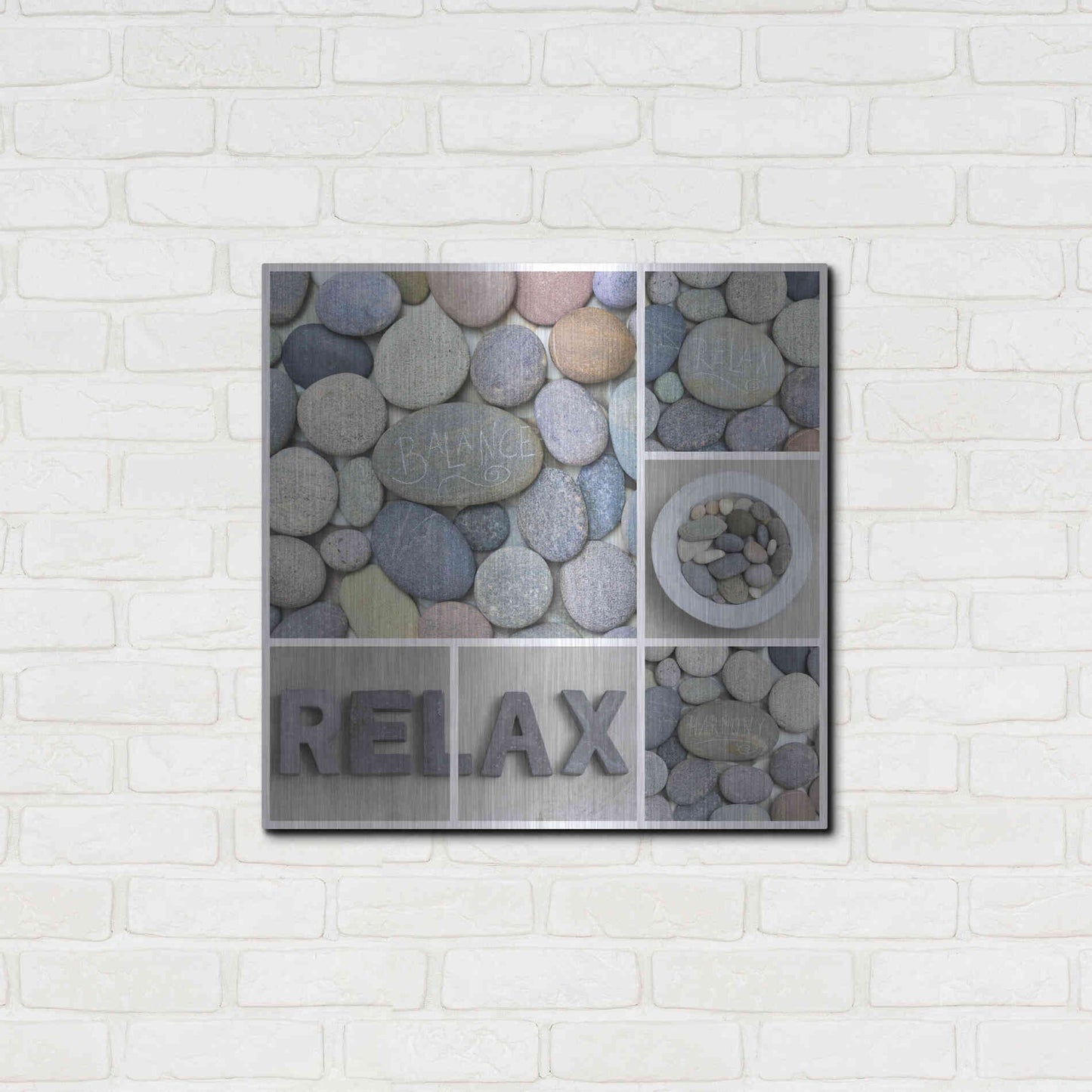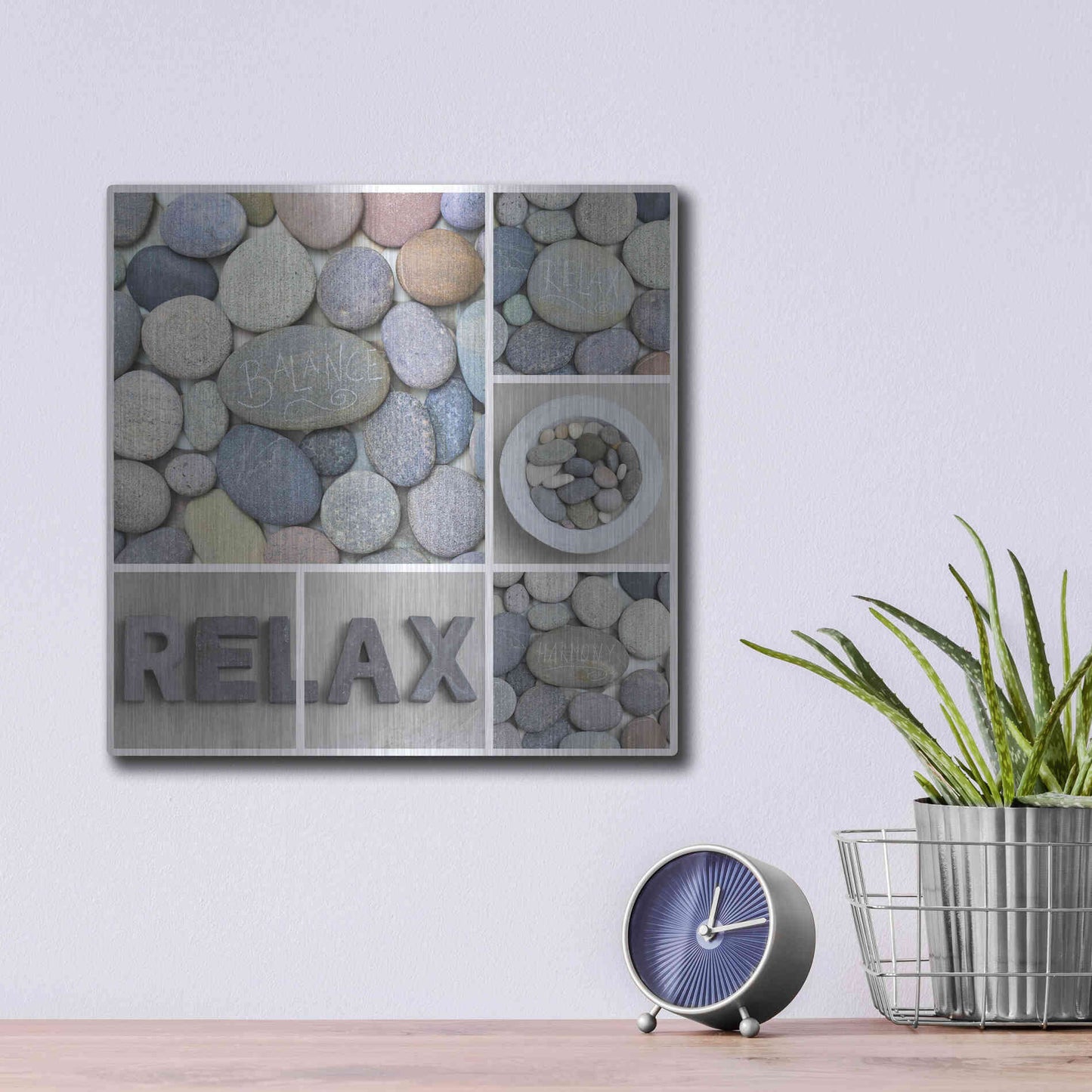 Luxe Metal Art 'Zen Pebble Relax Collage' by Andrea Haase, Metal Wall Art. Featuring minimalistic still life collage with pebble and words relax and balance .