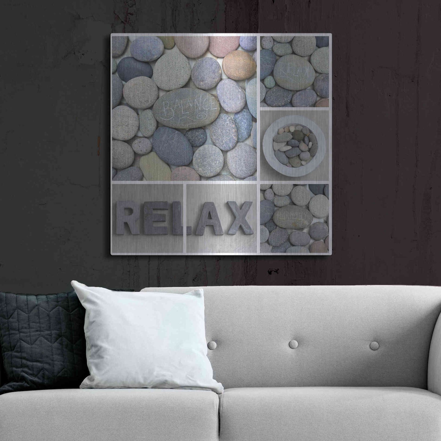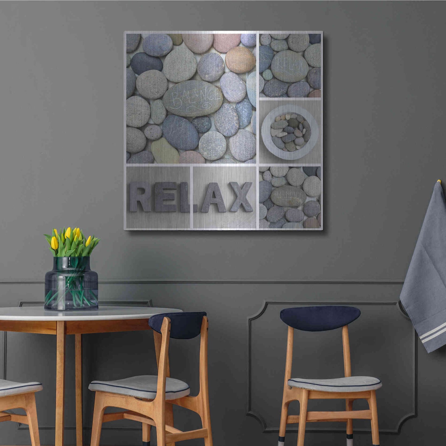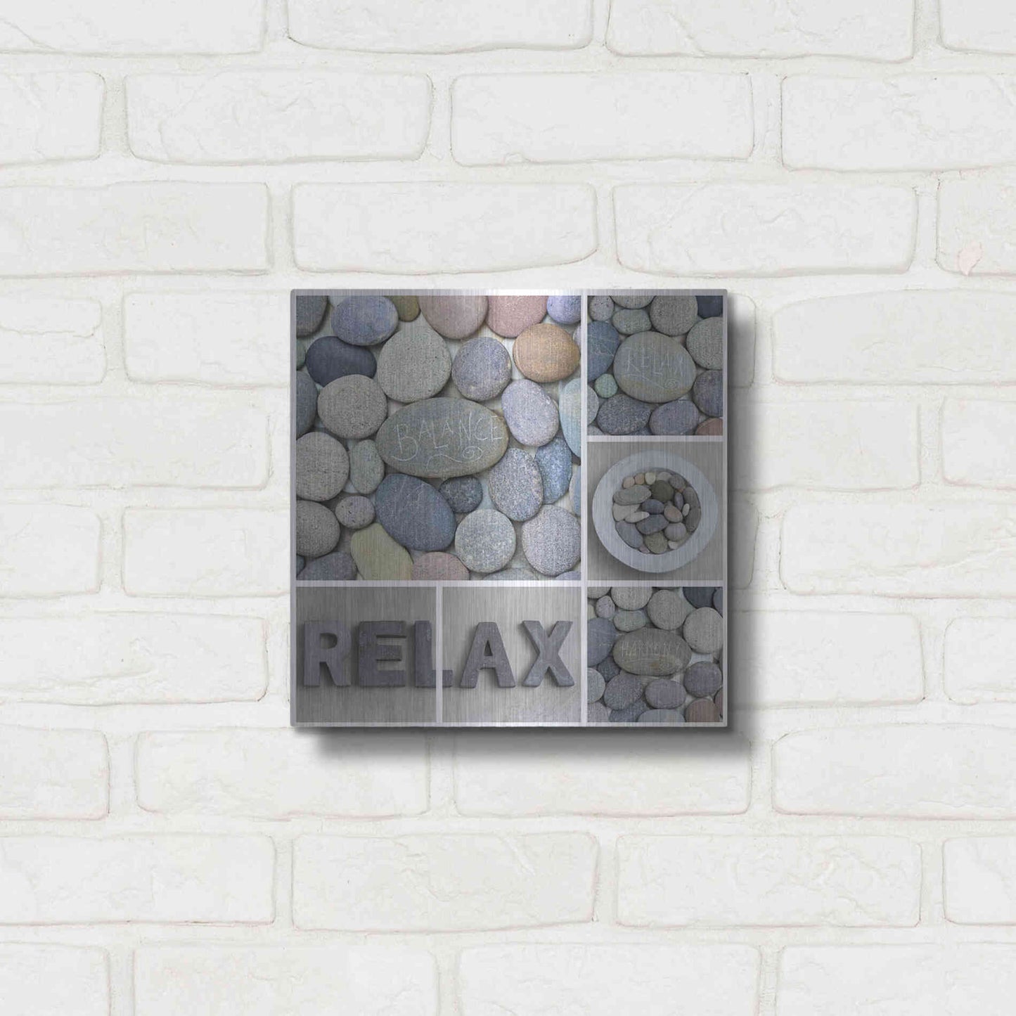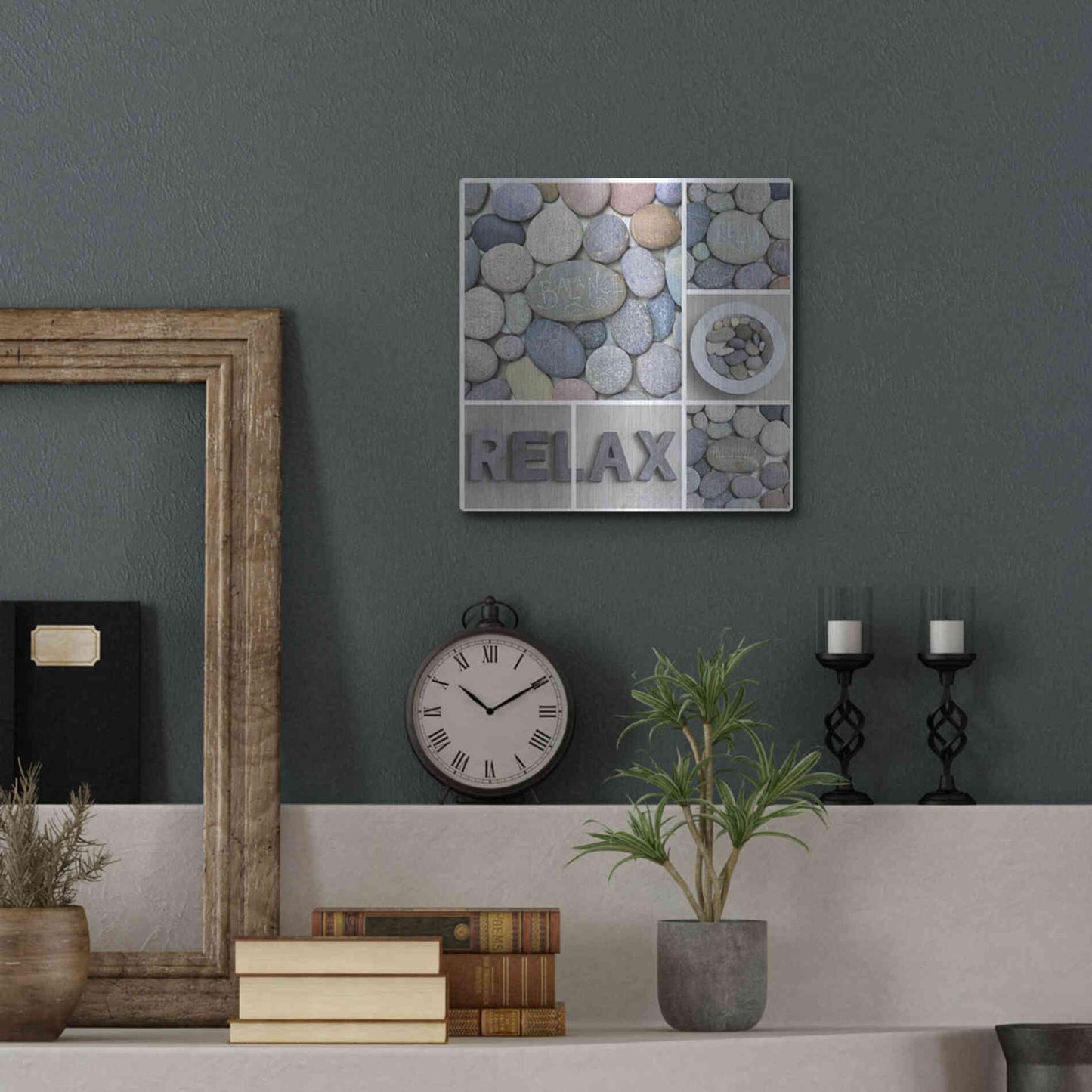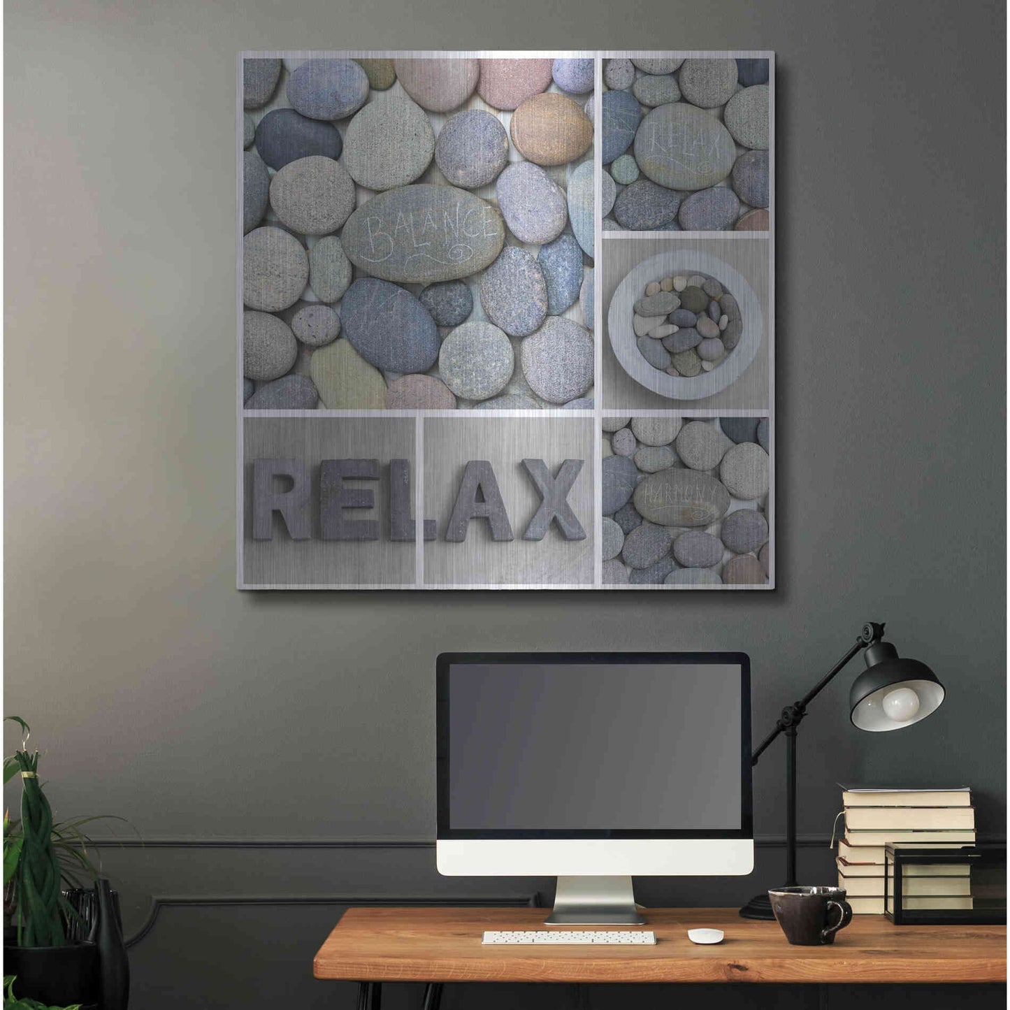 Luxe Metal Art 'Zen Pebble Relax Collage' by Andrea Haase, Metal Wall Art. Featuring minimalistic still life collage with pebble and words relax and balance .
